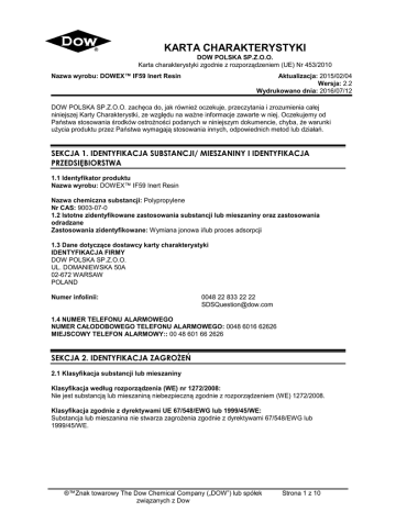 KARTA CHARAKTERYSTYKI DOW POLSKA SP.Z.O.O. Karta charakterystyki zgodnie z rozporządzeniem (UE) Nr 453/2010 Nazwa wyrobu: DOWEX™ IF59 Inert Resin Aktualizacja: 2015/02/04 Wersja: 2.2 Wydrukowano dnia: 2016/07/12 DOW POLSKA SP.Z.O.O. zachęca do, jak również oczekuje, przeczytania i zrozumienia całej niniejszej Karty Charakterystki, ze względu na ważne informacje zawarte w niej. Oczekujemy od Państwa stosowania środków ostrożności podanych w niniejszym dokumencie, chyba, że warunki użycia produktu przez Państwa wymagają stosowania innych, odpowiednich metod lub działań. SEKCJA 1. IDENTYFIKACJA SUBSTANCJI/ MIESZANINY I IDENTYFIKACJA PRZEDSIĘBIORSTWA 1.1 Identyfikator produktu Nazwa wyrobu: DOWEX™ IF59 Inert Resin Nazwa chemiczna substancji: Polypropylene Nr CAS: 9003-07-0 1.2 Istotne zidentyfikowane zastosowania substancji lub mieszaniny oraz zastosowania odradzane Zastosowania zidentyfikowane: Wymiana jonowa i/lub proces adsorpcji 1.3 Dane dotyczące dostawcy karty charakterystyki IDENTYFIKACJA FIRMY DOW POLSKA SP.Z.O.O. UL. DOMANIEWSKA 50A 02-672 WARSAW POLAND Numer infolinii: 0048 22 833 22 22 [email protected] 1.4 NUMER TELEFONU ALARMOWEGO NUMER CAŁODOBOWEGO TELEFONU ALARMOWEGO: 0048 6016 62626 MIEJSCOWY TELEFON ALARMOWY:: 00 48 601 66 2626 SEKCJA 2. IDENTYFIKACJA ZAGROŻEŃ 2.1 Klasyfikacja substancji lub mieszaniny Klasyfikacja według rozporządzenia (WE) nr 1272/2008: Nie jest substancją lub mieszaniną niebezpieczną zgodnie z rozporządzeniem (WE) 1272/2008. Klasyfikacja zgodnie z dyrektywami UE 67/548/EWG lub 1999/45/WE: Substancja lub mieszanina nie stwarza zagrożenia zgodnie z dyrektywami 67/548/EWG lub 1999/45/WE. ®™Znak towarowy The Dow Chemical Company („DOW”) lub spółek związanych z Dow Strona 1 z 10 Nazwa wyrobu: DOWEX™ IF59 Inert Resin Aktualizacja: 2015/02/04 Wersja: 2.2 2.2 Elementy oznakowania Oznakowanie zgodnie z rozporządzeniem (WE) nr 1272/2008 [CLP / GHS]: Nie jest substancją lub mieszaniną niebezpieczną zgodnie z rozporządzeniem (WE) 1272/2008. 2.3 Inne zagrożenia brak dostępnych danych SEKCJA 3. SKŁAD/ INFORMACJA O SKŁADNIKACH 3.1 substancja Produkt jest substancją. Produkt nie zawiera, w stężeniach równych lub większych niż podane w rozporządzeniu (WE) nr 453/2010, żadnych substancji stanowiących zagrożenie dla zdrowia lub środowiska i żadnych substancji, dla których określono wspólnotowe wartości graniczne narażenia w miejscu pracy. SEKCJA 4. ŚRODKI PIERWSZEJ POMOCY 4.1 Opis środków pierwszej pomocy Kontakt przez skórę: Umyć wodą z mydłem. Jeśli utrzymują się podrażnienia skóry, wezwać lekarza. Kontakt z oczami: Przepłukać obficie wodą. Jeśli podrażnienie oczu utrzymuje się, skonsultować się ze specjalistą. 4.2 Najważniejsze ostre i opóźnione objawy oraz skutki narażenia: Oprócz informacji podanych w Opisie środków pierwszej pomocy (powyżej) oraz Wskazań natychmiastowej pomocy lekarskiej i szczególnego postępowania z poszkodowanym (poniżej), wszelkie dodatkowe istotne objawy i skutki opisane są w rozdziale 11: Informacje toksykologiczne. 4.3 Wskazania dotyczące wszelkiej natychmiastowej pomocy lekarskiej i szczególnego postępowania z poszkodowanym Uwagi dla lekarza: Leczenie podtrzymujące, oparte na ocenie dokonanej przez lekarza na podstawie reakcji pacjenta. SEKCJA 5. POSTĘPOWANIE W PRZYPADKU POŻARU 5.1 Środki gaśnicze Odpowiednie środki gaśnicze: Do zwalczania pożarów z udziałem tego materiału stosować następujące środki gaśnicze: Aerozol wodny Piana Dwutlenek węgla (CO2) Suche proszki gaśnicze Niewłaściwe środki gaśnicze: brak dostępnych danych 5.2 Szczególne zagrożenia związane z substancją lub mieszaniną Niebezpieczne produkty spalania: brak dostępnych danych Strona 2 z 10 Nazwa wyrobu: DOWEX™ IF59 Inert Resin Aktualizacja: 2015/02/04 Wersja: 2.2 Zwiększone niebezpieczeństwo pożaru i wybuchu: Chłodzić zamknięte zbiorniki narażone na ogień poprzez zraszanie wodą. Narażenie na działanie produktów rozkładu może zagrażać zdrowiu. Pyły w odpowiednich stężeniach mogą tworzyć wybuchowe mieszaniny z powietrzem. 5.3 Informacje dla straży pożarnej Procedury przeciwpożarowe: Pozostać pod wiatr. Unikać wdychania dymu. Specjalny sprzęt ochronny dla strażaków: W razie pożaru, założyć aparat oddechowy z zamkniętym obiegiem powietrza. SEKCJA 6. POSTĘPOWANIE W PRZYPADKU NIEZAMIERZONEGO UWOLNIENIA DO ŚRODOWISKA 6.1 Indywidualne środki ostrożności, wyposażenie ochronne i procedury w sytuacjach awaryjnych: W czasie likwidacji wycieku materiału należy stosować odpowiednie wyposażenie ochronne. Zalecenia znajdują się w SEKCJI 8, "Kontrola narażenia/środki ochrony indywidualnej". W przypadku narażenia na materiał w czasie uprzątania zapoznać się z informacjami w SEKCJI 4, Pierwsza pomoc, dla dalszego postępowania. 6.2 Środki ostrożności w zakresie ochrony środowiska: UWAGA: NIE DOPUŚCIĆ DO PRZEDOSTANIA SIĘ WYCIEKÓWPRODUKTU W POSTACI JAK DOSTARCZONO DO KANALIZACJI KOMUNALNEJ ORAZ OTWARTYCH ZBIORNIKÓW WODNYCH. NIE WPROWADZAĆ POZOSTAŁOŚCI PO CZYSZCZENIU BEZPOŚREDNIO DO OTWARTYCH ZBIORNIKÓW WODNYCH. Zapobiegać przedostaniu się do gleby, rowów, kanalizacji, kanałów żeglownych i/lub wód gruntowych. Patrz część 12 "Informacje ekologiczne". 6.3 Metody i materiały zapobiegające rozprzestrzenianiu się skażenia i służące do usuwania skażenia: Nie dopuszczać osób postronnych. Podłoga może być śliska, zachować ostrożność. Przenieść rozlany materiał do odpowiednich pojemników dla odzysku lub usunięcia. 6.4 Odniesienia do innych sekcji: Odniesienia do innych sekcji, jeżeli dotyczą, zostały przedstawione w poprzednich podrozdziałach. Usunięcie źródeł zapłonu: Przechowywać z dala od źródeł zapłonu. Usuwanie pyłu: Zachować ostrożność, aby ograniczyć wytwarzanie pyłu unoszącego się w powietrzu. SEKCJA 7. POSTĘPOWANIE Z SUBSTANCJAMI I MIESZAN