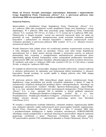 Pismo od Prezesa Zarządu omawiające najważniejsze dokonania i niepowodzenia Grupy Kapitałowej Firmy Chemicznej „Dwory” S.A. w pierwszym półroczu roku obrotowego 2006 oraz perspektywy rozwoju na najbliższy okres. Szanowni Państwo, Sprawozdanie z działalności Grupy Kapitałowej Firmy Chemicznej „Dwory” S.A. za I półrocze 2006 roku przedstawia wyniki działalności Grupy oraz komentarze i uwagi objaśniające. W I półroczu 2006 roku przychody grupy kapitałowej Firmy Chemicznej „Dwory” S.A. wyniosły 559 319 tys. zł i były o 7,1 % wyższe niż w I półroczu 2005 roku. Niekorzystny w drugim kwartale wzrost cen surowców bazowych, który nie udało się przenieść na ceny produktów skompensowany został wzrostem wolumenu sprzedaży kauczuków i polistyrenów (w obszarze kauczuków i lateksów syntetycznych wzrost wolumenu sprzedaży w pierwszym półroczu 2006 wyniósł 18 %, a w obszarze tworzyw styrenowych około 20%). Wyniki finansowe były jednak niższe niż oczekiwano pomimo wypracowania wyższej niż w roku ubiegłym marży brutto na sprzedaży. Niższy zysk netto Grupy Kapitałowej spowodowany był w dużej mierze decyzją Zarządu o utworzeniu rezerwy na pokrycie potencjalnej kary związanej z postępowaniem antykartelowym prowadzonym przez odpowiednią agendę Komisji Europejskiej wobec europejskich producentów kauczuków syntetycznych SBR oraz kosztami transakcji zabezpieczających przed ryzykiem kursowym. W rezultacie zysk netto w I półroczu 2006 roku wyniósł 6 182 tys. zł i był niższy o ponad 20 mln w relacji do I półrocza 2005 roku. Ze względu na obserwowane od początku drugiego kwartału uzdrowienie sytuacji rynkowej w obszarze polistyrenów do spieniania oraz kontynuację dobrej koniunktury w obszarze kauczuków Zarząd oczekuje, że wyniki spółki w drugiej połowie roku 2006 ulegną zdecydowanej poprawie. W pierwszej połowie roku 2006 intensyfikacji uległy procesy restrukturyzacji Grupy Kapitałowej, czego przykładem jest przede wszystkim zamknięcie z dniem 31 maja br nierentownej i uciążliwej ekologicznie produkcji chloru i chloropochodnych, likwidacja nie osiągającego pozytywnych wyników Ośrodka Sportowo-Rekreacyjnego „Sport-Olimp” Sp. z o.o. oraz sprzedaż zbędnych aktywów niezwiązanych strategicznie z Firmą Chemiczną „Dwory” S.A., w tym sprzedaż 100 % udziałów w dwóch spółkach zależnych: Przedsiębiorstwa Produkcyjno-Handlowo-Usługowego „Ecobet” Sp. z o.o. oraz Przedsiębiorstwa Produkcyjno-Handlowo-Usługowe „Chemoservis-Dwory” Sp. z o.o. Podjęto również decyzję o zaprzestaniu sponsoringu sportu oraz likwidacji Unia Dwory S.S.A. W związku z zamknięciem wydziału elektrolizy, zmianami struktury organizacyjnej Spółki oraz zmianami zakresów zadań realizowanych przez poszczególne komórki organizacyjne, Zarząd Firmy Chemicznej „Dwory” S.A. podpisał w dniu 11 kwietnia 2006 roku z przedstawicielami działających w Spółce związków zawodowych, POROZUMIENIE określające zasady postępowania w sprawach dotyczących pracowników objętych zamiarem grupowego zwolnienia z pracy. Planowane zwolnienia będą dotyczyły grupy 181 pracowników spośród 1524 zatrudnionych aktualnie w Firmie Chemicznej „Dwory” S.A. 1 Umowy o pracę będą wypowiadane sukcesywnie, tak aby rozwiązanie stosunku pracy ze wszystkimi pracownikami objętymi zwolnieniami grupowymi nastąpiło najpóźniej do 31 grudnia 2006 roku. Działania restrukturyzacyjne oraz dalsza racjonalizacja wydatków ponoszonych w Grupie Kapitałowej są istotnymi elementami prowadzonej przez Grupę Kapitałową „Dwory” S.A. restrukturyzacji kosztowej mającej na celu poprawę efektywności działania przewidzianej w Strategii na lata 2003-2007. Na początku roku weryfikacji poddane zostały również strategiczne projekty inwestycyjne. Ukończone przez firmę Nexant ChemSystems „Styrene Expansion Feasibility Study” współfinansowane ze środków US Trade and Development Agency, potwierdziło celowość rozbudowy instalacji styrenu oraz instalacji do produkcji polistyrenu do spieniania. Projekty te będą realizowane synchronicznie z przygotowaną wspólnie z PKN „Orlen” S.A. inwestycją etylobenzenu, w istotnym stopniu uniezależniającą Grupę Kapitałową od wahań koniunktury. Umocnienie pozycji rynkowej poprzez dalszą poprawę zaopatrzenia surowcowego oraz ponad dwukrotny wzrost skali działalności umożliwić ma zakup akcji spółki Kaucuk a.s. należącej do Unipetrol a.s. Zarząd Firmy Chemicznej „Dwory” S.A. rozpoczął oficjalnie działania zmierzające do akwizycji w lutym br. pozytywnie odpowiadając na zaproszenie do przetargu i w wyniku kolejnych etapów procedury przetargowej, w dniu 14 lipca, uzyskał wyłączność na negocjacje szczegółowych warunków transakcji. Zawarcie ostatecznej transakcji zakupu jest uzależnione od wynegocjowania z Unipetrol a.s. warunków zakupu i współpracy gwarantujących opłacalność projektu. Kluczowym elementem decydującym o efektywności transakcji i możliwości wykorzystania efektów synergicznych będzie zawarcie przez Kauczuk a.s. a grupą Unipetrol długoterminowych umów na dostawę surowców strategicznych. Te ambitne projekty rozwojowe mają być finansowane ze środków własnych oraz kapitałów dłużnych. NWZA Firmy Chemicznej „Dwory” S.A. podjęło w dniu 27 lipca br uchwałę o nowej emisji akcji z przeznaczeniem uzyskanych z emisji kapitałów na finansowanie zadań inwestycyjnych Grupy Kapitałowej Firmy Chemicznej „Dwory” S.A. Zarząd Firmy Chemicznej „Dwory” S.A. odczytuje tę uchwałę jako wyraz akceptacji działań operacyjnych i planów rozwojowych, zmierzających do zapewnienia długookresowego wzrostu wartości Grupy Kapitałowej i wysokiego zwrotu z inwestycji w akcje Spółki. 2