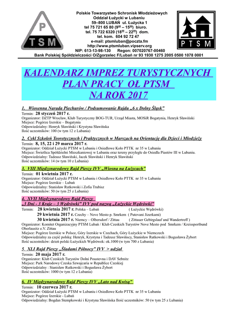 Polskie Towarzystwo Schronisk Młodzieżowych Oddział Łużycki w Lubaniu 59–800 LUBAŃ ul. Łużycka 1 tel 75 721 65 80 (900 – 1500) biuro. tel. 75 722 6320 (1800 – 2200) dom. tel. kom. 604 92 72 47 e-mail: [email protected] http://www.ptsmluban.vipserv.org NIP: 613-13-98-130 Regon: 007020767-00460 Bank Polskiej Spółdzielczości O/Zgorzelec F/Lubań nr 93 1930 1275 2005 0500 1078 0001 KALENDARZ IMPREZ TURYSTYCZNYCH PLAN PRACY OŁ PTSM NA ROK 2017 1. Wiosenna Narada Piechurów / Podsumowanie Rajdu „6 x Dolny Śląsk” Termin: 28 styczeń 2017 r. Organizator: DZTP Wrocław, Klub Turystyczny BOG-TUR, Urząd Miasta, MOSiR Bogatynia, Henryk Sławiński Miejsce: Pogórze Izerskie – Bogatynia Odpowiedzialny: Henryk Sławiński i Krystyna Sławińska Ilość uczestników: 100 (w tym 12 z Lubania) 2. Cykl Szkoleń Teoretycznych i Praktycznych w Marszach na Orientację dla Dzieci i Młodzieży Termin: 8, 15, 22 i 29 marca 2017 r. Organizator: Oddział Łużycki PTSM w Lubaniu i Osiedlowe Koło PTTK nr 35 w Lubaniu Miejsce: Świetlica Spółdzielni Mieszkaniowej w Lubaniu oraz tereny przyległe do Osiedla Piastów III w Lubaniu. Odpowiedzialny: Tadeusz Sławiński, Jacek Sławiński i Henryk Sławiński Ilość uczestników: 14 (w tym 10 z Lubania) 3. VIII Międzynarodowy Rajd Pieszy IVV „Wiosna na Łużycach” Termin: 01 kwietnia 2017 r. Organizator: Oddział Łużycki PTSM w Lubaniu i Osiedlowe Koło PTTK nr 35 w Lubaniu Miejsce: Pogórze Izerskie – Lubań Odpowiedzialny: Stanisław Rutkowski i Zofia Trubisz Ilość uczestników: 50 (w tym 25 z Lubania) 4. XVII Międzynarodowy Rajd Pieszy „3 Dni - 3 Kraje – 3 Wędrówki” IVV pod nazwą „Łużyckie Wędrówki” Termin: 28 kwietnia 2017 r. Polska – Lubań ( Łużyckie Wędrówki) 29 kwietnia 2017 r. Czechy – Nove Mesto p. Smrkem ( Putovani Jizerkami) 30 kwietnia 2017 r. Niemcy – Olbersdorf / Zittau ( Zittauer Gebirgslauf und Wandertreff ) Organizator: Komitet Organizacyjny PTSM Lubań / Klub Czeskich Turystów Nove Mesto pod Smrkem / Kreissportbund Oberlausitz e.V. Zittau Miejsce: Pogórze Izerskie w Polsce, Góry Izerskie w Czechach, Góry Łużyckie w Niemczech Odpowiedzialny za część polską: Henryk, Krystyna i Tadeusz Sławińscy, Stanisław Rutkowski i Bogusława Żybort Ilość uczestników: dzień polski Łużyckich Wędrówek: ok.1000 (w tym 700 z Lubania) 5. XLI Rajd Pieszy „Śladami Północy” IVV > udział Termin: 20 maja 2017 r. Organizator: Klub Czeskich Turystów Dolni Poustevna i DAV Sebnitz Miejsce: Park Narodowy Czeska Szwajcaria w Republice Czeskiej Odpowiedzialny : Stanisław Rutkowski i Bogusława Żybort Ilość uczestników: 1000 (w tym 12 z Lubania) 6. IV Międzynarodowy Rajd Pieszy IVV „Lato nad Kwisą” Termin: 10 czerwca 2017 r. Organizator: Oddział Łużycki PTSM w Lubaniu i Osiedlowe Koło PTTK nr 35 w Lubaniu Miejsce: Pogórze Izerskie - Lubań Odpowiedzialny: Bogdan Stempkowski i Krystyna Sławińska Ilość uczestników: 50 (w tym 25 z Lubania) 7. XXXV Rajd Pieszy „Skalnymi Zamkami Łabskich Piaskowców” IVV > udział Termin: 12-13 sierpnia 2017r. Organizator: Klub Czeskich Turystów Krasna Lipa Miejsce: Park Narodowy Czeska Szwajcaria w Republice Czeskiej Odpowiedzialny: Tadeusz Sławiński i Stanisław Rutkowski Ilość uczestników: 100 (w tym 12 z Lubania) 8. Wycieczka Samochodowa turystyczno-krajoznawcza „Wzgórza Trzebnickie” Termin: 02-03 września 2017 r. Organizator: Oddział Łużycki PTSM w Lubaniu Miejsce: Wrocław oraz Wzgórza Trzebnickie / baza SSM Kuraszków Odpowiedzialny: Henryk Sławiński i Tadeusz Sławiński Ilość uczestników: 16 ( w tym 16 z Lubania) 9. XIX Międzynarodowy Rajd Górski Euroregionu Nysa „Karkonosze 2017” Termin: 04–08 października 2017 r. Organizator: Oddział Łużycki PTSM w Lubaniu i Osiedlowe Koło PTTK nr 35 Lubań Miejsce: Polskie i Czeskie Karkonosze oraz Góry Izerskie / baza Ośrodek Wypoczynkowy „Rzemieślnik” Szklarska Poręba Odpowiedzialny: Henryk, Krystyna i Tadeusz Sławińscy oraz Bogusława Żybort i Stanisław Rutkowski Ilość uczestników: 300 (w tym 60 z Lubania) 10. IV Międzynarodowy Rajd Pieszy IVV „Jesień na Łużycach” Termin: 21 października 2017 r. Organizator: Oddział Łużycki PTSM w Lubaniu i Osiedlowe Koło PTTK nr 35 Lubań Miejsce: Pogórze Izerskie - Lubań Odpowiedzialny: Stanisław Rutkowski i Zofia Trubisz Ilość uczestników: 50 (w tym 25 z Lubania) 11. XIII Marsze na Orientację „Bukowa Góra 2017” Termin: 04 listopada 2017 r. Organizator: Oddział Łużycki PTSM w Lubaniu i Osiedlowe Koło PTTK nr 35 Lubań Miejsce: Pogórze Izerskie – Lubań / Henryków Lubański Odpowiedzialny: Henryk Sławiński, Tadeusz Sławiński i Jacek Sławiński Ilość uczestników: 100 (w tym 30 dzieci ze szkolnych kół PTSM z Lubania i okolic) 12. XIX Wycieczka Autokarowa „Poszukiwanie św. Mikołaja” Termin: 09–10 grudnia 2017 r. Organizator: Oddział Łużycki PTSM w Lubaniu i Osiedlowe Koło PTTK nr 35 Lubań Miejsce: Góry Kaczawskie – baza SSM Złotoryja > Basen Orka Bolesławiec Odpowiedzialny: Henryk Sławiński i Teresa Rutkowska Ilość uczestników: 100 (w tym 50 dzieci ze szkolnych kół PTSM z Lubania i okolic) 13. Podsumowanie sezonu turystycznego 2017 roku (pokaz slajdów) Termin: 03 stycznia 2018 r. Organizator: Oddział Łużycki PTSM w Lubaniu i Osiedlowe Koło PTTK nr 35 Lubań Miejsce: Lubań – Klub Spółdzielni Mieszkaniowej w Lubaniu Odpowiedzialny: Henryk Sławiński i Krystyna Sławińska Ilość uczestników: 30 (w tym 20 z Lubania) …...................................................................................................................................................................................................... Spotkania miłośników turystyki w każdą środę z wyjątkiem świąt o godz. 18.00 w Klubie Spółdzielni Mieszkaniowej w Lubaniu przy ul. Łużyckiej 1 (nad sklepem EKO) ….......................................