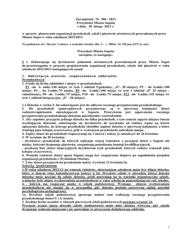 Zarządzenie Nr 506 / 2012 Prezydenta Miasta Sopotu z dnia 28 lutego 2012 r. w sprawie planowania organizacji przedszkoli, szkół i placówek oświatowych prowadzonych przez Miasto Sopot w roku szkolnym 2012/2013 Na podstawie art. 34a ust. 3 ustawy o systemie oświaty (Dz. U. z 2004r. Nr 256 poz.2572 ze zm.) Prezydent Miasta Sopotu zarządza, co następuje: § 1. Zobowiązuje się dyrektorów jednostek oświatowych prowadzonych przez Miasto Sopot do przestrzegania w procesie projektowania organizacji przedszkola, szkoły lub placówki w roku szkolnym 2012/2013 następujących zasad: I. Rekrutacja uczniów, organizowanie oddziałów. Przedszkola 1. Ustala się liczbę oddziałów i miejsc w przedszkolach: P1 –do 6. oddz./140 miejsc (w tym 1 oddział 5.godzinny, „0”- 20 miejsc), P2 – do 4.oddz./100 miejsc, P4 – do 3.oddz./75 miejsc, P5 –do 4.oddz./100 miejsc (w tym 1 oddział „0” 25 miejsc całodzienny), P8 –do 3.oddz./75 miejsc, P10 –do 3.oddz./75 miejsc, P12 –do 5.oddz./125 miejsc (w tym 1 oddział integracyjny „0” - 20 miejsc). 1.1.Dziecko w wieku 5. lat zobowiązane jest do odbycia rocznego przygotowania przedszkolnego. 2. Do przedszkoli samorządowych przyjmowane są w pierwszej kolejności dzieci rodziców/opiekunów mieszkających w Sopocie. Priorytetem jest zapewnienie rocznego przygotowania przedszkolnego dzieciom pięcioletnim i sześcioletnim. 3. Aby zapobiec przyjęciu jednego dziecka do kilku przedszkoli, a tym samym zajęciu miejsca innym oczekującym dzieciom, zobowiązuje się dyrektorów do uzyskania od rodzica wpisu na karcie zgłoszenia dziecka, do którego przedszkola chcieliby zapisać dziecko w pierwszej kolejności, a które traktują jako kolejne (rezerwowe), jeśli w wybranym przedszkolu zabraknie miejsc. 4. Zapisy dzieci do przedszkoli rozpoczynają się 1 marca i należy je zakończyć do 16 kwietnia. 5. W terminie do 20 kwietnia: - dyrektorzy przedszkoli, do których wpłynęło więcej wniosków o przyjęcie dzieci z Sopotu niż miejsc, którymi dysponuje placówka, zorganizują posiedzenia komisji kwalifikacyjnych, - przekażą listy dzieci nieprzyjętych dyrektorom tych przedszkoli, których rodzice wskazali jako kolejne (rezerwowe), 6. Wnioski rodziców dzieci spoza Sopotu mogą być rozpatrzone dopiero po uzgodnieniu projektu organizacji przedszkola z Wydziałem Oświaty. 7. Listy dzieci przyjętych do przedszkola należy wywiesić 23 kwietnia br. Szkoły podstawowe 1.W roku szkolnym 2012/13 na wniosek rodziców, obowiązkiem szkolnym może być objęte dziecko, które w danym roku kalendarzowym kończy 6 lat. Dyrektor szkoły w obwodzie której dziecko mieszka może przyjąć do szkoły dziecko, jeżeli pozwalają na to warunki organizacyjne szkoły, a dziecko było objęte wychowaniem przedszkolnym w roku szkolnym poprzedzającym rok szkolny, w którym ma rozpocząć naukę w szkole podstawowej. Wymogu objęcia wychowaniem przedszkolnym nie stosuje się w przypadku gdy dziecko posiada pozytywną opinię poradni psychologiczno-pedagogicznej. 1a. Dyrektor szkoły podstawowej sprawuje nadzór nad realizacją rocznego przygotowania przedszkolnego dzieci 5. i 6. letnich. 2. Średnia liczba uczniów w klasach pierwszych szkół podstawowych powinna wynosić 24. Przyjęcie ucznia spoza obwodu szkoły podstawowej może mieć miejsce wówczas, gdy szkoła dysponuje wolnymi miejscami i nie spowoduje to utworzenia dodatkowego oddziału. 1 2a. Z dniem 1.09.2012 r. planuje się utworzenie klasy sportowej (piłka koszykowa) na poziomie kl.IV w SP nr 7. 3. Wnioski rodziców dzieci mieszkających poza Sopotem mogą być rozpatrywane po uzgodnieniu projektu organizacji szkoły z Wydziałem Oświaty. Listy dzieci (uczniów do klas I) należy przedłożyć w Wydziale Oświaty do dnia 14 maja br. 4. Listy uczniów przyjętych do szkoły należy wywiesić w dniu 21 maja o godzinie 12.00. Gimnazja 1. Średnia liczba uczniów w klasach pierwszych gimnazjów powinna wynosić 25. Przyjęcie ucznia spoza obwodu gimnazjum może mieć miejsce wówczas, gdy szkoła dysponuje wolnymi miejscami i nie spowoduje to utworzenia dodatkowego oddziału. 2. Terminy rekrutacji uczniów do klas I oraz składania dokumentów określa Zarządzenie Nr 1/2012 Pomorskiego Kuratora Oświaty z dnia 24 stycznia 2012 roku. 3. Wnioski rodziców dzieci mieszkających poza Sopotem mogą być rozpatrywane po uzgodnieniu projektu organizacji gimnazjum z Wydziałem Oświaty. 4.Planuje się utworzenie oddziałów integracyjnych w Gimnazjum nr 1 i nr 2. 5.W ramach kontynuacji pilotażu w pierwszych klasach gimnazjalnych planuje się naukę żeglarstwa jako obowiązkowe zajęcia z wychowania fizycznego. Szkoły ponadgimnazjalne 1. Liczby uczniów i oddziałów klas I szkół ponadgimnazjalnych określone zostały w orzeczeniach organizacyjnych tych szkół. 2. Terminy rekrutacji i składania dokumentów określa Zarządzenie Nr 1/2012 Pomorskiego Kuratora Oświaty z dnia 24 stycznia 2012 roku. 3. Liczba oddziałów i uczniów klas pierwszych szkół ponadgimnazjalnych na podbudowie gimnazjum zostanie uzgodniona i ostatecznie zatwierdzona po zakończeniu rekrutacji uzupełniającej do szkół ponadgimnazjalnych. 4. Liczba uczniów w oddziale szkoły ponadgimnazjalnej dla młodzieży powinna wynosić w klasie pierwszej nie mniej niż 28 ( w rekrutacji elektronicznej należy podać liczbę wolnych miejsc zgodnie zatwierdzonym orzeczeniem). 5.Należy niezwłocznie powiadomić organ prowadzący szkołę o sytuacji, gdy w szkołach ponadgimnazjalnych młodzieżowych i dla dorosłych liczba uczniów/słuchaczy w ciągu roku szkolnego będzie mniejsza niż 20. Specyficzna organizacja i formy kształcenia, szkoły specjalne, artystyczne i placówki A. Klasy sportowe i szkoła mistrzostwa sportowego 1.Planuje się kontynuowanie naboru do oddziałów klas I sportowych w Gimnazjum Sportowym nr 3: 1 oddział o profilu katamarany i windsurfing i 1 oddział o profilu koszykówki. 2. Liczbę uczniów, 