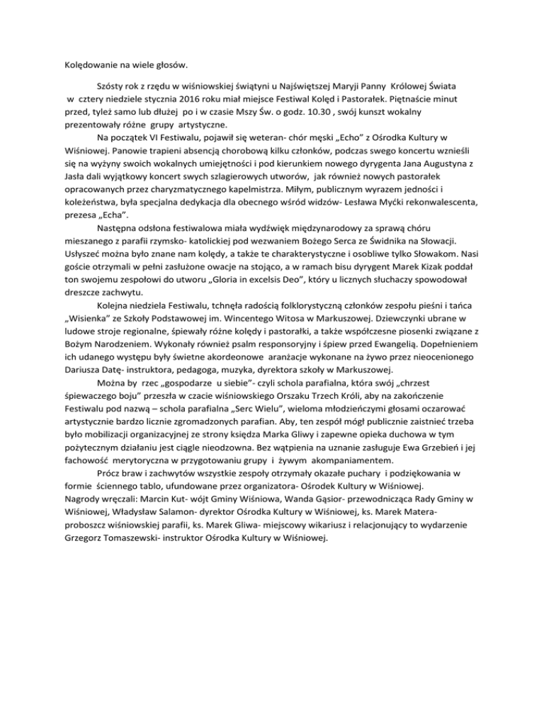 Kolędowanie na wiele głosów. Szósty rok z rzędu w wiśniowskiej świątyni u Najświętszej Maryji Panny Królowej Świata w cztery niedziele stycznia 2016 roku miał miejsce Festiwal Kolęd i Pastorałek. Piętnaście minut przed, tyleż samo lub dłużej po i w czasie Mszy Św. o godz. 10.30 , swój kunszt wokalny prezentowały różne grupy artystyczne. Na początek VI Festiwalu, pojawił się weteran- chór męski „Echo” z Ośrodka Kultury w Wiśniowej. Panowie trapieni absencją chorobową kilku członków, podczas swego koncertu wznieśli się na wyżyny swoich wokalnych umiejętności i pod kierunkiem nowego dyrygenta Jana Augustyna z Jasła dali wyjątkowy koncert swych szlagierowych utworów, jak również nowych pastorałek opracowanych przez charyzmatycznego kapelmistrza. Miłym, publicznym wyrazem jedności i koleżeństwa, była specjalna dedykacja dla obecnego wśród widzów- Lesława Myćki rekonwalescenta, prezesa „Echa”. Następna odsłona festiwalowa miała wydźwięk międzynarodowy za sprawą chóru mieszanego z parafii rzymsko- katolickiej pod wezwaniem Bożego Serca ze Świdnika na Słowacji. Usłyszeć można było znane nam kolędy, a także te charakterystyczne i osobliwe tylko Słowakom. Nasi goście otrzymali w pełni zasłużone owacje na stojąco, a w ramach bisu dyrygent Marek Kizak poddał ton swojemu zespołowi do utworu „Gloria in excelsis Deo”, który u licznych słuchaczy spowodował dreszcze zachwytu. Kolejna niedziela Festiwalu, tchnęła radością folklorystyczną członków zespołu pieśni i tańca „Wisienka” ze Szkoły Podstawowej im. Wincentego Witosa w Markuszowej. Dziewczynki ubrane w ludowe stroje regionalne, śpiewały różne kolędy i pastorałki, a także współczesne piosenki związane z Bożym Narodzeniem. Wykonały również psalm responsoryjny i śpiew przed Ewangelią. Dopełnieniem ich udanego występu były świetne akordeonowe aranżacje wykonane na żywo przez nieocenionego Dariusza Datę- instruktora, pedagoga, muzyka, dyrektora szkoły w Markuszowej. Można by rzec „gospodarze u siebie”- czyli schola parafialna, która swój „chrzest śpiewaczego boju” przeszła w czacie wiśniowskiego Orszaku Trzech Króli, aby na zakończenie Festiwalu pod nazwą – schola parafialna „Serc Wielu”, wieloma młodzieńczymi głosami oczarować artystycznie bardzo licznie zgromadzonych parafian. Aby, ten zespół mógł publicznie zaistnieć trzeba było mobilizacji organizacyjnej ze strony księdza Marka Gliwy i zapewne opieka duchowa w tym pożytecznym działaniu jest ciągle nieodzowna. Bez wątpienia na uznanie zasługuje Ewa Grzebień i jej fachowość merytoryczna w przygotowaniu grupy i żywym akompaniamentem. Prócz braw i zachwytów wszystkie zespoły otrzymały okazałe puchary i podziękowania w formie ściennego tablo, ufundowane przez organizatora- Ośrodek Kultury w Wiśniowej. Nagrody wręczali: Marcin Kut- wójt Gminy Wiśniowa, Wanda Gąsior- przewodnicząca Rady Gminy w Wiśniowej, Władysław Salamon- dyrektor Ośrodka Kultury w Wiśniowej, ks. Marek Materaproboszcz wiśniowskiej parafii, ks. Marek Gliwa- miejscowy wikariusz i relacjonujący to wydarzenie Grzegorz Tomaszewski- instruktor Ośrodka Kultury w Wiśniowej.