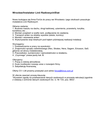 Wrocław/Instalator Linii Radiowych/Etat Nowo budująca się firma ForUs do pracy we Wrocławiu i jego okolicach poszukuje: Instalatora Linii Radiowych. Główne zadania: 1. Budowa masztu na dachu, drogi kablowej, uziemienia, przewierty, korytka, konektory etc ... 2. MontaŜ urządzeń w szafie rack, podłączenie do zasilania. 3. Transport anten na obiekty wysokie (wieŜe, kominy). 4. MontaŜ i wizowanie anten. 5. Wykonywanie wizji lokalnych pod kątem późniejszej realizacji instalacji. Wymagamy: 1. Doświadczenia w pracy na wysokości. 2. Znajomości sprzętu radioliniowego (Nec, Stratex, Nera, Sagem, Ericsson, Saf) głównie od strony instalatorskiej. 3. Pracowitości, sumienności i samodzielności w działaniu. 4. „Czynnego” prawa jazdy kat. B. Oferujemy: 1. Pracę w dobrej atmosferze. 2. DuŜe moŜliwości rozwoju wraz z rozwojem firmy. 3. Satysfakcję finansową. Oferty CV i LM prosimy przesyłać pod adres [email protected] W ofercie zawrzeć proszę klauzulę: "WyraŜam zgodę na przetwarzanie danych osobowych w procesie rekrutacji (zgodnie z Ustawą o ochronie danych osobowych Dz. U. Nr 133, poz. 883)".