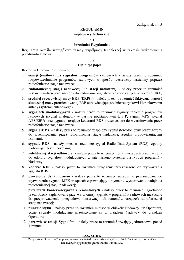 Załącznik nr 3 REGULAMIN współpracy technicznej §1 Przedmiot Regulaminu Regulamin określa szczegółowe zasady współpracy technicznej w zakresie wykonywania przedmiotu Umowy. §2 Definicje pojęć Ilekroć w Umowie jest mowa o: 1. emisji (emitowaniu) sygnałów programów radiowych - należy przez to rozumieć rozpowszechnianie programów radiowych w sposób rozsiewczy naziemny poprzez radiofoniczne stacje nadawcze; 2. radiofonicznej stacji nadawczej lub stacji nadawczej - należy przez to rozumieć zestaw urządzeń przeznaczony do nadawania sygnałów radiofonicznych w zakresie UKF; 3. średniej rzeczywistej mocy ERP (ERPśr) - należy przez to rozumieć faktyczną wartość skutecznej mocy promieniowanej ERP odpowiadającą średniemu zyskowi kierunkowemu anteny (systemu antenowego); 4. sygnałach modulacyjnych - należy przez to rozumieć sygnały foniczne programów radiowych (sygnał analogowy w paśmie podstawowym L i P; sygnał MPX; sygnał AES/EBU) oraz sygnały sterujące koderami RDS przeznaczone do wyemitowania przez radiofoniczne stacje nadawcze; 5. sygnale MPX – należy przez to rozumieć zespolony sygnał stereofoniczny przeznaczony do wyemitowania przez radiofoniczną stację nadawczą, zgodny z obowiązującymi normami; 6. sygnale RDS - należy przez to rozumieć sygnał Radio Data System (RDS), zgodny z obowiązującymi normami; 7. satelitarnej stacji odbiorczej - należy przez to rozumieć zestaw urządzeń przeznaczony do odbioru sygnałów modulacyjnych z satelitarnego systemu dystrybucji programów Nadawcy; 8. koderze RDS - należy przez to rozumieć urządzenie przeznaczone do wytwarzania sygnału RDS; 9. procesorze dynamicznym - należy przez to rozumieć urządzenie przeznaczone do wytworzenia sygnału MPX w sposób zapewniający optymalne wysterowanie nadajnika radiofonicznej stacji nadawczej; 10. przerwach konserwacyjnych i remontowych - należy przez to rozumieć uzgodnione przez Strony zaplanowane przerwy w emisji sygnałów programów radiowych niezbędne do przeprowadzenia przeglądów, konserwacji lub remontów urządzeń radiofonicznej stacji nadawczej; 11. punkcie styku – należy przez to rozumieć miejsce w obiekcie Nadawcy lub Operatora, gdzie sygnały modulacyjne przekazywane są z urządzeń Nadawcy do urządzeń Operatora; 12. przerwie w emisji Sygnałów – należy przez to rozumieć trwający jednorazowo ponad 1 minutę: PZZ.25.5.2012 Załącznik nr 3 do SIWZ w postępowaniu na świadczenie usług dosyłu do obiektów i emisji z obiektów nadawczych sygnału programu Radio Lublin S.A. a) stan obniżenia o ponad 20 dB względem poziomu nominalnego mocy promieniowanej stacji nadawczej lub b) stan emisji sygnałów fonicznych, z poziomem poniżej -24 dB; §3 Realizacja usług 1. Operator świadczy usługi będące przedmiotem Umowy przez radiofoniczną stację nadawczą, której dane techniczne zostały określone zgodnie z załącznikiem nr 7 do SIWZ. 2. Operator zobowiązuje się wprowadzić sygnały RDS do sygnału emitowanego przez radiofoniczną stację nadawczą. 3. Operator zapewnia Nadawcy, w obiekcie nadawczym, zasilanie oraz miejsce do zainstalowania: - kodera RDS. 4. Zapewnienie zasilania urządzenia wymienionego w ust. 3 polega na możliwości dołączenia go, w miarę posiadanych możliwości, do źródła gwarantowanego napięcia jednofazowego prądu przemiennego 230V, o mocy do 300VA (UPS, lub równoważne). 5. Nadawca wykonuje instalację urządzenia wymienionego w ust. 3 w uzgodnieniu z właścicielem obiektu na własny koszt i ryzyko. 6. Przed rozpoczęciem instalacji urządzenia wymienionego w ust. 3 Nadawca jest zobowiązany dostarczyć Operatorowi następujące dokumenty dotyczące tego urządzenia: a) szkic instalacji do akceptacji Operatora; b) dokumentacje techniczne urządzenia; c) niezbędne instrukcje obsługi; d) dokumenty uprawniające do używania tego urządzenia, jeżeli będą one wymagane przepisami prawa. 7. Wydanie Operatorowi urządzenia określonego w ust. 3 oraz jego odbiór od Operatora zostanie stwierdzone protokołem zdawczo-odbiorczym podpisanym przez obie Strony oraz określającym datę wydania lub odebrania oraz, na wniosek jednej ze Stron, stan techniczny tego urządzenia. 8. Operator zapewnia warunki umożliwiające prawidłową pracę urządzenia Nadawcy zainstalowanego w pomieszczeniach obiektu nadawczego. 9. W razie upływu terminu wypowiedzenia, rozwiązania, odstąpienia od Umowy lub jej wygaśnięcia w inny sposób, o ile Strony nie uzgodnią inaczej na piśmie, Nadawca zobowiązany jest zdemontować i usunąć w terminie do trzech miesięcy od dnia wygaśnięcia Umowy urządzenie będące jego własnością zainstalowane w obiekcie nadawczym Operatora. Po upływie trzech miesięcy od dnia wygaśnięcia Umowy Nadawca ponosi koszty składowania nieodebranego urządzenia. W przypadku nie zdemontowania urządzenia w terminie trzech miesięcy od dnia wygaśnięcia Umowy Operator uprawniony będzie do zdemontowania urządzenia i składowania go na koszt Nadawcy. 10. Koszty energii elektrycznej zużywanej przez urządzenie wymienione w ust. 3 ponosi Operator. 11. Operator sprawuje nadzór nad urządzeniem zainstalowanym przez Nadawcę. 12. Nadawca dokonuje napraw urządzenia będącego jego własnością wchodzącego w skład radiofonicznej stacji nadawczej. Strona 2 z 5 PZZ.25.5.2012 Załącznik nr 3 do SIWZ w postępowaniu na świadczenie usług dosyłu do obiektów i emisji z obiektów nadawczych sygnału programu Radio Lublin S.A. 13. Każda ze Stron odpowiada za zgodność parametrów zainstalowanego urządzenia będącego jej własnością z obowiązującymi normami technicznymi i warunkami decyzji rezerwacji częstotliwości Nadawcy. 14. Nadawca zobowiązuje się do dostarczania Operatorowi sygnałów modulacyjnych o parametrach w punkcie styku zgodnych z warunkami określonymi w § 6 ust. 3 niniejszego Regulaminu. 15. Operator dokonuje bieżącej kontroli radiofonicznej stacji nadaw