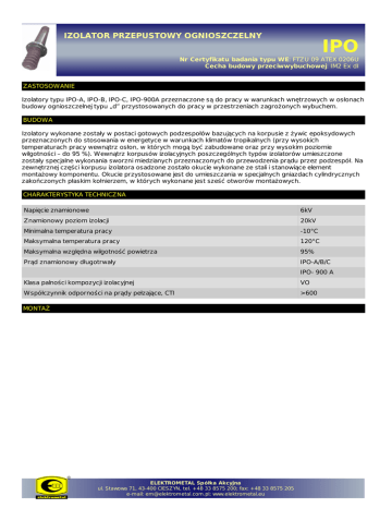 IZOLATOR PRZEPUSTOWY OGNIOSZCZELNY IPO Nr Certyfikatu badania typu WE: FTZU 09 ATEX 0206U Cecha budowy przeciwwybuchowej: IM2 Ex dI ZASTOSOWANIE Izolatory typu IPO-A, IPO-B, IPO-C, IPO-900A przeznaczone są do pracy w warunkach wnętrzowych w osłonach budowy ognioszczelnej typu „d” przystosowanych do pracy w przestrzeniach zagrożonych wybuchem. BUDOWA Izolatory wykonane zostały w postaci gotowych podzespołów bazujących na korpusie z żywic epoksydowych przeznaczonych do stosowania w energetyce w warunkach klimatów tropikalnych (przy wysokich temperaturach pracy wewnątrz osłon, w których mogą być zabudowane oraz przy wysokim poziomie wilgotności – do 95 %). Wewnątrz korpusów izolacyjnych poszczególnych typów izolatorów umieszczone zostały specjalne wykonania sworzni miedzianych przeznaczonych do przewodzenia prądu przez podzespół. Na zewnętrznej części korpusu izolatora osadzone zostało okucie wykonane ze stali i stanowiące element montażowy komponentu. Okucie przystosowane jest do umieszczania w specjalnych gniazdach cylindrycznych zakończonych płaskim kołnierzem, w których wykonane jest sześć otworów montażowych. CHARAKTERYSTYKA TECHNICZNA Napięcie znamionowe 6kV Znamionowy poziom izolacji 20kV Minimalna temperatura pracy -10°C Maksymalna temperatura pracy 120°C Maksymalna względna wilgotność powietrza 95% Prąd znamionowy długotrwały IPO-A/B/C IPO- 900 A Klasa palności kompozycji izolacyjnej VO Współczynnik odporności na prądy pełzające, CTI >600 MONTAŻ ELEKTROMETAL Spółka Akcyjna ul. Stawowa 71, 43-400 CIESZYN, tel. +48 33 8575 200; fax: +48 33 8575 205 e-mail: [email protected]; www.elektrometal.eu