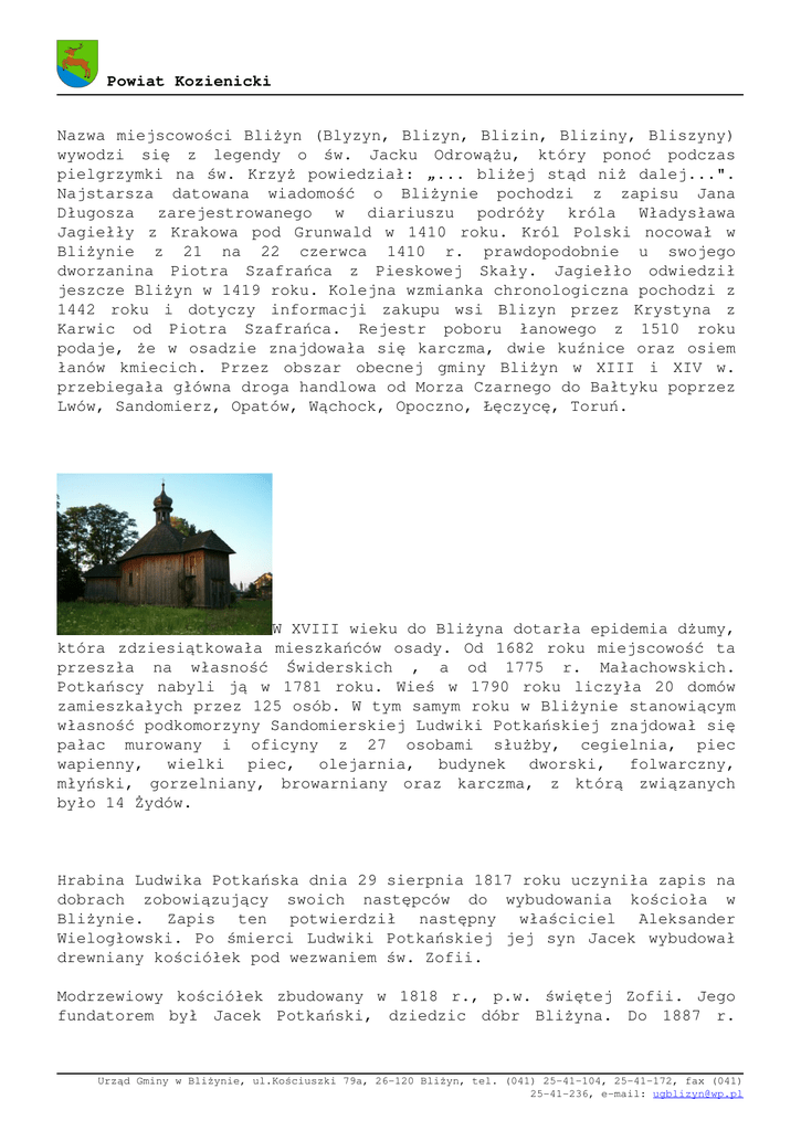 Powiat Kozienicki Nazwa miejscowości Bliżyn (Blyzyn, Blizyn, Blizin, Bliziny, Bliszyny) wywodzi się z legendy o św. Jacku Odrowążu, który ponoć podczas pielgrzymki na św. Krzyż powiedział: „... bliżej stąd niż dalej...". Najstarsza datowana wiadomość o Bliżynie pochodzi z zapisu Jana Długosza zarejestrowanego w diariuszu podróży króla Władysława Jagiełły z Krakowa pod Grunwald w 1410 roku. Król Polski nocował w Bliżynie z 21 na 22 czerwca 1410 r. prawdopodobnie u swojego dworzanina Piotra Szafrańca z Pieskowej Skały. Jagiełło odwiedził jeszcze Bliżyn w 1419 roku. Kolejna wzmianka chronologiczna pochodzi z 1442 roku i dotyczy informacji zakupu wsi Blizyn przez Krystyna z Karwic od Piotra Szafrańca. Rejestr poboru łanowego z 1510 roku podaje, że w osadzie znajdowała się karczma, dwie kuźnice oraz osiem łanów kmiecich. Przez obszar obecnej gminy Bliżyn w XIII i XIV w. przebiegała główna droga handlowa od Morza Czarnego do Bałtyku poprzez Lwów, Sandomierz, Opatów, Wąchock, Opoczno, Łęczycę, Toruń. W XVIII wieku do Bliżyna dotarła epidemia dżumy, która zdziesiątkowała mieszkańców osady. Od 1682 roku miejscowość ta przeszła na własność Świderskich , a od 1775 r. Małachowskich. Potkańscy nabyli ją w 1781 roku. Wieś w 1790 roku liczyła 20 domów zamieszkałych przez 125 osób. W tym samym roku w Bliżynie stanowiącym własność podkomorzyny Sandomierskiej Ludwiki Potkańskiej znajdował się pałac murowany i oficyny z 27 osobami służby, cegielnia, piec wapienny, wielki piec, olejarnia, budynek dworski, folwarczny, młyński, gorzelniany, browarniany oraz karczma, z którą związanych było 14 Żydów. Hrabina Ludwika Potkańska dnia 29 sierpnia 1817 roku uczyniła zapis na dobrach zobowiązujący swoich następców do wybudowania kościoła w Bliżynie. Zapis ten potwierdził następny właściciel Aleksander Wielogłowski. Po śmierci Ludwiki Potkańskiej jej syn Jacek wybudował drewniany kościółek pod wezwaniem św. Zofii. Modrzewiowy kościółek zbudowany w 1818 r., p.w. świętej Zofii. Jego fundatorem był Jacek Potkański, dziedzic dóbr Bliżyna. Do 1887 r. Urząd Gminy w Bliżynie, ul.Kościuszki 79a, 26-120 Bliżyn, tel. (041) 25-41-104, 25-41-172, fax (041) 25-41-236, e-mail: [email protected] Powiat Kozienicki kościół ten pełnił funkcje kaplicy dworskiej i był obsługiwany przez kapelanów dworskich. Uroczyste utworzenie parafii nastąpiło 23 sierpnia 1888 r. na podstawie dekretu biskupa sandomierskiego ks. Antoniego Sotkiewicza. Na terenie otaczającym kościółek znajdują się nagrobki właścicieli Bliżyna i okolicznych miejscowości. Do kontynuacji budowy murowanego kościoła przystąpiono w 1819 roku. Jednakże władze carskie wyraziły zgodę na utworzenie nowej parafii w Bliżynie z dotychczasowej parafii Odrowąż dopiero 30 kwietnia 1888 roku. Kościółek św. Zofii uważany był za zbyt mały, toteż ówczesny proboszcz, ksiądz Julian Piontek, rozpoczął w roku 1893 energiczne starania o uzyskanie pozwolenia na budowę murowanego kościoła. W maju 1895 roku rząd wydał zgodę na dalszą budowę i zbieranie składek. „Koszty budowy nowej świątyni wziął na się znany ze swej szlachetności, pracy i zapobiegliwości o domy Boże Ludwik hrabia Plater" Kościół pod wezwaniem Św. Ludwika. Wybudowany w latach 1896-1900 z kamienia ciosowego neogotyckiego o układzie trzynawowym. Wykonany według projektu arch. Antoniego Hutten – Czapskiego. Kościół pod wezwaniem Św. Ludwika w Bliżynie Urząd Gminy w Bliżynie, ul.Kościuszki 79a, 26-120 Bliżyn, tel. (041) 25-41-104, 25-41-172, fax (041) 25-41-236, e-mail: [email protected] Powiat Kozienicki Od dawien dawna ludzie wydobywali puszczańskich drzew robili węgiel drzewny potrzebny do wypału i w prostych dymarkach wytapiali żelazo. Gospodarczy rozkwit tych terenów rozpoczyna się z początkiem XIX w. kiedy na terenie Bliżyna działały Zakłady Górnicze z odlewnią, których właścicielem był hr. Plater oraz odlewnia „Salonowa" produkująca wyroby artystyczne. W szczytowym okresie zakłady zatrudniały około 1100 pracowników. Kryzys gospodarczy pierwszych lat XX w. Spowodował krach finansowy zakładów, które zostały przekształcone w odlewnie żeliwa. Wyroby odlewni Platerów były Otrzymywały znane i wyróżniane na całym świecie. medale na wystawach w Warszawie, Moskwie i Madrycie. Poza Bliżynem na terenie gminy działało kilka fryszerek tzn. pieców do tzw. świeżenia wielkopiecowej surówki żelaza. Fryszerki działały w Wołowie, Zbrojowie i Płaczkowie. Odlewnia żeliwa działała również do końca XIX w. W Mroczkowie dając do 2800 cetnarów żelaza rocznie. W 1916 r. w Sołtykowie powstała cegielnia. W 1881 roku rozpoczynają się prace nad planami budowy kolei z Opoczna przez Bliżyn do Bzina. Następuje etap budowy kolei, który stwarza ogromne szanse rozwojowe dla Bliżyna. W dniu 24 lipca 1885 r. tłum ludzi z hr. Ludwikiem Broel - Plater, inż. Janem Witwickim oraz świtą powitali pierwszy przejazd pociągu przez Bliżyn. Urząd Gminy w Bliżynie, ul.Kościuszki 79a, 26-120 Bliżyn, tel. (041) 25-41-104, 25-41-172, fax (041) 25-41-236, e-mail: [email protected] tu Powiat Kozienicki W 1908 roku właścicielem Zakładów Górniczych był hr. Henryk BroelPlater. Zakład o dużych możliwościach produkcyjnych, otrzymał wiele medali na międzynarodowych targach. Wydano drukiem w języku polskim i rosyjskim 112 stronicowy katalog wyrobów metalowych. W okresie 1900 – 1939 na terenie gminy Bliżyn rozwinęło się szkolnictwo powszechne, spółdzielczość, ochotnicza straż pożarna, w 1914 roku powstała pierwsza apteka, działają Zakłady Górnicze, Kopalnie rudy „Skały" i „Piekło", tartaki drzewne Podkańskiego i Rozemberga, fryszerka w Płaczkowie, cegielnia w Sołtykowie, wyrób kół w Kucębowie, wypalanie węgla drzewnego i pędzenie smoły w Kopciach i Szałasie. Prze