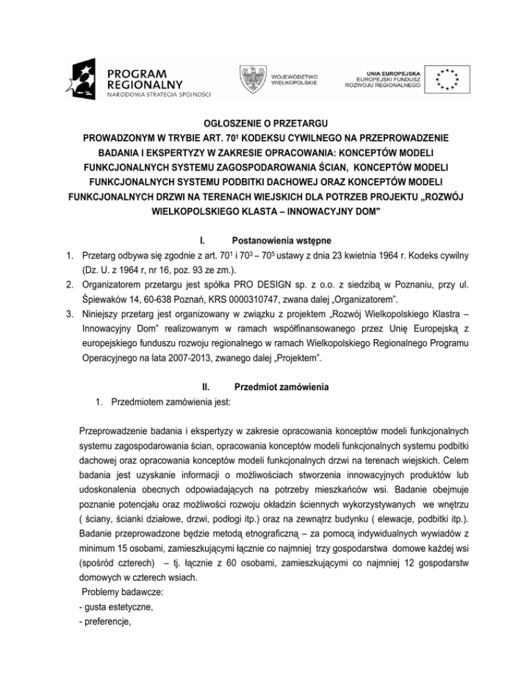 OGŁOSZENIE O PRZETARGU PROWADZONYM W TRYBIE ART. 701 KODEKSU CYWILNEGO NA PRZEPROWADZENIE BADANIA I EKSPERTYZY W ZAKRESIE OPRACOWANIA: KONCEPTÓW MODELI FUNKCJONALNYCH SYSTEMU ZAGOSPODAROWANIA ŚCIAN, KONCEPTÓW MODELI FUNKCJONALNYCH SYSTEMU PODBITKI DACHOWEJ ORAZ KONCEPTÓW MODELI FUNKCJONALNYCH DRZWI NA TERENACH WIEJSKICH DLA POTRZEB PROJEKTU „ROZWÓJ WIELKOPOLSKIEGO KLASTA – INNOWACYJNY DOM" I. Postanowienia wstępne 1. Przetarg odbywa się zgodnie z art. 701 i 703 – 705 ustawy z dnia 23 kwietnia 1964 r. Kodeks cywilny (Dz. U. z 1964 r, nr 16, poz. 93 ze zm.). 2. Organizatorem przetargu jest spółka PRO DESIGN sp. z o.o. z siedzibą w Poznaniu, przy ul. Śpiewaków 14, 60-638 Poznań, KRS 0000310747, zwana dalej „Organizatorem”. 3. Niniejszy przetarg jest organizowany w związku z projektem „Rozwój Wielkopolskiego Klastra – Innowacyjny Dom” realizowanym w ramach współfinansowanego przez Unię Europejską z europejskiego funduszu rozwoju regionalnego w ramach Wielkopolskiego Regionalnego Programu Operacyjnego na lata 2007-2013, zwanego dalej „Projektem”. II. Przedmiot zamówienia 1. Przedmiotem zamówienia jest: Przeprowadzenie badania i ekspertyzy w zakresie opracowania konceptów modeli funkcjonalnych systemu zagospodarowania ścian, opracowania konceptów modeli funkcjonalnych systemu podbitki dachowej oraz opracowania konceptów modeli funkcjonalnych drzwi na terenach wiejskich. Celem badania jest uzyskanie informacji o możliwościach stworzenia innowacyjnych produktów lub udoskonalenia obecnych odpowiadających na potrzeby mieszkańców wsi. Badanie obejmuje poznanie potencjału oraz możliwości rozwoju okładzin ściennych wykorzystywanych we wnętrzu ( ściany, ścianki działowe, drzwi, podłogi itp.) oraz na zewnątrz budynku ( elewacje, podbitki itp.). Badanie przeprowadzone będzie metodą etnograficzną – za pomocą indywidualnych wywiadów z minimum 15 osobami, zamieszkującymi łącznie co najmniej trzy gospodarstwa domowe każdej wsi (spośród czterech) – tj. łącznie z 60 osobami, zamieszkującymi co najmniej 12 gospodarstw domowych w czterech wsiach. Problemy badawcze: - gusta estetyczne, - preferencje, - stylistyka, -styl życia, -kolory, - faktura ( drewno, kamień, gładkie, połysk itp.), - powody zakupu, - akceptowalne poziomy cen, - źródło inspiracji, - sposób montażu, - potrzeby funkcjonalne, - odkrycie niezaspokojonych potrzeb. Na podstawie ww. badań należy przygotować projekty koncepcyjne systemu zagospodarowania ścian, systemu podbitki dachowej oraz funkcjonalnych drzwi . Na przedmiot zamówienia składają się następujące elementy: a. przeprowadzenie badania w czterech wsiach/małych miasteczkach: jedna wieś na terenie woj. wielkopolskiego o liczbie mieszkańców od 500 do 2000 , trzy wsie na terenie woj. lubelskiego lub łódzkiego lub śląskiego lub małopolskiego lub kujawskopomorskie lub mazowieckiego, o liczbie mieszkańców od 500 do 2000 , rekrutacja badanych osób – minimum trzy gospodarstwa domowe w każdej lokalizacji (wsi), minimum 15 przeprowadzonych wywiadów w każdej wytypowanej lokalizacji (wsi), b. sporządzenie raportu końcowego zawierającego wytyczne i wnioski, c. przygotowanie projektów koncepcyjnych systemu zagospodarowania ścian, systemu podbitki dachowej oraz funkcjonalnych drzwi. 2. Przedmiot zamówienia ma zostać wykonany w terminie najdalej 25 tygodni od dnia zawarcia umowy. III. Termin i miejsce złożenia oferty 1. Oferty należy składać w nieprzekraczalnym terminie do dnia 26.09.2011 do godziny 12.00 w biurze Organizatora przy ul. Bukowskiej 148, 60-812 Poznań. 2. Otwarcie ofert nastąpi dnia 26.09.2011 o godz. 15.00 w miejscu wskazanym w ust. 1 powyżej. 3. Niezwłocznie po otwarciu ofert Organizator przystąpi do ich badania pod względem zgodności z warunkami niniejszego przetargu. IV. Termin związania ofertą Oferent jest związany ofertą przez okres 30 dni od dnia złożenia oferty, co winno zostać wyraźnie wskazane w treści oferty. V. Warunki udziału w przetargu 1. Do etapu oceny ofert zostaną dopuszczone oferty oferentów, którzy spełnią łącznie poniższe warunki: a. oferent będzie posiadał doświadczenie w przeprowadzeniu co najmniej jednego projektu badawczego z wykorzystaniem metody etnograficznej i prowadzenia wywiadów indywidualnych, poświadczone referencjami podmiotu na rzecz którego wykonał projekt b. oferent będzie posiadał doświadczenie w przekładaniu wyników prowadzonych badań na prace projektowe poparte przykładem minimum jednego wdrożonego do sprzedaży produktu, na dowód czego oferent przedłoży własne oświadczenie, c. oferent zapewni udział w realizacji projektu co najmniej jednej osoby z tytułem mgr etnografii, co zostanie potwierdzone oświadczeniem tej osoby. d. oferent zapewni udział w wykonaniu przedmiotu zamówienia minimum dwóch projektantów posiadających wykształcenie kierunkowe np.: projektant wnętrz, architekt, wzornictwo przemysłowe , malarstwo itp. , 2. Oferty oferentów, niespełniających warunków określonych w ust. 1 powyżej zostaną odrzucone. 3. Organizator może bez podania przyczyny, w terminie do dnia składania ofert, określonego w pkt. III ust. 1, zmienić warunki udziału w przetargu. VI. Sposób porozumiewania się z oferentami. 1. Osobą wyznaczoną do kontaktów przy realizacji niniejszego przetargu jest: Ewa Voelkel Krokowicz tel. 601 472 255, e-mail: [email protected]. 2. Wnioski, zawiadomienia oraz informacje Organizator i oferenci przekazują drogą pisemną lub elektroniczną W przypadku przekazywania oświadczeń, wniosków, zawiadomień oraz informacji faksem lub drogą elektroniczną, każda ze stron na żądania drugiej niezwłocznie potwierdzi fakt ich otrzymania. VII. Wadium Organizator nie przewiduje obowiązku wnoszenia wadium. VIII. Oferta 1. Oferta powinna być sporządzona czytelnie, w języku polskim lub i umieszczona w zamkniętej kopercie z napisem „Oferta w prze