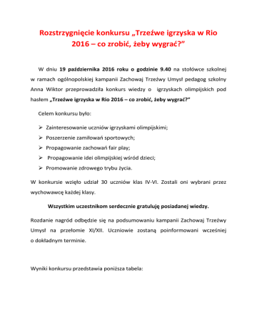 Rozstrzygnięcie konkursu „Trzeźwe igrzyska w Rio 2016 – co zrobić, żeby wygrać?” W dniu 19 października 2016 roku o godzinie 9.40 na stołówce szkolnej w ramach ogólnopolskiej kampanii Zachowaj Trzeźwy Umysł pedagog szkolny Anna Wiktor przeprowadziła konkurs wiedzy o igrzyskach olimpijskich pod hasłem „Trzeźwe igrzyska w Rio 2016 – co zrobić, żeby wygrać?” Celem konkursu było: Zainteresowanie uczniów igrzyskami olimpijskimi; Poszerzenie zamiłowań sportowych; Propagowanie zachowań fair play; Propagowanie idei olimpijskiej wśród dzieci; Promowanie zdrowego trybu życia. W konkursie wzięło udział 30 uczniów klas IV-VI. Zostali oni wybrani przez wychowawcę każdej klasy. Wszystkim uczestnikom serdecznie gratuluję posiadanej wiedzy. Rozdanie nagród odbędzie się na podsumowaniu kampanii Zachowaj Trzeźwy Umysł na przełomie XI/XII. Uczniowie zostaną poinformowani wcześniej o dokładnym terminie. Wyniki konkursu przedstawia poniższa tabela: Wyniki konkursu wiedzy o igrzyskach olimpijskich pod hasłem „Trzeźwe igrzyska w Rio 2016 – co zrobić, żeby wygrać?” Lp. 1. 2. 3. 4. 5. 6. 7. 8. 9. 10. 11. 12. 13. 14. 15. 16. 17. 18. 19. 20. 21. 22. 23. 24. 25. 26. 27. 28. 29. 30. Imię i nazwisko ucznia Mateusz Kruczek Wiktoria Małozięć Dawid Grabowski Bartłomiej Cieślak Karol Góra Dominik Rak Tymoteusz Bukowski Roksana Micek Krystian Maniecki Marcin Łoch Aleksandra Duślak Zuzanna Turek Michał Domański Szymon Marć Antoni Węgrzyn Bartek Herduś Ewa Kłusek Oliwia Cieśla Julia Kucharska Rafał Buszek Oliwia Kuciemba Kacper Janowski Alicja Humeniuk Szymon Mądro Izabela Bieszczad Jakub Marcinków Karol Uszko Kacper Pająk Marceli Sulisz Mateusz Rębiś Punkty 40 pkt. 34 pkt. 32,5 pkt. 32,5 pkt. 32 pkt. 28 pkt. 28 pkt. 26 pkt. 26 pkt. 26 pkt. 24,5 pkt. 24 pkt. 24 pkt. 24 pkt. 22,5 pkt. 20,5 pkt. 20 pkt. 20 pkt. 20 pkt. 20 pkt. 20 pkt. 20 pkt. 18,5 pkt. 18 pkt. 18 pkt. 18 pkt. 18 pkt. 16,5 pkt. 16 pkt. 14 pkt.