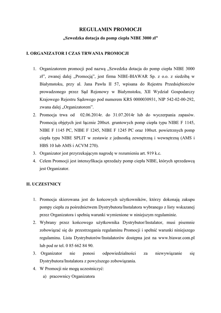 REGULAMIN PROMOCJI „Szwedzka dotacja do pomp ciepła NIBE 3000 zł” I. ORGANIZATOR I CZAS TRWANIA PROMOCJI 1. Organizatorem promocji pod nazwą „Szwedzka dotacja do pomp ciepła NIBE 3000 zł”, zwanej dalej „Promocją”, jest firma NIBE-BIAWAR Sp. z o.o. z siedzibą w Białymstoku, przy al. Jana Pawła II 57, wpisana do Rejestru Przedsiębiorców prowadzonego przez Sąd Rejonowy w Białymstoku, XII Wydział Gospodarczy Krajowego Rejestru Sądowego pod numerem KRS 0000030931, NIP 542-02-00-292, zwana dalej „Organizatorem”. 2. Promocja trwa od 02.06.2014r. do 31.07.2014r lub do wyczerpania zapasów. Promocją objętych jest łącznie 200szt. gruntowych pomp ciepła typu NIBE F 1145, NIBE F 1145 PC, NIBE F 1245, NIBE F 1245 PC oraz 100szt. powietrznych pomp ciepła typu NIBE SPLIT w zestawie z jednostką zewnętrzną i wewnętrzną (AMS i HBS 10 lub AMS i ACVM 270). 3. Organizator jest przyrzekającym nagrodę w rozumieniu art. 919 k.c. 4. Celem Promocji jest intensyfikacja sprzedaży pomp ciepła NIBE, których sprzedawcą jest Organizator. II. UCZESTNICY 1. Promocja skierowana jest do końcowych użytkowników, którzy dokonają zakupu pompy ciepła za pośrednictwem Dystrybutora/Instalatora wybranego z listy wskazanej przez Organizatora i spełnią warunki wymienione w niniejszym regulaminie. 2. Wybrany przez końcowego użytkownika Dystrybutor/Instalator, musi pisemnie zobowiązać się do przestrzegania regulaminu Promocji i spełnić warunki niniejszego regulaminu. Lista Dystrybutorów/Instalatorów dostępna jest na www.biawar.com.pl lub pod nr tel. 0 85 662 84 90. 3. Organizator nie ponosi odpowiedzialności Dystrybutora/Instalatora z powyższego zobowiązania. 4. W Promocji nie mogą uczestniczyć: a) pracownicy Organizatora za niewywiązanie się b) inne osoby związane z przygotowaniem i prowadzeniem Promocji na zlecenie Organizatora c) małżonkowie, zstępni, rodzice, rodzeństwo osób wymienionych w podpunktach a-b. 5. Osoba biorąca udział w Promocji (zwana dalej „Uczestnikiem Promocji”) wyraża zgodę na zastosowanie wszystkich postanowień niniejszego regulaminu. III. ZASADY PROWADZENIA PROMOCJI 1. Promocja, zwana dalej „Dotacją”, polega na obniżeniu na czas jej trwania ceny katalogowej pomp ciepła typu NIBE F 1145, NIBE F 1145 PC, NIBE F 1245, NIBE F 1245 PC, zestawu NIBE SPLIT o 3000,00 zł netto, przy czym w przypadku jednofunkcyjnych pomp ciepła tj. NIBE F1145, NIBE F1145 PC cena pompy ciepła zostanie obniżona pod warunkiem zakupu w/w urządzenia wraz ze zbiornikiem ciepłej wody użytkowej lub zbiornikiem buforowym (np. NIBE VPB, NIBE VPA, BIAWAR BU/BUZ, BIAWAR MEGA SOLAR, BIAWAR MEGA 400.81 PC). 2. Promocją objętych jest łącznie 300szt. pomp ciepła NIBE, wymienionych w pkt.1. 3. Aby wziąć udział w Promocji należy: a) w terminie od 02.06.2014 do 31.07.2014 zarejestrować się jako Uczestnik Promocji poprzez wypełnienie wszystkich pól Formularza Rejestracji (zwanego dalej „Formularzem”), zamieszczonego na stronie internetowej www.biawar.com.pl; b) odebrać Kupon, potwierdzający rejestrację (zwany dalej „Kuponem”), który zostanie wysłany przez Organizatora e-mailem, w najbliższym dniu roboczym, następującym po dacie rejestracji Uczestnika Promocji; c) dokonać wyboru pompy ciepła objętej Promocją i Dystrybutora/Instalatora; d) zarezerwować wybraną pompę ciepła objętą Promocją, wysyłając wypełniony Kupon i przekazać Instalatorowi/Dystrybutorowi Formularz Zamówieniowy, będący integralną częścią Kuponu. Kupon zachowuje ważność jeżeli wypełnione są wszystkie jego pola i jest podpisany przez Uczestnika Promocji oraz Dystrybutora/Instalatora Kupon należy wysłać faksem (fax: 85 662 84 81), e-mailem ([email protected]) lub pocztą na adres: Nibe-Biawar Sp. z o.o., al. Jana Pawła II 57, 15-307 Białystok; e) odebrać Potwierdzenie Rezerwacji, które zostanie wysłane przez Organizatora e-mailem, w najbliższym dniu roboczym, następującym po dacie wpłynięcia do Organizatora wypełnionego przez Uczestnika Promocji Kuponu. Rezerwacja pompy ciepła objętej Promocją ważna jest przez okres 14 dni, od daty wysłania przez Organizatora do Uczestnika Promocji Potwierdzenia Rezerwacji. W przypadku jeśli ilość pomp ciepła objętych promocją będzie mniejsza od ilości zgłoszeń rezerwacji, o potwierdzeniu rezerwacji będzie decydować kolejność ich wpłynięcia. W przypadku niemożności potwierdzenia dokonania rezerwacji z powodu wyczerpania się zapasu pomp ciepła objętych promocją, uczestnik promocji zostanie poinformowany o tym fakcie bezzwłocznie; f) w okresie 14 dni od daty wysłania przez Organizatora do Uczestnika Promocji Potwierdzenia Rezerwacji, za pomocą Formularza Zamówieniowego dokonać zamówienia i zakupu pompy ciepła w cenie obniżonej o dotację wraz z ewentualnym wyposażeniem dodatkowym. Zamówienia, przedpłaty i zakupu urządzenia można dokonać tylko za pośrednictwem Instalatora/Dystrybutora, którego dane adresowe i podpis widnieją na Kuponie. g) Warunkiem dokonania zakupu pompy ciepła objętej Promocją, jest wpłynięcie pełnej kwoty za zamówione urządzenia na konto Organizatora do dnia planowanego odbioru. 4. O uzyskaniu dotacji na pompę ciepła objętą Promocją, decyduje kolejność dokonania zakupu. 5. Wysyłka zakupionych urządzeń następuje w dniu dokonania zakupu. 6. Uczestnik Promocji ma możliwość sprawdzenia aktualnej ilości pomp ciepła objętych Promocją na stronie internetowej www.biawar.com.pl. 7. Jeżeli Uczestnik Promocji zarezerwuje wybraną pompę ciepła objętą Promocją i w terminie 14 dni od daty wysłania przez Organizatora Potwierdzenia Rezerwacji nie dokona zamówienia i zakupu urządzenia, zostaje skreślony z rejestru Uczestników Promocji i prawo do otrzymania dotacji przez taką osobę wygasa. W takim przypadku istnieje możliwość ponownego uczestniczenia w Promocji po dokonaniu ponownej rejestracji jako Uczestn