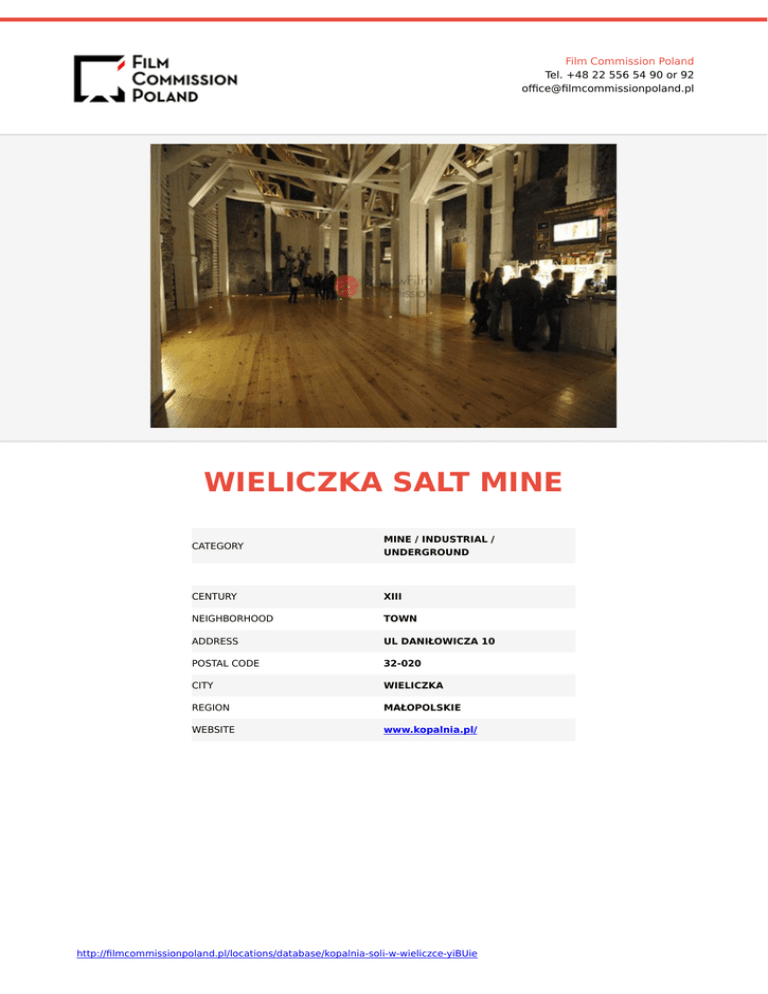 Film Commission Poland Tel. +48 22 556 54 90 or 92 office@filmcommissionpoland.pl WIELICZKA SALT MINE CATEGORY MINE / INDUSTRIAL / UNDERGROUND CENTURY XIII NEIGHBORHOOD TOWN ADDRESS UL DANIŁOWICZA 10 POSTAL CODE 32-020 CITY WIELICZKA REGION MAŁOPOLSKIE WEBSITE www.kopalnia.pl/ http://filmcommissionpoland.pl/locations/database/kopalnia-soli-w-wieliczce-yiBUie Film Commission Poland Tel. +48 22 556 54 90 or 92 office@filmcommissionpoland.pl ABOUT LOCATION Historic Wieliczka Salt Mine is the oldest Polish enterprise. From the 13th century until 1772, together with Bochnia salt mine it composed the Kraków salt works – the only mining facility operating continuously since the Middle Ages. So far the oldest discovered part of the Wieliczka salt works mined with the use of mechanical methods is the surroundings of mount (mineshaft) Goryszowski from the second half of the 13th century. The mine has 9 levels, the first – Bono – is 64 metres deep; the lowest is located 327 metres below the ground. The joint length of the tunnels connecting the excavations (drifts, ramps, chambers, lakes, shafts) exceeds 300 km. The volume of the excavation complex is about 7.5 mln m³. The salt mine interiors attracts film and TV producers ever since the end of the Second World War. Among films shot in the mine there are: “On the Silver Globe” (dir. Andrzej Żuławski), “Sexmission” (dir. Juliusz Machulski) or “The Mill and the Cross” (dir. Lech Majewski). http://filmcommissionpoland.pl/locations/database/kopalnia-soli-w-wieliczce-yiBUie