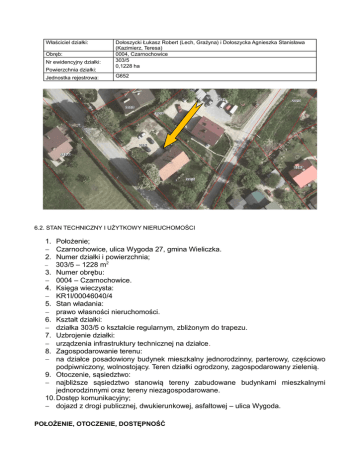 Właściciel działki: Obręb: Nr ewidencyjny działki: Powierzchnia działki: Jednostka rejestrowa: Dołoszycki Łukasz Robert (Lech, Grażyna) i Dołoszycka Agnieszka Stanisława (Kazimierz, Teresa) 0004, Czarnochowice 303/5 0,1228 ha G652 6.2. STAN TECHNICZNY I UŻYTKOWY NIERUCHOMOŚCI 1. Położenie; Czarnochowice, ulica Wygoda 27, gmina Wieliczka. 2. Numer działki i powierzchnia; – 303/5 – 1228 m2 3. Numer obrębu: 0004 – Czarnochowice. 4. Księga wieczysta: KR1I/00046040/4 5. Stan władania: prawo własności nieruchomości. 6. Kształt działki: działka 303/5 o kształcie regularnym, zbliżonym do trapezu. 7. Uzbrojenie działki: urządzenia infrastruktury technicznej na działce. 8. Zagospodarowanie terenu: na działce posadowiony budynek mieszkalny jednorodzinny, parterowy, częściowo podpiwniczony, wolnostojący. Teren działki ogrodzony, zagospodarowany zielenią. 9. Otoczenie, sąsiedztwo: najbliższe sąsiedztwo stanowią tereny zabudowane budynkami mieszkalnymi jednorodzinnymi oraz tereny niezagospodarowane. 10. Dostęp komunikacyjny; dojazd z drogi publicznej, dwukierunkowej, asfaltowej – ulica Wygoda. POŁOŻENIE, OTOCZENIE, DOSTĘPNOŚĆ Przedmiotem wyceny jest nieruchomość gruntowa położona w miejscowości Czarnochowice, ulica Wygoda, gmina Wieliczka, w powiecie wielickim, w województwie małopolskim. Powiat wielicki został utworzony w 1999 roku w ramach reformy administracyjnej państwa. Jego siedzibą jest Wieliczka. Leży w województwie małopolskim w bezpośrednim sąsiedztwie aglomeracji krakowskiej. Graniczy z powiatami: krakowskim, bocheńskim i myślenickim. W skład powiatu wchodzą gminy: miejsko-wiejskie: Wieliczka, Niepołomice oraz wiejskie: Biskupice, Gdów, Kłaj. Powiat, którego powierzchnia wynosi 411 km 2, tworzy 91 miejscowości. Daje mu to 15 miejsce wśród 22 powiatów województwa małopolskiego. Użytki rolne zajmują 64% powierzchni powiatu, lasy i tereny leśne 19%. Ludność powiatu liczy ok. 113 tys osób, z czego prawie połowa zamieszkuje gminę Wieliczka. Liczba mieszkańców powiatu wzrasta, co świadczy o jego atrakcyjności. Powiatową przestrzeń na całej długości przecina autostrada A4, stanowiąca część drogi międzynarodowej E40. Węzły komunikacyjne (zjazdy i wyjazdy) przy A4 od zachodu na styku z Krakowem w Bieżanowie a od wschodu w Targowisku. W powiecie jest bardzo dobrze rozwinięta sieć dróg lokalnych, zarówno wojewódzkich, powiatowych, jak i gminnych. Największą zaletą powiatu wielickiego są jego walory turystyczno-krajobrazowe. Magnesem przyciągającym turystów do Wieliczki jest kopalnia soli, którą odwiedza rocznie ponad milion osób. Dużym zainteresowaniem turystycznym cieszy się również Zamek Królewski w Niepołomicach. Ta renesansowa budowla nazywana „Małym Wawelem”, która była w przeszłości siedzibą królewską, jest dzisiaj miejscem, gdzie odbywają się kongresy, biesiady staropolskie i koncerty. W pobliskiej Puszczy Niepołomickiej, położonej w znacznej części w gminie Kłaj, znajduje się rezerwat „króla puszczy” – żubra. Z kolei południową część powiatu cechują wspaniałe miejsca widokowe, z których można podziwiać Kraków czy pasma gór, z Tatrami włącznie. Pogórze Wielickie przecina Dolina Raby, która należy do najchętniej odwiedzanych okolic w powiecie. Gmina Wieliczka leży na południowy - wschód od Krakowa, zajmując obszar 100,1 km 2. Jej strukturę administracyjną tworzą: miasto Wieliczka oraz 29 sołectw. Gmina graniczy: na północnym zachodzie z Krakowem, na zachodzie z gminami Świątniki i Siepraw, na wschodzie z gminami Biskupice i Niepołomice, na południu z gminami Dobczyce i Gdów. Siedziba gminy - miasto Wieliczka - zajmuje powierzchnię 13,4 km2 granicząc bezpośrednio z obszarem miejskim Krakowa. Obszar gminy Wieliczka położony jest w dorzeczu rzeki Raby, Wilgi i Serafy, które to rzeki wpływają do Wisły, stanowiącej północną granicę gminy. Ukształtowanie terenu gminy jest urozmaicone. Część południowa ma bardzo zróżnicowaną rzeźbę terenu, natomiast północna, położona w pradolinie Wisły, jest raczej nizinna. Wieliczka posiada dogodne położenie komunikacyjne. Przez obszar miasta przebiega główna magistrala kołowa Kraków - Przemyśl (droga krajowa nr 4 i europejska trasa E40). Miasto pełni funkcję lokalnego węzła komunikacji drogowej: krzyżują się tutaj szlaki komunikacyjne łączące Wieliczkę z Krakowem, Niepołomicami, Gdowem i Dobczycami. Wieliczka to najczęściej, oprócz Krakowa odwiedzane miasto Małopolski. Doskonałe położenie - bliskie sąsiedztwo głównych węzłów komunikacyjnych, piękne zabytki i nowe inwestycje władz plasują w tej chwili Wieliczkę w czołówce najatrakcyjniejszych miast Polski. Wieliczka rozwija się m.in.: dzięki opracowaniu i uchwaleniu nowego studium zagospodarowania przestrzennego, Strategii rozwoju gminy na 2007-2013 oraz wieloletniego planu inwestycyjnego. Do solnego miasta sprowadza się coraz więcej ludzi. Swoje siedziby zakładają tutaj nowe firmy. Władze mając na uwadze tempo rozwoju podkrakowskiej miejscowości starają się zapewnić zarówno mieszkańcom, jak i inwestorom jak najlepsze warunki. Dlatego opracowywany jest plan zagospodarowania przestrzennego gminy, w którym zakłada się zwiększenie terenów przeznaczonych pod mieszkalnictwo, jak i inwestycje. Na uwolnionych pod budownictwo i działalność komercyjną terenach gmina planuje budowę infrastruktury poprawiającej jakość życia mieszkańców. Lokalizacja ogólna: Lokalizacja szczegółowa: BUDYNEK MIESZKALNY - OPIS W dniu wizji lokalnej nieruchomość gruntowa była zabudowana budynkiem mieszkalnym jednorodzinnym w zabudowie wolnostojącej. Budynek murowany z cegły, parterowy, częściowo podpiwniczony. Budynek zrealizowany na początku XX wieku. Dach o konstrukcji drewnianej, nieocieplony, pokryty dachówką starego typu. Stolarka okienna oraz drzwi