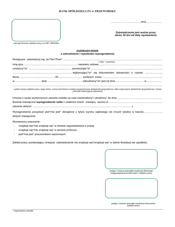 BANK SPÓŁDZIELCZY w PRZEWORSKU ......................................., dnia..................... Zaświadczenie jest ważne przez okres 30 dni od daty wystawienia pieczęć firmowa zakładu pracy (nr NIP i REGON) ZAŚWIADCZENIE o zatrudnieniu i wysokości wynagrodzenia Niniejszym zaświadcza się, że Pan*/Pani* ....................................................................................................................................... ( imię i nazwisko) imię ojca........................................................................., nazwisko rodowe....................................................................................... urodzony*/a* .......................................................... zamieszkały*/a* ................................................................................................. ..................................................................................legitymujący*/a* się dokumentem tożsamości o nazwie ........................ Seria..................................................Nr................................ wydanym przez................................................................................... w.................................... dnia ............................................... zatrudniony*/a* jest od dnia ...................................... w .................... ............................................................................................................................................................................................................ ( pełna nazwa zakładu pracy i jego adres, numer pod którym została zarejestrowana działalność gospodarcza, data rozpoczęcia działalności gospodarczej i nazwa jednostki dokonującej rejestracji) Umowa z wyżej wymienionym zawarta została na czas nieokreślony*/ określony* do dnia ............................................................. Średnie miesięczne wynagrodzenie netto z ostatnich trzech miesięcy wynosi zł.......................................................................... (słownie złotych: .......................................................................................................................................). Wynagrodzenie powyższe jest*/nie jest* obciążone z tytułu wyroku sądowego lub innych tytułów w kwocie.......................... złotych miesięcznie. Wymieniony pracownik: - znajduje się*/nie znajduje się* w okresie wypowiedzenia o pracę, - znajduje się*/nie znajduje się* w okresie próbnym, - jest*/nie jest* pracownikiem sezonowym. Zakład pracy wystawiający niniejsze zaświadczenie nie znajduje się*/znajduje się* w stanie likwidacji lub upadłości. podpis i imienna pieczątka służbowa Głównego księgowego/pracownika kadr z zakładu pracy podpis i imienna pieczątka służbowa Kierownika zakładu pracy * niepotrzebne skreślić