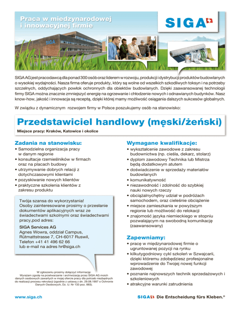 Praca w miedzynarodowej i innowacyjnej firmie SIGA AG jest pracodawcą dla ponad 300 osób oraz liderem w rozwoju, produkcji i dystrybucji produktów budowlanych o wysokiej wydajności. Nasza firma oferuje produkty, który są wolne od wszelkich szkodliwych toksyn i na potrzeby szczelnych, oddychających powłok ochronnych dla obiektów budowlanych. Dzięki zaawansowanej technologii firmy SIGA można znacznie zmniejszyć energię na ogrzewanie i chłodzenie nowych i odnawianych budynków. Nasz know-how, jakość i innowacja są receptą, dzięki której mamy możliwość osiągania dalszych sukcesów globalnych. W związku z dynamicznym rozwojem firmy w Polsce poszukujemy osób na stanowisko: Przedstawiciel handlowy (męski/żeński) Miejsce pracy: Kraków, Katowice i okolice Zadania na stanowisku: Wymagane kwalifikacje: • Samodzielna organizacja pracy w danym regionie • konsultacje rzemieślników w firmach oraz na placach budowy • utrzymywanie dobrych relacji z dotychczasowymi klientami • pozyskiwanie nowych klientów • praktyczne szkolenia klientów z zakresu produktu • wykształcenie zawodowe z zakresu budownictwa (np. cieśla, dekarz, stolarz) • dyplom zawodowy Technika lub Mistrza będą dodatkowym atutem • doświadczenie w sprzedaży materiałów budowlanych • komunikatywność • niezawodność i zdolność do szybkiej nauki nowych rzeczy • obciążalnychętny udział w podróżach samochodem, oraz cieleśnie obciążenie • miejsce zamieszkania w powyższym regionie lub możliwość do relokacji • znajomość języka niemieckiego w stopniu pozwalającym na swobodną komunikację (zaawansowany) Twója szansa do wykorzystania! Osoby zainteresowane prosimy o przesłanie dokumentów aplikacyjnych wraz ze świadectwami szkolnymi oraz świadectwami pracy,pod adres: SIGA Services AG Agnes Wowra, oddział Campus, Rütmattstrasse 7, CH-6017 Ruswil, Telefon +41 41 496 62 66 lub e-mail na adres [email protected] W zgłoszeniu prosimy dołączyć informację: Wyrażam zgodę na przetwarzanie i archiwizację przez SIGA AG moich danych osobowych zawartych w mojej ofercie pracy dla potrzeb niezbędnych do realizacji procesu rekrutacji (zgodnie z ustawą z dn. 29.08.1997 o Ochronie Danych Osobowych, Dz. U. Nr 133 poz. 883). www.siga.ch Zapewniamy: • pracę w międzynarodowej firmie o ugruntowanej pozycji na rynku • kilkutygodniowy cykl szkoleń w Szwajcarii, dzięki któremu zdobędziesz profesjonalne wprowadzenie do Twojej nowej funkcji zawodowej • poznanie najnowszych technik sprzedażowych i szkoleniowych • atrakcyjne warunki zatrudnienia SIGA Die Entscheidung fürs Kleben.®