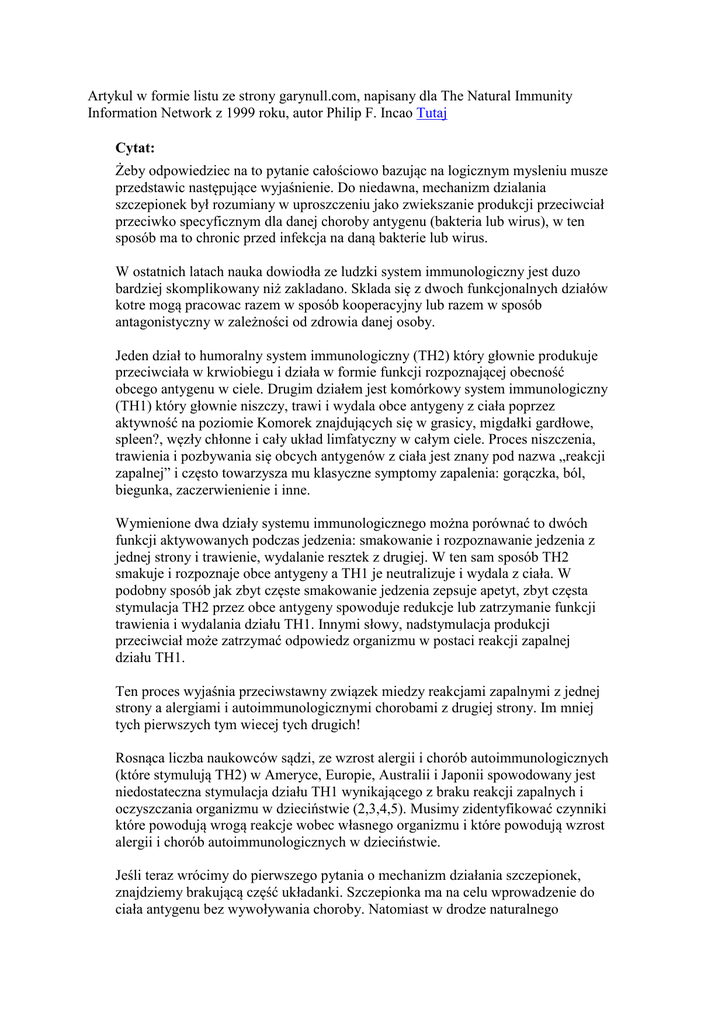 Artykul w formie listu ze strony garynull.com, napisany dla The Natural Immunity Information Network z 1999 roku, autor Philip F. Incao Tutaj Cytat: Żeby odpowiedziec na to pytanie całościowo bazując na logicznym mysleniu musze przedstawic następujące wyjaśnienie. Do niedawna, mechanizm dzialania szczepionek był rozumiany w uproszczeniu jako zwiekszanie produkcji przeciwciał przeciwko specyficznym dla danej choroby antygenu (bakteria lub wirus), w ten sposób ma to chronic przed infekcja na daną bakterie lub wirus. W ostatnich latach nauka dowiodła ze ludzki system immunologiczny jest duzo bardziej skomplikowany niż zakladano. Sklada się z dwoch funkcjonalnych działów kotre mogą pracowac razem w sposób kooperacyjny lub razem w sposób antagonistyczny w zależności od zdrowia danej osoby. Jeden dział to humoralny system immunologiczny (TH2) który głownie produkuje przeciwciała w krwiobiegu i działa w formie funkcji rozpoznającej obecność obcego antygenu w ciele. Drugim działem jest komórkowy system immunologiczny (TH1) który głownie niszczy, trawi i wydala obce antygeny z ciała poprzez aktywność na poziomie Komorek znajdujących się w grasicy, migdałki gardłowe, spleen?, węzły chłonne i cały układ limfatyczny w całym ciele. Proces niszczenia, trawienia i pozbywania się obcych antygenów z ciała jest znany pod nazwa „reakcji zapalnej” i często towarzysza mu klasyczne symptomy zapalenia: gorączka, ból, biegunka, zaczerwienienie i inne. Wymienione dwa działy systemu immunologicznego można porównać to dwóch funkcji aktywowanych podczas jedzenia: smakowanie i rozpoznawanie jedzenia z jednej strony i trawienie, wydalanie resztek z drugiej. W ten sam sposób TH2 smakuje i rozpoznaje obce antygeny a TH1 je neutralizuje i wydala z ciała. W podobny sposób jak zbyt częste smakowanie jedzenia zepsuje apetyt, zbyt częsta stymulacja TH2 przez obce antygeny spowoduje redukcje lub zatrzymanie funkcji trawienia i wydalania działu TH1. Innymi słowy, nadstymulacja produkcji przeciwciał może zatrzymać odpowiedz organizmu w postaci reakcji zapalnej działu TH1. Ten proces wyjaśnia przeciwstawny związek miedzy reakcjami zapalnymi z jednej strony a alergiami i autoimmunologicznymi chorobami z drugiej strony. Im mniej tych pierwszych tym wiecej tych drugich! Rosnąca liczba naukowców sądzi, ze wzrost alergii i chorób autoimmunologicznych (które stymulują TH2) w Ameryce, Europie, Australii i Japonii spowodowany jest niedostateczna stymulacja działu TH1 wynikającego z braku reakcji zapalnych i oczyszczania organizmu w dzieciństwie (2,3,4,5). Musimy zidentyfikować czynniki które powodują wrogą reakcje wobec własnego organizmu i które powodują wzrost alergii i chorób autoimmunologicznych w dzieciństwie. Jeśli teraz wrócimy do pierwszego pytania o mechanizm działania szczepionek, znajdziemy brakującą część układanki. Szczepionka ma na celu wprowadzenie do ciała antygenu bez wywoływania choroby. Natomiast w drodze naturalnego kontaktu antygenu z ciałem cały system immunologiczny zaczyna działać i wywołuje ewentualnie symptomy choroby. Symptomami choroby są głównie symptomy reakcji zapalnej wobec choroby. Sztuczka szczepionek polega na niewielkiej stymulacji tak aby organizm wyprodukował przeciwciała i zapamiętał antygen ale nie wywoływał reakcji zapalnej. Podsumowując szczepionki stymulują jedynie humoralną cześć TH2 i ignorują kompletnie cześć komórkową TH1. Nie trudno zauważyć dlaczego wielokrotne szczepienia doprowadzają do zaburzenia równowagi miedzy TH2 i TH1 w kierunku TH2 i jednocześnie zmniejszając znaczenie TH1. Szczepionki nie wzmacniaja i nie trenuja calego układu immunologicznego. Szczepionkom nie udaje się wstrzymać procesu choroby lecz wstrzymać odpowiedz komorkowego systemu odpornościowego który ma na celu manifestacje, odpowiedz i zwalczenie choroby. Nie ma systemu w ludzkim ciele, począwszy na umysłu, mięśni po system immunologiczny, który wzmacnia się poprzez unikanie wyzwan. Każdy z tych sytemow wzmacnia się poprzez zwalczanie wyzwan. Odpowiednie uzycie szczepionek ma sens w przypadkach indywidualnych a nie na masowa skale. Przed każdym szczepieniem które ma pomoc a nie szkodzic powinno się wiedziec na poziomie każdego szczepionego czy dzial TH1 czy TH2 dominuje. W przypadku dominacji TH1 szczepionka moglaby pomoc w odzyskaniu równowagi. W przypadku dominacji TH2 szczepionka szkodzi zdrowiu szczepionego. (...) Podsumowanie: Szczepionki nie poprawiają ogólnego stanu zdrowia ani nie trenują systemu immunologicznego. Jedynym ich działaniem jest blokowanie manifestacji choroby poprzez jednostronna modyfikacje odpowiedzi organizmu na chorobę i przyczynienie się do chronicznych alergii i chorób autoimmunologicznych Studia epidemiologiczne pokazują, ze rodziny z dobrymi warunkami bytowymi, higiena, odżywianiem i edukacja nie czerpią prawie żadnych korzyści ze szczepień. Rodziny ze złymi warunkami bytowymi mogłyby potencjalnie czerpać najwięcej profitów ze szczepień. Organizmy z tendencją do alergii lub chorób autoimmunologicznych doznają prawdopodobnie szkody na zdrowiu przez szczepienia. Efekty uboczne szczepien to najczęściej alergie lub choroby autoimmunologiczne spowodowane brakiem równowagi miedzy TH1 i TH2. Nowoczesna medycyna nie zmierzyla rzetelnie stosunku korzyści/ryzyka zadnej szczeponki (...) Należy ponadto pamiętać, ze zakazenie wirusem czy bakteria nie jest rownoznaczne z zachorowaniem chyba, ze odporność danego organizmu jest niska. W przypadku wirusa Japanese Encephalitis (JEV) tylko 0.1 % zainfekowanych zachorowalo na encephalitis. (...)