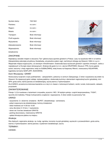 Symbol oferty: 722/1841 Państwo: no conv : Region: no conv : Miasto: no conv : Transport: Brak informacji Profil wyjazdu: Brak informacji Wyżywienie: Brak informacji Zakwaterowanie: Brak informacji Wyposażenie: Brak informacji świadczenia: ZAKOPANE Największy ośrodek miejski w otoczeniu Tatr i główna baza sportów górskich w Polsce. Leży na wysokości 830 m w kotlinie Zakopiańskiej osłoniętej od północy Gubałówką, od południa wałem regli, nad którymi dźwiga się Giewont /1894 m n.p.m./. Wspaniałe miejsce wypoczynku, ze swoistym mikroklimatem. Doskonała baza wycieczek górskich i sportów zimowych. Jedna z największych w Europie stacji rekreacyjnych. Atrakcje dla gości to m.in. słynne KRUPÓWKI, Muzeum TPN, liczne galerie sztuki, karczmy i chaty regionalne, kolej na GUBAŁÓWKĘ, kolej linowa na Kasprowy Wierch, nowoczesny AQUAPARK, kąpieliska termalne SZAFLARY, BUKOWINA. Dom Wczasowy -GRAŃ” Nowoczesny budynek w stylu podhalańsko - zakopiańskim, położony w centrum Zakopanego. Z okien rozpościera się widok na Giewont. Do dyspozycji gości oddaje: stylową jadalnię z doskonałą kuchnią z elementami regionalnej kuchni góralskiej, mini SPA: grota solna, łaźnia parowa ze światłoterapią, sauna,wanna z hydromasażem. DLA DZIECI: przestronna kolorowa bawialnia a w niej m.in.:basen z kolorowymi kulkami, zamki, tunele, kolorowanki, zabawki, przytulanki. ZAKWATEROWANIE Pokoje 1,2,3,4-osobowe z łazienkami /umywalka, prysznic i WC/. W każdym pokoju: czajnik bezprzewodowy, TVSAT, ręczniki,mini lodówka. Pokoje funkcjonalnie urządzone i wyposażone. Z okien widok na panoramę Tatr. UWAGI - wyżywienie: 2 x dziennie: śniadanie - BUFET, obiadokolacja - serwowana. - pobyt rozpoczyna się obiadokolacją i kończy śniadaniem - doba hotelowa od 14.00 do 10.00 - ceny dla dzieci 3-10 lat z 1 wyżywienia - dzieci do 3 lat bez świadczeń GRATIS - parking dozorowany, niestrzeżony GRATIS - opłata klimatyczna płatna na miejscu. Atrakcje: Dla chętnych; regionalne atrakcje, np. kuligi, ogniska, koncerty muzyki góralskiej, wycieczki z przewodnikiem ,grota solna, wanna z hydromasażem, łaźnia parowa z systemem światłoterapii, sauna. TERMINY: CENNIK: 1/2 Długość pobytu: dni Grupa cenowa: Waluta: PLN Aktualne ceny z systemu S.A.R.T. (-) - cena usługi, podatku kalkulowana przy osobie lub gratis (*) - kwota wliczona w cenę standardową 2/2