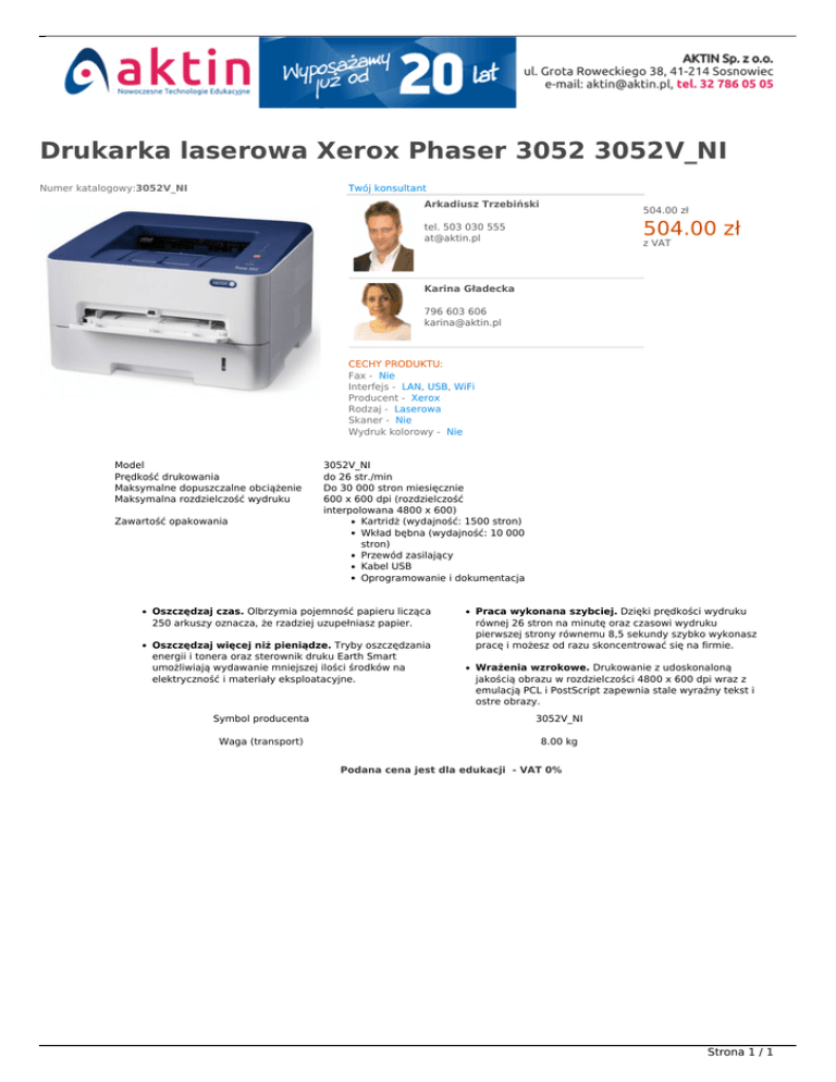 Drukarka laserowa Xerox Phaser 3052 3052V_NI Numer katalogowy:3052V_NI Twój konsultant NOWOŚĆ W OFERCIE Arkadiusz Trzebiński 504.00 zł 504.00 zł tel. 503 030 555 [email protected] z VAT Karina Gładecka 796 603 606 [email protected] CECHY PRODUKTU: Fax - Nie Interfejs - LAN, USB, WiFi Producent - Xerox Rodzaj - Laserowa Skaner - Nie Wydruk kolorowy - Nie Model Prędkość drukowania Maksymalne dopuszczalne obciążenie Maksymalna rozdzielczość wydruku Zawartość opakowania 3052V_NI do 26 str./min Do 30 000 stron miesięcznie 600 x 600 dpi (rozdzielczość interpolowana 4800 x 600) Kartridż (wydajność: 1500 stron) Wkład bębna (wydajność: 10 000 stron) Przewód zasilający Kabel USB Oprogramowanie i dokumentacja Oszczędzaj czas. Olbrzymia pojemność papieru licząca 250 arkuszy oznacza, że rzadziej uzupełniasz papier. Oszczędzaj więcej niż pieniądze. Tryby oszczędzania energii i tonera oraz sterownik druku Earth Smart umożliwiają wydawanie mniejszej ilości środków na elektryczność i materiały eksploatacyjne. Praca wykonana szybciej. Dzięki prędkości wydruku równej 26 stron na minutę oraz czasowi wydruku pierwszej strony równemu 8,5 sekundy szybko wykonasz pracę i możesz od razu skoncentrować się na firmie. Wrażenia wzrokowe. Drukowanie z udoskonaloną jakością obrazu w rozdzielczości 4800 x 600 dpi wraz z emulacją PCL i PostScript zapewnia stale wyraźny tekst i ostre obrazy. Symbol producenta 3052V_NI Waga (transport) 8.00 kg Podana cena jest dla edukacji - VAT 0% Strona 1 / 1 Powered by TCPDF (www.tcpdf.org)