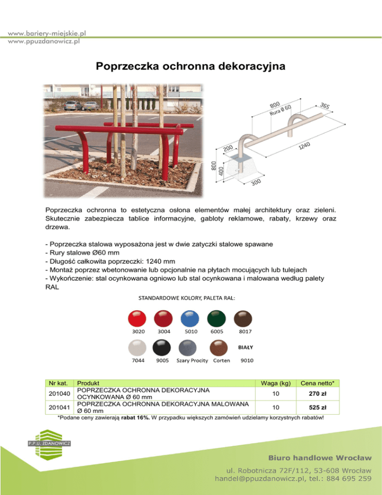 Poprzeczka ochronna dekoracyjna Poprzeczka ochronna to estetyczna osłona elementów małej architektury oraz zieleni. Skutecznie zabezpiecza tablice informacyjne, gabloty reklamowe, rabaty, krzewy oraz drzewa. - Poprzeczka stalowa wyposażona jest w dwie zatyczki stalowe spawane - Rury stalowe Ø60 mm - Długość całkowita poprzeczki: 1240 mm - Montaż poprzez wbetonowanie lub opcjonalnie na płytach mocujących lub tulejach - Wykończenie: stal ocynkowana ogniowo lub stal ocynkowana i malowana według palety RAL Nr kat. 201040 201041 Produkt POPRZECZKA OCHRONNA DEKORACYJNA OCYNKOWANA Ø 60 mm POPRZECZKA OCHRONNA DEKORACYJNA MALOWANA Ø 60 mm Waga (kg) Cena netto* 10 270 zł 10 525 zł *Podane ceny zawierają rabat 16%. W przypadku większych zamówień udzielamy korzystnych rabatów!