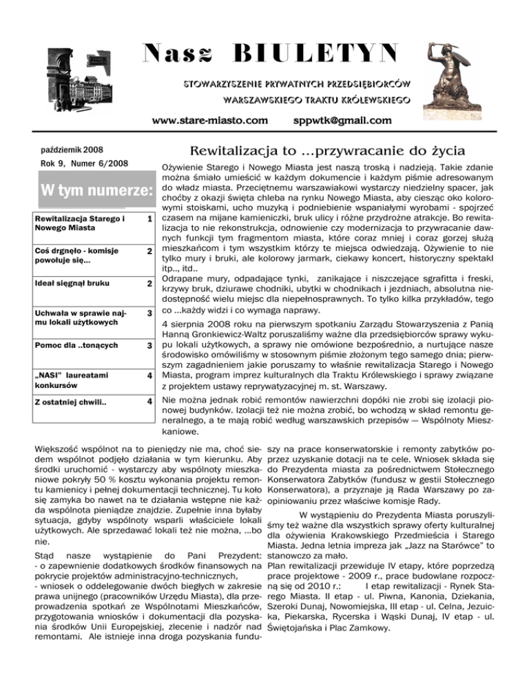 N a s z B I U L E TY N STOWARZYSZENIE PRYWATNYCH PRZEDSIĘBIORCÓW WARSZAWSKIEGO TRAKTU KRÓLEWSKIEGO www.starewww.stare-miasto.com Rewitalizacja to ...przywracanie do życia październik 2008 Rok 9, Numer 6/2008 W tym numerze: Rewitalizacja Starego i Nowego Miasta 1 Coś drgnęło - komisje powołuje się... 2 Ideał sięgnął bruku 2 Uchwała w sprawie najmu lokali użytkowych 3 Pomoc dla ..tonących „NASI” laureatami konkursów Z ostatniej chwili.. [email protected] Ożywienie Starego i Nowego Miasta jest naszą troską i nadzieją. Takie zdanie można śmiało umieścić w każdym dokumencie i każdym piśmie adresowanym do władz miasta. Przeciętnemu warszawiakowi wystarczy niedzielny spacer, jak choćby z okazji święta chleba na rynku Nowego Miasta, aby ciesząc oko kolorowymi stoiskami, ucho muzyką i podniebienie wspaniałymi wyrobami - spojrzeć czasem na mijane kamieniczki, bruk ulicy i różne przydrożne atrakcje. Bo rewitalizacja to nie rekonstrukcja, odnowienie czy modernizacja to przywracanie dawnych funkcji tym fragmentom miasta, które coraz mniej i coraz gorzej służą mieszkańcom i tym wszystkim którzy te miejsca odwiedzają. Ożywienie to nie tylko mury i bruki, ale kolorowy jarmark, ciekawy koncert, historyczny spektakl itp.., itd.. Odrapane mury, odpadające tynki, zanikające i niszczejące sgrafitta i freski, krzywy bruk, dziurawe chodniki, ubytki w chodnikach i jezdniach, absolutna niedostępność wielu miejsc dla niepełnosprawnych. To tylko kilka przykładów, tego co ...każdy widzi i co wymaga naprawy. 4 sierpnia 2008 roku na pierwszym spotkaniu Zarządu Stowarzyszenia z Panią Hanną Gronkiewicz-Waltz poruszaliśmy ważne dla przedsiębiorców sprawy wyku3 pu lokali użytkowych, a sprawy nie omówione bezpośrednio, a nurtujące nasze środowisko omówiliśmy w stosownym piśmie złożonym tego samego dnia; pierwszym zagadnieniem jakie poruszamy to właśnie rewitalizacja Starego i Nowego 4 Miasta, program imprez kulturalnych dla Traktu Królewskiego i sprawy związane z projektem ustawy reprywatyzacyjnej m. st. Warszawy. 4 Nie można jednak robić remontów nawierzchni dopóki nie zrobi się izolacji pionowej budynków. Izolacji też nie można zrobić, bo wchodzą w skład remontu generalnego, a te mają robić według warszawskich przepisów — Wspólnoty Mieszkaniowe. Większość wspólnot na to pieniędzy nie ma, choć siedem wspólnot podjęło działania w tym kierunku. Aby środki uruchomić - wystarczy aby wspólnoty mieszkaniowe pokryły 50 % kosztu wykonania projektu remontu kamienicy i pełnej dokumentacji technicznej. Tu koło się zamyka bo nawet na te działania wstępne nie każda wspólnota pieniądze znajdzie. Zupełnie inna byłaby sytuacja, gdyby wspólnoty wsparli właściciele lokali użytkowych. Ale sprzedawać lokali też nie można, ...bo nie. Stąd nasze wystąpienie do Pani Prezydent: - o zapewnienie dodatkowych środków finansowych na pokrycie projektów administracyjno-technicznych, - wniosek o oddelegowanie dwóch biegłych w zakresie prawa unijnego (pracowników Urzędu Miasta), dla przeprowadzenia spotkań ze Wspólnotami Mieszkańców, przygotowania wniosków i dokumentacji dla pozyskania środków Unii Europejskiej, zlecenie i nadzór nad remontami. Ale istnieje inna droga pozyskania fundu- szy na prace konserwatorskie i remonty zabytków poprzez uzyskanie dotacji na te cele. Wniosek składa się do Prezydenta miasta za pośrednictwem Stołecznego Konserwatora Zabytków (fundusz w gestii Stołecznego Konserwatora), a przyznaje ją Rada Warszawy po zaopiniowaniu przez właściwe komisje Rady. W wystąpieniu do Prezydenta Miasta poruszyliśmy też ważne dla wszystkich sprawy oferty kulturalnej dla ożywienia Krakowskiego Przedmieścia i Starego Miasta. Jedna letnia impreza jak „Jazz na Starówce” to stanowczo za mało. Plan rewitalizacji przewiduje IV etapy, które poprzedzą prace projektowe - 2009 r., prace budowlane rozpoczną się od 2010 r.: I etap rewitalizacji - Rynek Starego Miasta. II etap - ul. Piwna, Kanonia, Dziekania, Szeroki Dunaj, Nowomiejska, III etap - ul. Celna, Jezuicka, Piekarska, Rycerska i Wąski Dunaj, IV etap - ul. Świętojańska i Plac Zamkowy. 2 Rewitalizacja w praktyce, czyli coś drgnęło... powołania Komisji ds. opracowania programu artystycznych imprez plenerowych dla Traktu Królewskiego. Jak czytamy w stosownym dokumencie — w skład powołanej Komisji wchodzą z-ca burmistrza, naczelnik Wydziału Kultury, pracownicy Wydziału Kultury i Wydziału Organizacyjnego. W jej pracach mogą uczestniczyć takie osoby jak dyrektor Domu Kultury, naczelnik Wydziału Imprez Miejskich Biura Promocji, pracownik Zarządu Terenów Publicznych, reprezentanci Stowarzyszeń Mieszkańców i Wspólnot Starego i Nowego Miasta, reprezentanci naszego Stowarzyszenia. Komisja ta ma składać sprawozdania kwartalne ze swej pracy i odpowiednie wnioski dotyczące wypracowanego pro25 września 2008 roku odbyło się spotkanie z wiceburmistrzem Dzielnicy Śródmieście - Panem Jerzym Ma- gramu w zakresie oferty kulturalnej. jewskim, przy udziale przedstawicieli Zarządów Wspól- Ze strony Stowarzyszenia w pracach nad tą ofertą not Mieszkaniowych, gdzie omawiano szczegółowo uczestniczyć będą Panowie: Jacek Zawistowski i Jacek Sas-Uhrynowski. obowiązki i możliwości działania stron. Można powiedzieć, że coś drgnęło bo dzięki naszym interwencjom, spotkaniom i licznym pismom władze miasta zaczęły także widzieć konieczność lepszej współpracy ze Wspólnotami Mieszkańców, organizacjami przedsiębiorców i organizacjami pozarządowymi. Piszemy często o rzeczach dość oczywistych, ale powrót do prawd jasnych i prostych to też - rewitalizacja choćby w myśleniu. Nie ma sprzedaży lokali dla ich wieloletnich najemców, nie ma kto wnieść odpowiednich wkładów do wspólnot, tym samym nie ma nie tylko na remonty, ale i na podstawową dokumentację. Ale kropla drąży skałę i... 