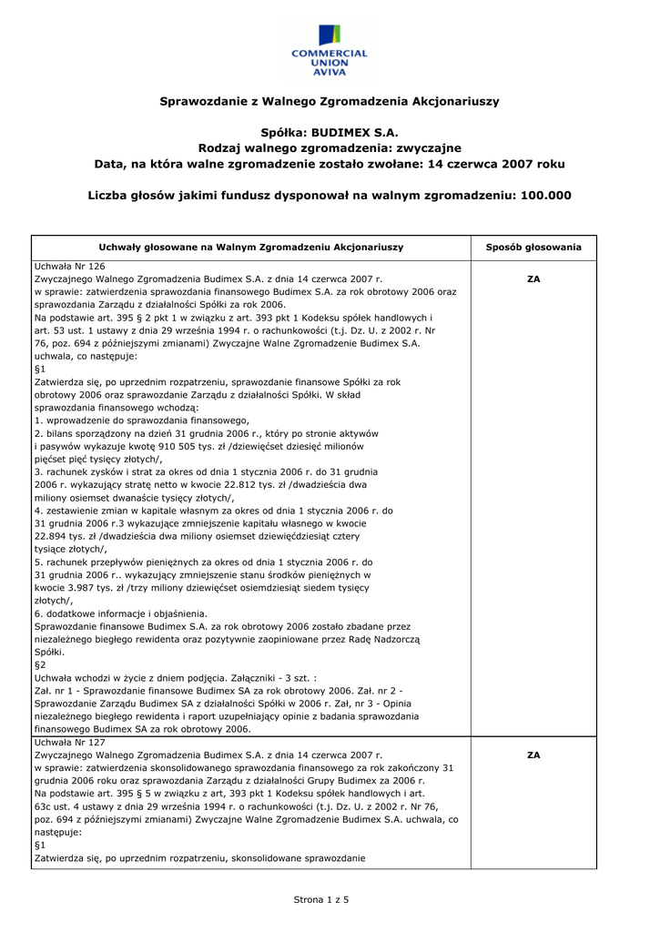 Sprawozdanie z Walnego Zgromadzenia Akcjonariuszy Spółka: BUDIMEX S.A. Rodzaj walnego zgromadzenia: zwyczajne Data, na która walne zgromadzenie zostało zwołane: 14 czerwca 2007 roku Liczba głosów jakimi fundusz dysponował na walnym zgromadzeniu: 100.000 Uchwały głosowane na Walnym Zgromadzeniu Akcjonariuszy Uchwała Nr 126 Zwyczajnego Walnego Zgromadzenia Budimex S.A. z dnia 14 czerwca 2007 r. w sprawie: zatwierdzenia sprawozdania finansowego Budimex S.A. za rok obrotowy 2006 oraz sprawozdania Zarządu z działalności Spółki za rok 2006. Na podstawie art. 395 § 2 pkt 1 w związku z art. 393 pkt 1 Kodeksu spółek handlowych i art. 53 ust. 1 ustawy z dnia 29 września 1994 r. o rachunkowości (t.j. Dz. U. z 2002 r. Nr 76, poz. 694 z późniejszymi zmianami) Zwyczajne Walne Zgromadzenie Budimex S.A. uchwala, co następuje: §1 Zatwierdza się, po uprzednim rozpatrzeniu, sprawozdanie finansowe Spółki za rok obrotowy 2006 oraz sprawozdanie Zarządu z działalności Spółki. W skład sprawozdania finansowego wchodzą: 1. wprowadzenie do sprawozdania finansowego, 2. bilans sporządzony na dzień 31 grudnia 2006 r., który po stronie aktywów i pasywów wykazuje kwotę 910 505 tys. zł /dziewięćset dziesięć milionów pięćset pięć tysięcy złotych/, 3. rachunek zysków i strat za okres od dnia 1 stycznia 2006 r. do 31 grudnia 2006 r. wykazujący stratę netto w kwocie 22.812 tys. zł /dwadzieścia dwa miliony osiemset dwanaście tysięcy złotych/, 4. zestawienie zmian w kapitale własnym za okres od dnia 1 stycznia 2006 r. do 31 grudnia 2006 r.3 wykazujące zmniejszenie kapitału własnego w kwocie 22.894 tys. zł /dwadzieścia dwa miliony osiemset dziewięćdziesiąt cztery tysiące złotych/, 5. rachunek przepływów pieniężnych za okres od dnia 1 stycznia 2006 r. do 31 grudnia 2006 r.. wykazujący zmniejszenie stanu środków pieniężnych w kwocie 3.987 tys. zł /trzy miliony dziewięćset osiemdziesiąt siedem tysięcy złotych/, 6. dodatkowe informacje i objaśnienia. Sprawozdanie finansowe Budimex S.A. za rok obrotowy 2006 zostało zbadane przez niezależnego biegłego rewidenta oraz pozytywnie zaopiniowane przez Radę Nadzorczą Spółki. §2 Uchwała wchodzi w życie z dniem podjęcia. Załączniki - 3 szt. : Zał. nr 1 - Sprawozdanie finansowe Budimex SA za rok obrotowy 2006. Zał. nr 2 Sprawozdanie Zarządu Budimex SA z działalności Spółki w 2006 r. Zał, nr 3 - Opinia niezależnego biegłego rewidenta i raport uzupełniający opinie z badania sprawozdania finansowego Budimex SA za rok obrotowy 2006. Uchwała Nr 127 Zwyczajnego Walnego Zgromadzenia Budimex S.A. z dnia 14 czerwca 2007 r. w sprawie: zatwierdzenia skonsolidowanego sprawozdania finansowego za rok zakończony 31 grudnia 2006 roku oraz sprawozdania Zarządu z działalności Grupy Budimex za 2006 r. Na podstawie art. 395 § 5 w związku z art, 393 pkt 1 Kodeksu spółek handlowych i art. 63c ust. 4 ustawy z dnia 29 września 1994 r. o rachunkowości (t.j. Dz. U. z 2002 r. Nr 76, poz. 694 z późniejszymi zmianami) Zwyczajne Walne Zgromadzenie Budimex S.A. uchwala, co następuje: §1 Zatwierdza się, po uprzednim rozpatrzeniu, skonsolidowane sprawozdanie Strona 1 z 5 Sposób głosowania ZA ZA finansowe za rok zakończony 31 grudnia 2006 roku oraz sprawozdanie Zarządu z działalności Grupy Budimex za 2006 r. W skład skonsolidowanego sprawozdania finansowego wchodzą: 1. skonsolidowany bilans sporządzony na dzień 31 grudnia 2006 r., który po stronie aktywów i pasywów wykazuje sumę 2.238.338 tys. zł. /dwa miliardy dwieście trzydzieści osiem milionów trzysta trzydzieści osiem tysięcy złotych/, 2. skonsolidowany rachunek zysków i strat za okres od 1 stycznia 2006 roku do 31 grudnia 2006 roku wykazujący zysk netto w kwocie 3.976 tys. zł /trzy miliony dziewięćset siedemdziesiąt sześć tysięcy złotych/, 3. zestawienie zmian w skonsolidowanym kapitale własnym za okres od 1 stycznia 2006 roku do 31 grudnia 2006 roku wykazujące zwiększenie kapitału własnego w kwocie 1.718 tys. zł /jeden milion siedemset osiemnaście tysięcy złotych/, 4. skonsolidowany rachunek przepływów pieniężnych za okres od 1 stycznia 2006 roku do 31 grudnia 2006 roku wykazujący zwiększenie stanu środków pieniężnych w kwocie 32.047 tys. zł /trzydzieści dwa miliony czterdzieści siedem tysięcy złotych/. 5. dodatkowe informacje i objaśnienia. Skonsolidowane sprawozdanie finansowe zostało zbadane przez niezależnego biegłego rewidenta oraz pozytywnie zaopiniowane przez Radę Nadzorczą Budimex S.A. §2 Uchwała wchodzi w życie z dniem podjęcia. Załączniki - 3 szt.: Zał. nr 1 - Skonsolidowane sprawozdanie finansowe za rok zakończony 31 grudnia 2006 roku. Zał. nr 2 - Sprawozdanie Zarządu z działalności Grupy Budimex za 2006 r. Zał. nr 3 - Opinia niezależnego biegłego rewidenta i raport uzupełniający z badania skonsolidowanego sprawozdania finansowego za rok zakończony 31 grudnia 2006 roku. Uchwała Nr 128 Zwyczajnego Walnego Zgromadzenia Budiraex S.A. z dnia 14 czerwca 2007 r. w sprawie: pokrycia straty za 2006 r. Na podstawie art. 395 § 2 pkt 2 Kodeksu spółek handlowych Zwyczajne Walne Zgromadzenie Budimex S.A. uchwala, co następuje: §1 Stratę netto za okres od 1 stycznia 2006 r. do 31 grudnia 2006 r. w kwocie 22.812 tys. zł. /dwadzieścia dwa miliony osiemset dwanaście tysięcy złotych/ postanawia się pokryć w całości z kapitału zapasowego. §2 Uchwała wchodzi w życie z dniem podjęcia. Uchwała Nr 129 Zwyczajnego Walnego Zgromadzenia Budimex S.A. z dnia 14 czerwca 2007 r. w sprawie: udzielenia członkom Zarządu Budimex S.A. absolutorium z wykonania obowiązków w 2006 r. Na podstawie art. 395 § 2 pkt 3 Kodeksu spółek handlowych Zwyczajne Walne Zgromadzenie Budimex S.A. uchwala, co następuje: Q1 Pozytywnie oceniając działalność Spółki w 2006 roku, na wniosek Rady Nadzorczej, udziela się absolutorium z wykonania obowiązków za następujące okr