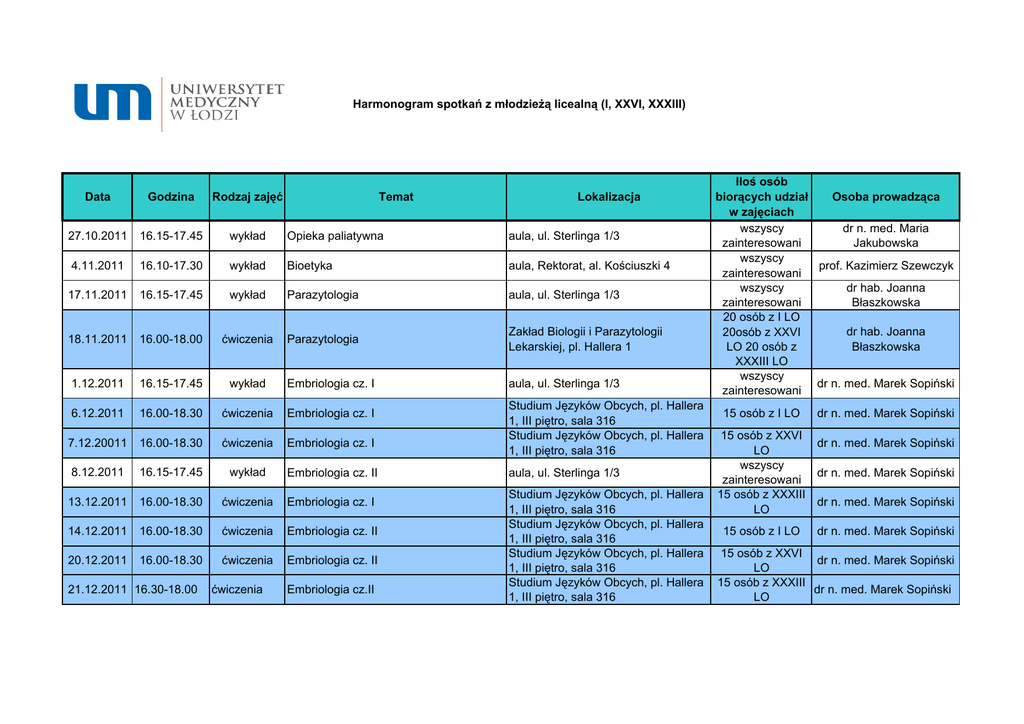 Harmonogram spotkań z młodzieżą licealną (I, XXVI, XXXIII) Data Godzina Rodzaj zajęć 27.10.2011 16.15-17.45 wykład Opieka paliatywna aula, ul. Sterlinga 1/3 4.11.2011 16.10-17.30 wykład Bioetyka aula, Rektorat, al. Kościuszki 4 17.11.2011 16.15-17.45 wykład Parazytologia aula, ul. Sterlinga 1/3 18.11.2011 16.00-18.00 ćwiczenia Parazytologia Zakład Biologii i Parazytologii Lekarskiej, pl. Hallera 1 1.12.2011 16.15-17.45 wykład Embriologia cz. I aula, ul. Sterlinga 1/3 6.12.2011 16.00-18.30 ćwiczenia Embriologia cz. I 7.12.20011 16.00-18.30 ćwiczenia Embriologia cz. I 8.12.2011 16.15-17.45 wykład Embriologia cz. II 13.12.2011 16.00-18.30 ćwiczenia Embriologia cz. I 14.12.2011 16.00-18.30 ćwiczenia Embriologia cz. II 20.12.2011 16.00-18.30 ćwiczenia Embriologia cz. II 21.12.2011 16.30-18.00 ćwiczenia Temat Embriologia cz.II Lokalizacja Studium Języków Obcych, pl. Hallera 1, III piętro, sala 316 Studium Języków Obcych, pl. Hallera 1, III piętro, sala 316 aula, ul. Sterlinga 1/3 Studium Języków Obcych, pl. Hallera 1, III piętro, sala 316 Studium Języków Obcych, pl. Hallera 1, III piętro, sala 316 Studium Języków Obcych, pl. Hallera 1, III piętro, sala 316 Studium Języków Obcych, pl. Hallera 1, III piętro, sala 316 Iloś osób biorących udział Osoba prowadząca w zajęciach wszyscy dr n. med. Maria zainteresowani Jakubowska wszyscy prof. Kazimierz Szewczyk zainteresowani wszyscy dr hab. Joanna zainteresowani Błaszkowska 20 osób z I LO dr hab. Joanna 20osób z XXVI Błaszkowska LO 20 osób z XXXIII LO wszyscy dr n. med. Marek Sopiński zainteresowani 15 osób z I LO dr n. med. Marek Sopiński 15 osób z XXVI dr n. med. Marek Sopiński LO wszyscy dr n. med. Marek Sopiński zainteresowani 15 osób z XXXIII dr n. med. Marek Sopiński LO 15 osób z I LO dr n. med. Marek Sopiński 15 osób z XXVI dr n. med. Marek Sopiński LO 15 osób z XXXIII dr n. med. Marek Sopiński LO Odpowiedź immunologiczna nieswoista i aula, ul. Sterlinga 1/3 swoista na czynniki infekcyjne. Nabyty zespół niedoborów odporności - AIDS. wszyscy zainteresowani mgr Magdalena Kujawiak prof. Janina Grzegorczyk 30 osób z XXVI LO dr Małgorzata Brauncajs dr Beata Zarzycka dr Agnieszka Kiryszewska Mikrobiologia cz.I Zakład Mikrobiologii i Laboratoryjnej 30 osób z XXXIII Immunologii Medycznej, ul. Pomorska LO 251, budynek C5 dr Małgorzata Brauncajs dr Beata Zarzycka dr Agnieszka Kiryszewska ćwiczenia Mikrobiologia cz.I Zakład Mikrobiologii i Laboratoryjnej Immunologii Medycznej, ul. Pomorska 251, budynek C5 30 osób z I LO dr Małgorzata Brauncajs dr Beata Zarzycka dr Agnieszka Kiryszewska 8.30-10.45 ćwiczenia Mikrobiologia cz.II Zakład Mikrobiologii i Laboratoryjnej Immunologii Medycznej, ul. Pomorska 251, budynek C5 30 osób z XXVI LO dr Małgorzata Brauncajs dr Beata Zarzycka dr Agnieszka Kiryszewska 10.01.2011 10.45-13.00 ćwiczenia Mikrobiologia cz.II Zakład Mikrobiologii i Laboratoryjnej 30 osób z XXXIII Immunologii Medycznej, ul. Pomorska LO 251, budynek C5 dr Małgorzata Brauncajs dr Beata Zarzycka dr Agnieszka Kiryszewska 10.01.2011 13.00-15.15 ćwiczenia Mikrobiologia cz.II Zakład Mikrobiologii i Laboratoryjnej Immunologii Medycznej, ul. Pomorska 251, budynek C5 dr Małgorzata Brauncajs dr Beata Zarzycka dr Agnieszka Kiryszewska 10.01.2011 15.15-17.30 ćwiczenia Immunologia 12.01.2011 8.15-10.30 ćwiczenia Immunologia 12.01.2011 10.30-12.45 ćwiczenia Immunologia 5.01.2011 16.15-17.45 wykład 9.01.2011 8.30-10.45 ćwiczenia Mikrobiologia cz.I Zakład Mikrobiologii i Laboratoryjnej Immunologii Medycznej, ul. Pomorska 251, budynek C5 9.01.2011 10.45-13.00 ćwiczenia 9.01.2011 13.00-15.15 10.01.2011 30 osób z I LO Zakład Mikrobiologii i Laboratoryjnej Immunologii Medycznej, ul. Pomorska 30 osób z I LO 251, budynek C5 Zakład Mikrobiologii i Laboratoryjnej 30 osób z XXVI Immunologii Medycznej, ul. Pomorska LO 251, budynek C5 Zakład Mikrobiologii i Laboratoryjnej 30 osób z XXXIII Immunologii Medycznej, ul. Pomorska LO 251, budynek C5 mgr Magdalena Kujawiak mgr Anna Michalak mgr Agata Kubicka-Sierszeń mgr Magdalena Kujawiak mgr Anna Michalak mgr Agata Kubicka-Sierszeń mgr Magdalena Kujawiak mgr Anna Michalak mgr Agata Kubicka-Sierszeń