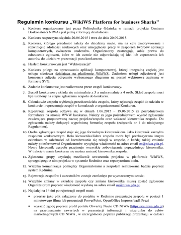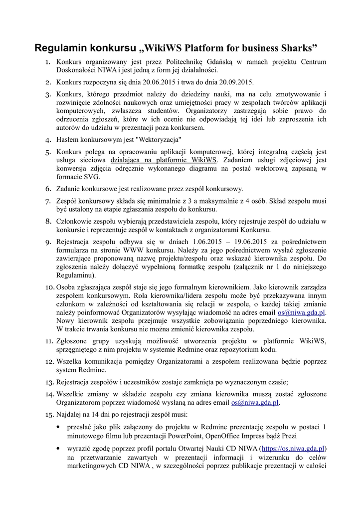 Regulamin konkursu „WikiWS Platform for business Sharks” 1. Konkurs organizowany jest przez Politechnikę Gdańską w ramach projektu Centrum Doskonałości NIWA i jest jedną z form jej działalności. 2. Konkurs rozpoczyna się dnia 20.06.2015 i trwa do dnia 20.09.2015. 3. Konkurs, którego przedmiot należy do dziedziny nauki, ma na celu zmotywowanie i rozwinięcie zdolności naukowych oraz umiejętności pracy w zespołach twórców aplikacji komputerowych, zwłaszcza studentów. Organizatorzy zastrzegają sobie prawo do odrzucenia zgłoszeń, które w ich ocenie nie odpowiadają tej idei lub zaproszenia ich autorów do udziału w prezentacji poza konkursem. 4. Hasłem konkursowym jest "Wektoryzacja" 5. Konkurs polega na opracowaniu aplikacji komputerowej, której integralną częścią jest usługa sieciowa działająca na platformie WikiWS. Zadaniem usługi zdjęciowej jest konwersja zdjęcia odręcznie wykonanego diagramu na postać wektorową zapisaną w formacie SVG. 6. Zadanie konkursowe jest realizowane przez zespół konkursowy. 7. Zespół konkursowy składa się minimalnie z 3 a maksymalnie z 4 osób. Skład zespołu musi być ustalony na etapie zgłaszania zespołu do konkursu. 8. Członkowie zespołu wybierają przedstawiciela zespołu, który rejestruje zespół do udziału w konkursie i reprezentuje zespół w kontaktach z organizatorami Konkursu. 9. Rejestracja zespołu odbywa się w dniach 1.06.2015 – 19.06.2015 za pośrednictwem formularza na stronie WWW konkursu. Należy za jego pośrednictwem wysłać zgłoszenie zawierające proponowaną nazwę projektu/zespołu oraz wskazać kierownika zespołu. Do zgłoszenia należy dołączyć wypełnioną formatkę zespołu (załącznik nr 1 do niniejszego Regulaminu). 10. Osoba zgłaszająca zespół staje się jego formalnym kierownikiem. Jako kierownik zarządza zespołem konkursowym. Rola kierownika/lidera zespołu może być przekazywana innym członkom w zależności od kształtowania się relacji w zespole, o każdej takiej zmianie należy poinformować Organizatorów wysyłając wiadomość na adres email [email protected]. Nowy kierownik zespołu przejmuje wszystkie zobowiązania poprzedniego kierownika. W trakcie trwania konkursu nie można zmienić kierownika zespołu. 11. Zgłoszone grupy uzyskują możliwość utworzenia projektu w platformie WikiWS, sprzęgniętego z nim projektu w systemie Redmine oraz repozytorium kodu. 12. Wszelka komunikacja pomiędzy Organizatorami a zespołem realizowana będzie poprzez system Redmine. 13. Rejestracja zespołów i uczestników zostaje zamknięta po wyznaczonym czasie; 14. Wszelkie zmiany w składzie zespołu czy zmiana kierownika muszą zostać zgłoszone Organizatorom poprzez wiadomość wysłaną na adres email [email protected]. 15. Najdalej na 14 dni po rejestracji zespół musi: przesłać jako plik załączony do projektu w Redmine prezentację zespołu w postaci 1 minutowego filmu lub prezentacji PowerPoint, OpenOffice Impress bądź Prezi wyrazić zgodę poprzez profil portalu Otwartej Nauki CD NIWA (https://os.niwa.gda.pl) na przetwarzanie zawartych w prezentacji informacji i wizerunku do celów marketingowych CD NIWA , w szczególności poprzez publikacje prezentacji w całości lub w częściach na stronie www Konkursu i w mediach społecznościowych CD NIWA, oraz do generowania zagregowanych informacji o konkursie i jego przebiegu. 16. Członkowie zespołu zobowiązani są do udziału w testach oceny predyspozycji do pracy zespołowej na etapie zgłaszania zespołu do konkursu. Formularze testów zostaną dostarczone przez organizatora konkursu. 17. Członkowie zespołu zobowiązani są do udziału w ankietach oceny pracy zespołowej na poszczególnych etapach realizacji zadania konkursowego. Formularze oceny zostaną dostarczone przez organizatora konkursu. 18. Aplikacje realizowane na potrzeby konkursu powinny być tworzone z wykorzystaniem języka Java lub C#. Analogicznie usługi sieciowe wdrażane poprzez platformę WikiWS powinny zostać napisane w języku Java (JAX-WS) lub C#. 19. Wszelkie zasoby wykorzystane w trakcie realizacji zadania konkursowego muszą pochodzić z legalnych źródeł, a członkowie zespołów muszą posiadać do nich pełne autorskie prawa majątkowe bądź licencję na korzystanie z tych zasobów. 20.Wytworzony w trakcie konkursu kod musi być składowany w dostarczonym przez organizatorów repozytorium kodu a jego dokumentacja powinna zostać tworzona jako strony wiki projektu w platformie Redmine. Zaleca się by pozostałe zadania związane z realizacją projektu konkursowego również były realizowane poprzez dostarczony system Redmine. 21. Zabronione jest korzystanie z komercyjnych rozwiązań, modułów i bibliotek z wyjątkiem tych dostarczonych przez organizatorów konkursu. 22. Dozwolone jest: 1. Wykorzystywanie bibliotek i modułów środowiska programistycznego. 2. Korzystanie z otwartych rozwiązań, modułów i bibliotek o ile licencja na korzystanie z nich nie wymusza zastosowania określonej licencji dla dzieła pochodnego. 3. Korzystanie z własnych, również komercyjnych rozwiązań, do których zespół posiada pełnię praw autorskich majątkowych po wcześniejszym uzgodnieniu drogą mailową tego faktu z organizatorami konkursu przed jego rozpoczęciem. 4. Korzystanie z narzędzi do tworzenia zasobów graficznych takich jak programy graficzne, dźwiękowe czy modelujące. 23. Organizatorzy zapewniają uczestnikom konkursu dostęp do platformy WikiWS poprzez sieć Internet. 24. Po zakończeniu czasu przeznaczonego na tworzenie rozwiązań każdy z zespołów zobowiązany jest do przekazania organizatorom działającej wersji aplikacji. Termin na przekazanie rozwiązań mija 20.09.2015. 25. Zespoły zobowiązują się również dołączyć kody źródłowe aplikacji powstałych w trakcie konkursu oraz wszelkie niezbędne do jego kompilacji biblioteki bądź opis skąd można je pobrać wraz z wytworzoną d