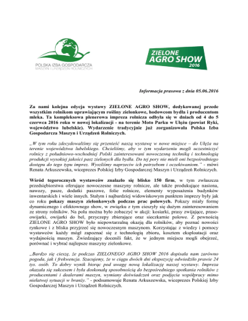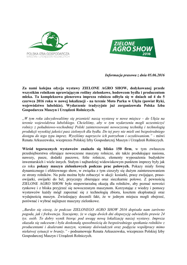 Informacja prasowa z dnia 05.06.2016 Za nami kolejna edycja wystawy ZIELONE AGRO SHOW, dedykowanej przede wszystkim rolnikom uprawiającym rośliny zielonkowe, hodowcom bydła i producentom mleka. Ta kompleksowa plenerowa impreza rolnicza odbyła się w dniach od 4 do 5 czerwca 2016 roku w nowej lokalizacji - na terenie Moto Parku w Ułężu (powiat Ryki, województwo lubelskie). Wydarzenie tradycyjnie już zorganizowała Polska Izba Gospodarcza Maszyn i Urządzeń Rolniczych. „W tym roku zdecydowaliśmy się przenieść naszą wystawę w nowe miejsce – do Ułęża na terenie województwa lubelskiego. Chcieliśmy, aby w tym wydarzeniu mogli uczestniczyć rolnicy z południowo-wschodniej Polski zainteresowani nowoczesną techniką i technologią produkcji wysokiej jakości pasz zielonych dla bydła. Do tej pory nie mieli oni bezpośredniego dostępu do tego typu imprez. Wyszliśmy naprzeciw ich potrzebom i oczekiwaniom.” - mówi Renata Arkuszewska, wiceprezes Polskiej Izby Gospodarczej Maszyn i Urządzeń Rolniczych. Wśród tegorocznych wystawców znalazło się blisko 150 firm, w tym zwłaszcza przedsiębiorstwa oferujące nowoczesne maszyny rolnicze, ale także produkujące nasiona, nawozy, pasze, dodatki paszowe, folie rolnicze, elementy wyposażenia budynków inwentarskich i wiele innych. Stałym i najbardziej widowiskowym punktem imprezy były jak co roku pokazy maszyn zielonkowych podczas prac polowych. Pokazy miały formę dynamicznego i efektownego show, w związku z tym cieszyły się dużym zainteresowaniem ze strony rolników. Na polu można było zobaczyć w akcji: kosiarki, prasy zwijające, prasoowijarki, owijarki do bel, przyczepy zbierające oraz sieczkarnie polowe. Z pewnością ZIELONE AGRO SHOW było niepowtarzalną okazją dla rolników, aby poznać nowości rynkowe i z bliska przyjrzeć się nowoczesnym maszynom. Korzystając z wiedzy i pomocy wystawców każdy mógł zapoznać się z technologią zbioru, kosztem eksploatacji oraz wydajnością maszyn. Zwiedzający docenili fakt, że w jednym miejscu mogli obejrzeć, porównać i wybrać najlepsze maszyny zielonkowe. „Bardzo się cieszę, że podczas ZIELONEGO AGRO SHOW 2016 dopisała nam zarówno pogoda, jak i frekwencja. Szacujemy, że w ciągu dwóch dni ekspozycję odwiedziło prawie 24 tys. osób. To dobry wynik biorąc pod uwagę nową lokalizację naszej wystawy. Impreza okazała się sukcesem i była doskonałą sposobnością do bezpośredniego spotkania rolników z producentami i dealerami maszyn, wymiany doświadczeń oraz podjęcia współpracy mimo niełatwej sytuacji w branży.” - podsumowuje Renata Arkuszewska, wiceprezes Polskiej Izby Gospodarczej Maszyn i Urządzeń Rolniczych. Wystawa odbyła się pod patronatem honorowym Ministra Rolnictwa i Rozwoju Wsi. Patronat medialny nad wydarzeniem sprawowała TVP1, wspierając jego promocję w nowym miejscu. Warto wspomnieć, że podczas pierwszego dnia wystawy realizowany był magazyn rolniczy „Tydzień”, który swoją premierę miał już następnego dnia o godzinie 8:00 rano. Polska Izba Gospodarcza Maszyn i Urządzeń Rolniczych jak co roku zapewniła bezpłatny wstęp, parking i katalog wystawy, a także dofinansowanie przyjazdów grupowych organizowanych przez mleczarnie, ośrodki doradztwa rolniczego, urzędy gmin, izby rolnicze oraz szkoły. Zapraszamy wszystkich już za rok! Dokładna data kolejnej wystawy będzie znana wkrótce. Aktualności dotyczące ZIELONEGO AGRO SHOW i innych wydarzeń organizowanych przez PIGMIUR można znaleźć na stronach: www.agroshow.pl www.pigmiur.pl na facebooku: https://www.facebook.com/AGRO-SHOW-Polska-Izba-Gospodarcza-Maszyn-iUrz%C4%85dze%C5%84-Rolniczych-103986729642087/ oraz na Youtube: https://www.youtube.com/channel/UC6oiWkiNNlZ1VuSrSQkocOg Źródło: Polska Izba Gospodarcza Maszyn i Urządzeń Rolniczych.