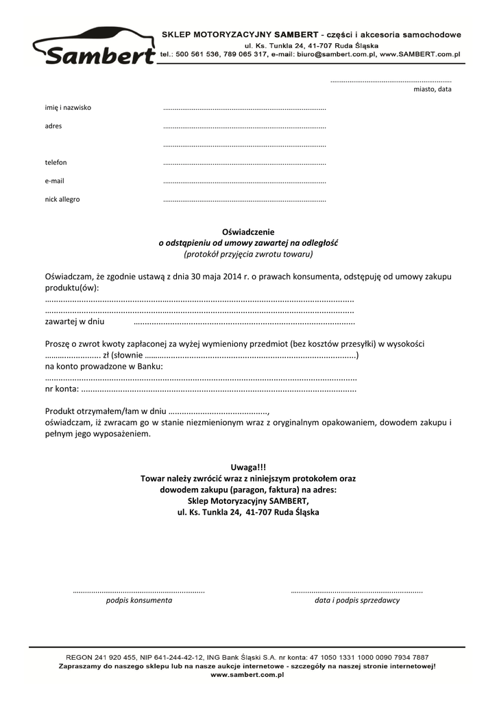 ................................................................ miasto, data imię i nazwisko ...................................................................................... adres ...................................................................................... ...................................................................................... telefon ...................................................................................... e-mail ...................................................................................... nick allegro ...................................................................................... Oświadczenie o odstąpieniu od umowy zawartej na odległość (protokół przyjęcia zwrotu towaru) Oświadczam, że zgodnie ustawą z dnia 30 maja 2014 r. o prawach konsumenta, odstępuję od umowy zakupu produktu(ów): …................................................…................................................................................ …................................................…................................................................................ zawartej w dniu …............................................................................................. Proszę o zwrot kwoty zapłaconej za wyżej wymieniony przedmiot (bez kosztów przesyłki) w wysokości ………................ zł (słownie ………...................................................................................) na konto prowadzone w Banku: ….................................................................................................................................... nr konta: ....................................................................................................................... Produkt otrzymałem/łam w dniu …........................................, oświadczam, iż zwracam go w stanie niezmienionym wraz z oryginalnym opakowaniem, dowodem zakupu i pełnym jego wyposażeniem. Uwaga!!! Towar należy zwrócić wraz z niniejszym protokołem oraz dowodem zakupu (paragon, faktura) na adres: Sklep Motoryzacyjny SAMBERT, ul. Ks. Tunkla 24, 41-707 Ruda Śląska …............................................................ podpis konsumenta …............................................................ data i podpis sprzedawcy