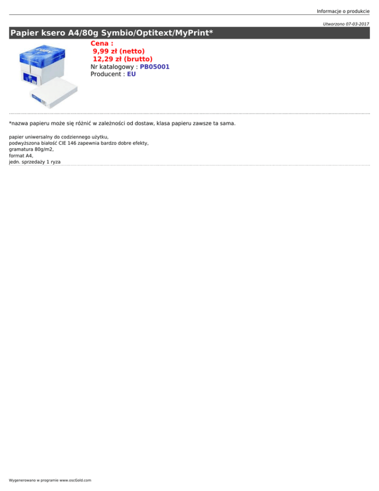 Informacje o produkcie Utworzono 07-03-2017 Papier ksero A4/80g Symbio/Optitext/MyPrint* Cena : 9,99 zł (netto) 12,29 zł (brutto) Nr katalogowy : PB05001 Producent : EU *nazwa papieru może się różnić w zależności od dostaw, klasa papieru zawsze ta sama. papier uniwersalny do codziennego użytku, podwyższona białość CIE 146 zapewnia bardzo dobre efekty, gramatura 80g/m2, format A4, jedn. sprzedaży 1 ryza Wygenerowano w programie www.oscGold.com