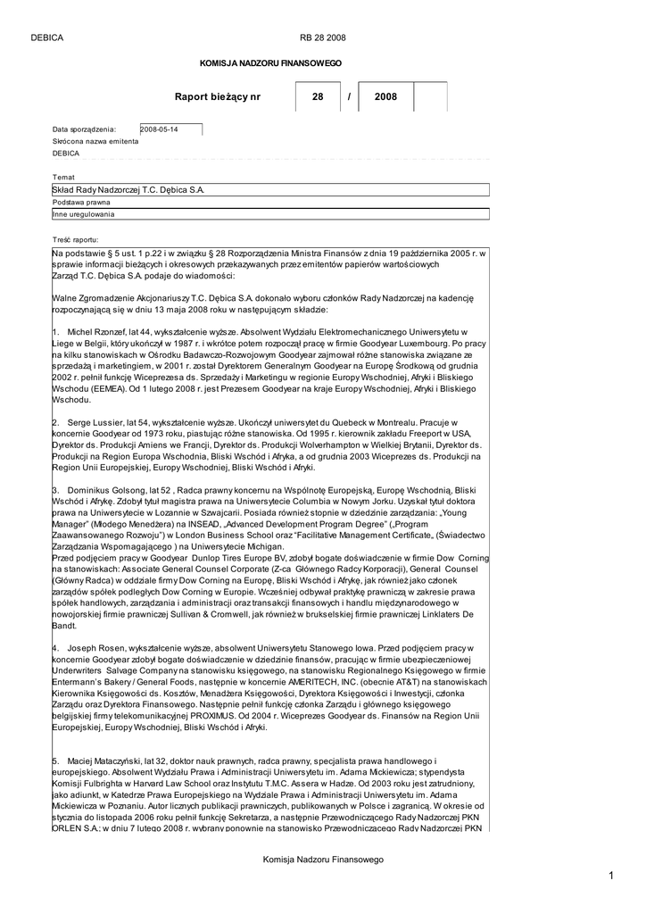 DEBICA RB 28 2008 KOMISJA NADZORU FINANSOWEGO Raport bieŜący nr Data sporządzenia: 28 / 2008 2008-05-14 Skrócona nazwa emitenta DEBICA Temat Skład Rady Nadzorczej T.C. Dębica S.A. Podstawa prawna Inne uregulowania Treść raportu: Na podstawie § 5 ust. 1 p.22 i w związku § 28 Rozporządzenia Ministra Finansów z dnia 19 października 2005 r. w sprawie informacji bieŜących i okresowych przekazywanych przez emitentów papierów wartościowych Zarząd T.C. Dębica S.A. podaje do wiadomości: Walne Zgromadzenie Akcjonariuszy T.C. Dębica S.A. dokonało wyboru członków Rady Nadzorczej na kadencję rozpoczynającą się w dniu 13 maja 2008 roku w następującym składzie: 1. Michel Rzonzef, lat 44, wykształcenie wyŜsze. Absolwent Wydziału Elektromechanicznego Uniwersytetu w Liege w Belgii, który ukończył w 1987 r. i wkrótce potem rozpoczął pracę w firmie Goodyear Luxembourg. Po pracy na kilku stanowiskach w Ośrodku Badawczo-Rozwojowym Goodyear zajmował róŜne stanowiska związane ze sprzedaŜą i marketingiem, w 2001 r. został Dyrektorem Generalnym Goodyear na Europę Środkową od grudnia 2002 r. pełnił funkcję Wiceprezesa ds. SprzedaŜy i Marketingu w regionie Europy Wschodniej, Afryki i Bliskiego Wschodu (EEMEA). Od 1 lutego 2008 r. jest Prezesem Goodyear na kraje Europy Wschodniej, Afryki i Bliskiego Wschodu. 2. Serge Lussier, lat 54, wykształcenie wyŜsze. Ukończył uniwersytet du Quebeck w Montrealu. Pracuje w koncernie Goodyear od 1973 roku, piastując róŜne stanowiska. Od 1995 r. kierownik zakładu Freeport w USA, Dyrektor ds. Produkcji Amiens we Francji, Dyrektor ds. Produkcji Wolverhampton w Wielkiej Brytanii, Dyrektor ds. Produkcji na Region Europa Wschodnia, Bliski Wschód i Afryka, a od grudnia 2003 Wiceprezes ds. Produkcji na Region Unii Europejskiej, Europy Wschodniej, Bliski Wschód i Afryki. 3. Dominikus Golsong, lat 52 , Radca prawny koncernu na Wspólnotę Europejską, Europę Wschodnią, Bliski Wschód i Afrykę. Zdobył tytuł magistra prawa na Uniwersytecie Columbia w Nowym Jorku. Uzyskał tytuł doktora prawa na Uniwersytecie w Lozannie w Szwajcarii. Posiada równieŜ stopnie w dziedzinie zarządzania: „Young Manager” (Młodego MenedŜera) na INSEAD, „Advanced Development Program Degree” („Program Zaawansowanego Rozwoju”) w London Business School oraz “Facilitative Management Certificate„ (Świadectwo Zarządzania Wspomagającego ) na Uniwersytecie Michigan. Przed podjęciem pracy w Goodyear Dunlop Tires Europe BV, zdobył bogate doświadczenie w firmie Dow Corning na stanowiskach: Associate General Counsel Corporate (Z-ca Głównego Radcy Korporacji), General Counsel (Główny Radca) w oddziale firmy Dow Corning na Europę, Bliski Wschód i Afrykę, jak równieŜ jako członek zarządów spółek podległych Dow Corning w Europie. Wcześniej odbywał praktykę prawniczą w zakresie prawa spółek handlowych, zarządzania i administracji oraz transakcji finansowych i handlu międzynarodowego w nowojorskiej firmie prawniczej Sullivan & Cromwell, jak równieŜ w brukselskiej firmie prawniczej Linklaters De Bandt. 4. Joseph Rosen, wykształcenie wyŜsze, absolwent Uniwersytetu Stanowego Iowa. Przed podjęciem pracy w koncernie Goodyear zdobył bogate doświadczenie w dziedzinie finansów, pracując w firmie ubezpieczeniowej Underwriters Salvage Company na stanowisku księgowego, na stanowisku Regionalnego Księgowego w firmie Entermann’s Bakery / General Foods, następnie w koncernie AMERITECH, INC. (obecnie AT&T) na stanowiskach Kierownika Księgowości ds. Kosztów, MenadŜera Księgowości, Dyrektora Księgowości i Inwestycji, członka Zarządu oraz Dyrektora Finansowego. Następnie pełnił funkcję członka Zarządu i głównego księgowego belgijskiej firmy telekomunikacyjnej PROXIMUS. Od 2004 r. Wiceprezes Goodyear ds. Finansów na Region Unii Europejskiej, Europy Wschodniej, Bliski Wschód i Afryki. 5. Maciej Mataczyński, lat 32, doktor nauk prawnych, radca prawny, specjalista prawa handlowego i europejskiego. Absolwent Wydziału Prawa i Administracji Uniwersytetu im. Adama Mickiewicza; stypendysta Komisji Fulbrighta w Harvard Law School oraz Instytutu T.M.C. Assera w Hadze. Od 2003 roku jest zatrudniony, jako adiunkt, w Katedrze Prawa Europejskiego na Wydziale Prawa i Administracji Uniwersytetu im. Adama Mickiewicza w Poznaniu. Autor licznych publikacji prawniczych, publikowanych w Polsce i zagranicą. W okresie od stycznia do listopada 2006 roku pełnił funkcję Sekretarza, a następnie Przewodniczącego Rady Nadzorczej PKN ORLEN S.A.; w dniu 7 lutego 2008 r. wybrany ponownie na stanowisko Przewodniczącego Rady Nadzorczej PKN Komisja Nadzoru Finansowego 1 DEBICA RB 28 2008 ORLEN S.A.; w dniu 7 lutego 2008 r. wybrany ponownie na stanowisko Przewodniczącego Rady Nadzorczej PKN ORLEN S.A. 6. Raimondo Eggink, lat 35, absolwent matematyki teoretycznej Uniwersytetu Jagiellońskiego. Od 2002 roku prowadzi samodzielnie działalność konsultingową i szkoleniową na rzecz podmiotów działających na rynku finansowym. Jednocześnie jest członkiem Rady Giełdy Papierów Wartościowych w Warszawie S.A., PKN ORLEN S.A., Netia S.A. oraz HOOP S.A. Był członkiem rad nadzorczych m.in. w Wilbo S.A., Mostostal Płock S.A., Swarzędz Meble S.A., Perła - Browary Lubelskie S.A., Stomil - Olsztyn S.A. Był członkiem zarządu, dyrektorem inwestycyjnym i Prezesem Zarządu ABN Amro Asset Management (Polska) S.A. Swoją pracę zawodową rozpoczął w 1995 roku w warszawskim oddziale ING Banku N.V. Licencjonowany doradca inwestycyjny od 1995 roku. W 2000 roku stowarzyszenie AIMR przyznało mu tytuł CFA (Chartered Financial Analyst). Od 2004 roku jest członkiem zarządu polskiego stowarzyszenia Polish Association of Investment Professional. 7. Jacek Osowski, lat 31, absolwent Szkoły Głównej Handlowej (Finanse i Bankowość). Posiada uprawnienia doradcy inwestycyjnego. W 2006 roku uzyskał tytuł MBA nadany przez University o