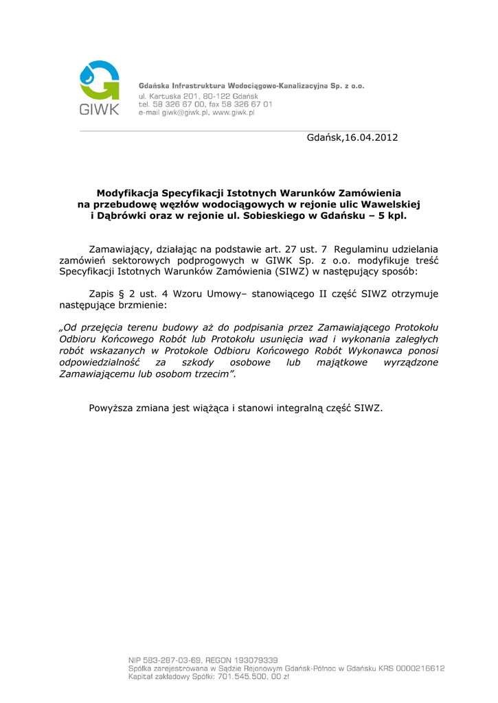 Gdańsk,16.04.2012 Modyfikacja Specyfikacji Istotnych Warunków Zamówienia na przebudowę węzłów wodociągowych w rejonie ulic Wawelskiej i Dąbrówki oraz w rejonie ul. Sobieskiego w Gdańsku – 5 kpl. Zamawiający, działając na podstawie art. 27 ust. 7 Regulaminu udzielania zamówień sektorowych podprogowych w GIWK Sp. z o.o. modyfikuje treść Specyfikacji Istotnych Warunków Zamówienia (SIWZ) w następujący sposób: Zapis § 2 ust. 4 Wzoru Umowy– stanowiącego II część SIWZ otrzymuje następujące brzmienie: „Od przejęcia terenu budowy aż do podpisania przez Zamawiającego Protokołu Odbioru Końcowego Robót lub Protokołu usunięcia wad i wykonania zaległych robót wskazanych w Protokole Odbioru Końcowego Robót Wykonawca ponosi odpowiedzialność za szkody osobowe lub majątkowe wyrządzone Zamawiającemu lub osobom trzecim”. Powyższa zmiana jest wiążąca i stanowi integralną część SIWZ.