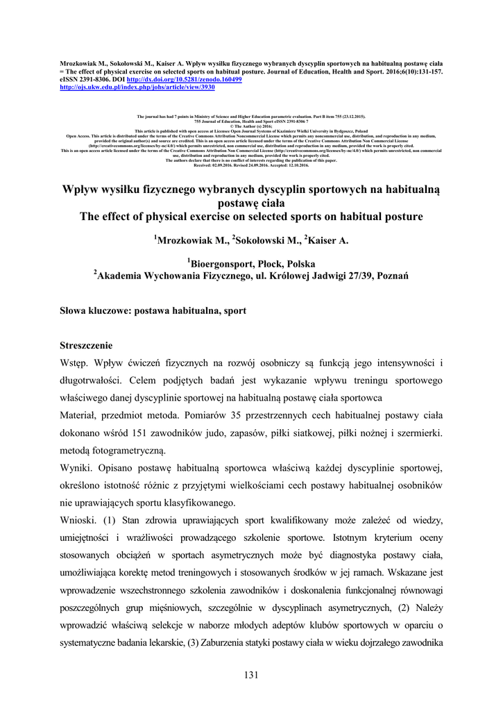Mrozkowiak M., Sokołowski M., Kaiser A. Wpływ wysiłku fizycznego wybranych dyscyplin sportowych na habitualną postawę ciała = The effect of physical exercise on selected sports on habitual posture. Journal of Education, Health and Sport. 2016;6(10):131-157. eISSN 2391-8306. DOI http://dx.doi.org/10.5281/zenodo.160499 http://ojs.ukw.edu.pl/index.php/johs/article/view/3930 The journal has had 7 points in Ministry of Science and Higher Education parametric evaluation. Part B item 755 (23.12.2015). 755 Journal of Education, Health and Sport eISSN 2391-8306 7 © The Author (s) 2016; This article is published with open access at Licensee Open Journal Systems of Kazimierz Wielki University in Bydgoszcz, Poland Open Access. This article is distributed under the terms of the Creative Commons Attribution Noncommercial License which permits any noncommercial use, distribution, and reproduction in any medium, provided the original author(s) and source are credited. This is an open access article licensed under the terms of the Creative Commons Attribution Non Commercial License (http://creativecommons.org/licenses/by-nc/4.0/) which permits unrestricted, non commercial use, distribution and reproduction in any medium, provided the work is properly cited. This is an open access article licensed under the terms of the Creative Commons Attribution Non Commercial License (http://creativecommons.org/licenses/by-nc/4.0/) which permits unrestricted, non commercial use, distribution and reproduction in any medium, provided the work is properly cited. The authors declare that there is no conflict of interests regarding the publication of this paper. Received: 02.09.2016. Revised 24.09.2016. Accepted: 12.10.2016. Wpływ wysiłku fizycznego wybranych dyscyplin sportowych na habitualną postawę ciała The effect of physical exercise on selected sports on habitual posture 1 Mrozkowiak M., 2Sokołowski M., 2Kaiser A. 1 2 Bioergonsport, Płock, Polska Akademia Wychowania Fizycznego, ul. Królowej Jadwigi 27/39, Poznań Słowa kluczowe: postawa habitualna, sport Streszczenie Wstęp. Wpływ ćwiczeń fizycznych na rozwój osobniczy są funkcją jego intensywności i długotrwałości. Celem podjętych badań jest wykazanie wpływu treningu sportowego właściwego danej dyscyplinie sportowej na habitualną postawę ciała sportowca Materiał, przedmiot metoda. Pomiarów 35 przestrzennych cech habitualnej postawy ciała dokonano wśród 151 zawodników judo, zapasów, piłki siatkowej, piłki nożnej i szermierki. metodą fotogrametryczną. Wyniki. Opisano postawę habitualną sportowca właściwą każdej dyscyplinie sportowej, określono istotność różnic z przyjętymi wielkościami cech postawy habitualnej osobników nie uprawiających sportu klasyfikowanego. Wnioski. (1) Stan zdrowia uprawiających sport kwalifikowany może zależeć od wiedzy, umiejętności i wrażliwości prowadzącego szkolenie sportowe. Istotnym kryterium oceny stosowanych obciążeń w sportach asymetrycznych może być diagnostyka postawy ciała, umożliwiająca korektę metod treningowych i stosowanych środków w jej ramach. Wskazane jest wprowadzenie wszechstronnego szkolenia zawodników i doskonalenia funkcjonalnej równowagi poszczególnych grup mięśniowych, szczególnie w dyscyplinach asymetrycznych, (2) Należy wprowadzić właściwą selekcje w naborze młodych adeptów klubów sportowych w oparciu o systematyczne badania lekarskie, (3) Zaburzenia statyki postawy ciała w wieku dojrzałego zawodnika 131 mogą być konsekwencją nie stosowania zasad treningu holistycznego i błędów w początkowym etapie szkolenia, błędów w rozgrzewce i braku ćwiczeń kształtujących nawyk postawy prawidłowej w jej ramach, (4) Zrealizowane badania nie dają pełnego obrazu zmian w postawie ciała po wpływem pracy charakterystycznej dla danej dyscypliny sportowej. Keywords: habitual posture, sport Summary Admission. The impact of physical exercise on the development of the individual are a function of its intensity and duration. The aim of the study is to demonstrate the influence of sports training appropriate for their sport habitual posture athlete The material object of the method. Measurements 35 spatial characteristics of habitual posture made of 151 players judo, wrestling, volleyball, football and fencing. photogrammetric method. Results. Described the attitude of habitual athlete right every sports discipline, defined the significance of differences of values accepted traits of habitual attitudes of individuals not engaged in sport classified. Conclusions. (1) The health status of athletes qualified may depend on the knowledge, skills and sensitivity leading sports training. An important criterion for evaluating the load in sports may be asymmetric diagnostics of body posture, enabling correction of training methods and means used within it. It is the introduction of comprehensive training of players and improve functional balance of individual muscle groups, especially in the disciplines of asymmetric (2) Enter the correct selections in recruiting young students of sports clubs based on regular medical examinations, (3) disorders static posture in adulthood player may be the consequence of not applying the principles of training holistic and errors in the initial training phase, errors in the warm-up and lack of exercise forming the habit of correct posture within it, (4) Realized studies do not give a complete picture of changes in body posture the influence of labor characteristic of the sport. 132 1. Wprowadzenie Przyjęto, że zwiększona aktywności fizyczna jest jednym z kluczowych zadań w promocji zdrowia. Wiele ośrodków zajmujących się tą problematyką oparło się na modelu Toronto (HRF – Heath Related Fitness), opracowanym przez C. Boucharda i R.J. Shepharda [1], który zakłada, że składowe wydolności fizycznej są podstawą zdrowia i mogą być dodatnio modyfikowane przez regularny trening fizyczny [