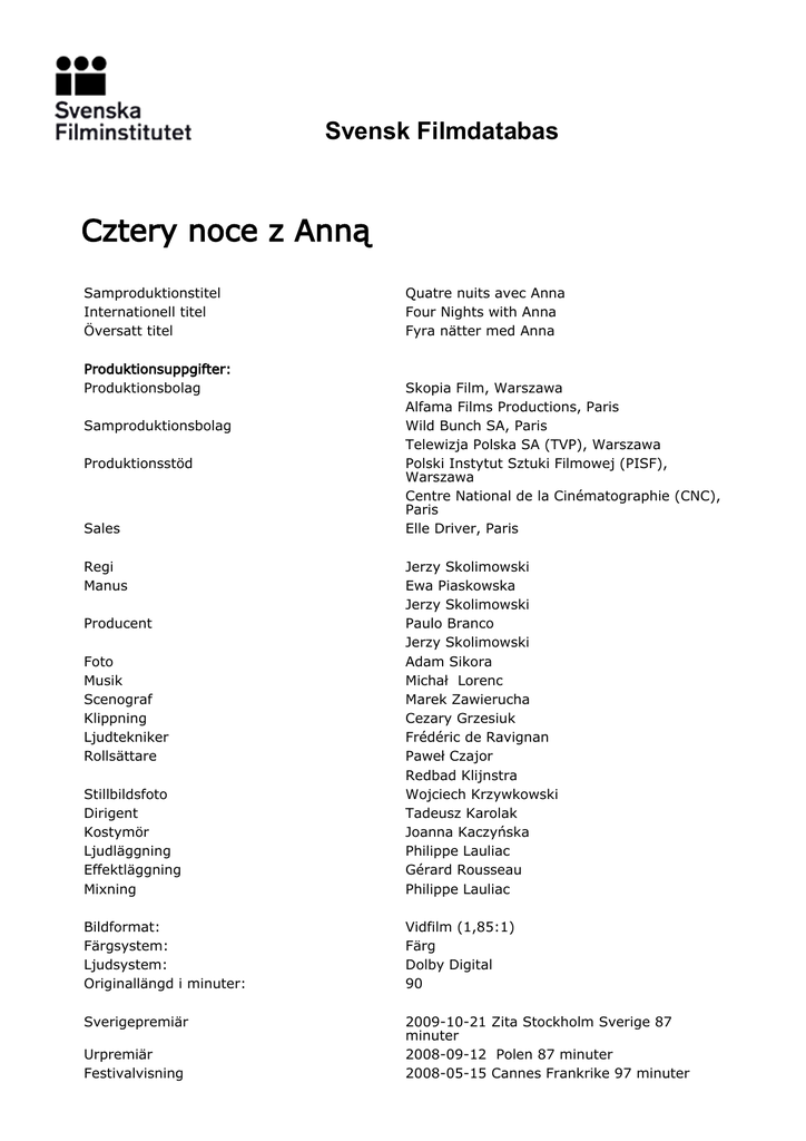 Svensk Filmdatabas Cztery noce z Anną Samproduktionstitel Internationell titel Översatt titel Produktionsuppgifter: Produktionsbolag Samproduktionsbolag Produktionsstöd Sales Regi Manus Quatre nuits avec Anna Four Nights with Anna Fyra nätter med Anna Skopia Film, Warszawa Alfama Films Productions, Paris Wild Bunch SA, Paris Telewizja Polska SA (TVP), Warszawa Polski Instytut Sztuki Filmowej (PISF), Warszawa Centre National de la Cinématographie (CNC), Paris Elle Driver, Paris Stillbildsfoto Dirigent Kostymör Ljudläggning Effektläggning Mixning Jerzy Skolimowski Ewa Piaskowska Jerzy Skolimowski Paulo Branco Jerzy Skolimowski Adam Sikora Michał Lorenc Marek Zawierucha Cezary Grzesiuk Frédéric de Ravignan Paweł Czajor Redbad Klijnstra Wojciech Krzywkowski Tadeusz Karolak Joanna Kaczyńska Philippe Lauliac Gérard Rousseau Philippe Lauliac Bildformat: Färgsystem: Ljudsystem: Originallängd i minuter: Vidfilm (1,85:1) Färg Dolby Digital 90 Sverigepremiär 2009-10-21 Zita Stockholm Sverige 87 minuter 2008-09-12 Polen 87 minuter 2008-05-15 Cannes Frankrike 97 minuter Producent Foto Musik Scenograf Klippning Ljudtekniker Rollsättare Urpremiär Festivalvisning Svensk Filmdatabas Annan visning 2009-01-23 Göteborg Sverige 87 minuter 2008-11-05 Frankrike 97 minuter Rollista: Artur Steranko Kinga Preis Jerzy Fedorowicz Redbad Klijnstra Jakub Snochowski Barbara Kołodziejska Małgorzata Buczkowska Anna Lenartowicz Urszula Bartos-Gęsikowska Marcin Jędrzejewski Zbigniew Konopka Judyta Paradzińska-Górska Leon Okrasa Anna sjukhusdirektören domaren polis Okrasas farmor Annas väninna sjuksköterska kassörska fånge fånge domare