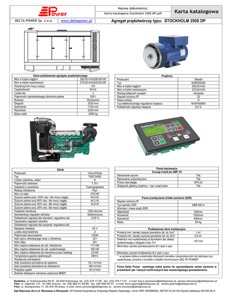 Nazwa dokumentu: Karta katalogowa Stockholm 250S DP.pdf DELTA POWER Sp. z o.o. www.deltapower.pl Dane podstawowe agregatu prądotwórczego Moc w trybie ciągłym 250,00 kVA/200,00 kW Moc w trybie rezerwowym 275,00 kVA/220,00 kW 0,8 Współczynnik mocy cos() Częstotliwość 50 Hz Liczba faz 3 Pojemność standardowego zbiornika paliwa 500 l Budowa Wyciszona Długość 3230 mm Szerokość 1140 mm Wysokość 2230 mm Masa netto 2950 kg Silnik Producent Typ Liczba cylindrów, układ Pojemność skokowa Zasilanie w powietrze Rodzaj chłodzenia Moc na wale Zużycie paliwa przy 100% obc. dla mocy ciągłej Zużycie paliwa przy 80% obc. dla mocy ciągłej Zużycie paliwa przy 50% obc. dla mocy ciągłej Zużycie paliwa przy 25% obc. dla mocy ciągłej Prędkość obrotowa Standardowy regulator obrotów Dokładność regulacji dla standard. regulatora obr. Opcjonalny regulator obrotów Dokładność regulacji dla opcjonal. regulatora obr. Napięcie instalacji Liczba akumulatorów Pojemność akumulatora Ilość płynu chłodzącego wraz z chłodnicą Ilość oleju Moc cieplna oddawana do ukł. chłodzenia Moc cieplna oddawana do ukł. wydechowego Moc cieplna oddawana do otoczenia przez radiację Temperatura gazów spalinowych Wydajność wentylatora Ilość powietrza potrzebna do spalania Ilość powietrza potrzebna do chłodzenia Przepływ spalin Średnie efektywne ciśnienie użyteczne BMEP Volvo-Penta TAD734GE 6 7,15 l Turbosprężarka Płyn 216 kW 54,5 l/h 44,3 l/h 32,8 l/h 1500 obr/min Elektroniczny 0,25 % 24 V 2 120Ah 32 l 29 l 117 kW 160 kW 24 kW 495oC 16,1 m3/min 190 m3/min 33 m3/min - Karta katalogowa Agregat prądotwórczy typu: STOCKHOLM 250S DP Prądnica Producent Typ Moc w trybie ciągłym Moc w trybie rezerwowym Rodzaj połączeń uzwojeń Stopień ochrony IP Klasa izolacji Typ elektronicznego regulatora napięcia Dokładność regulacji napięcia Marelli MJB250LB4 250,00 kVA 275,00 kVA Gwiazda 23 H M16FA655A 0,5 % Panel sterowania Comap InteliLite AMF 25 Sterowanie ręczne Sterowanie automatyczne Praca równoległa Wyłącznik główny prądnicy – typ i prąd znam. Tak Tak OPCJA Tak Panel przełączania źródła zasilania (SZR) Stopien ochrony IP Typ aparatu SZR ABB 400 A Wymiary i masa szafy SZR: Głębokość 400mm Wysokość 1000mm Szerokość 600mm Masa 60 kg Podstawowe dane instalacyjne Przekrój min. kanału czerpni powietrza (dł. do 3m)* Przekrój min. kanału wyrzutu powietrza (dł. do 3m)* Średnica rury wydechowej za tłumikiem dla układu wydechowego o długości max 7m* Minimalny wymiar pomieszczenia dł x szer x wys 1 m2 0,9 m2 125 mm Minimalny wymiar fundamentu dł x szer x wys * w sprawie doboru przekrojów dłuższych kanałów czerpni/wyrzutni lub dłuższej rury wydechowej, prosimy o kontakt z działem technicznym DELTA POWER Firma Delta Power zastrzega sobie prawo do wprowadzania zmian zarówno w produktach jak i danych technicznych bez wcześniejszego powiadamiania Siedziba: ul. Krasnowolska 82 R, 02-849 Warszawa, tel. (22) 379 17 00, fax: (22) 379 17 01, e-mail: [email protected], [email protected] Filia: ul. Olgierda 137, 81-584 Gdynia, tel. (58) 668 01 88;89, fax: (58) 668 00 47, e-mail: [email protected], [email protected] Filia: ul. Szwajcarska 11, 54-405 Wrocław, e-mail: [email protected], [email protected] Sąd Rejonowy dla m.st. Warszawy w Warszawie, XII Wydział Gospodarczy Krajowego Rejestru Sądowego, numer KRS: 0000068393, NIP 527-22-30-343 Kapitał zakładowy 200 000,00 zł