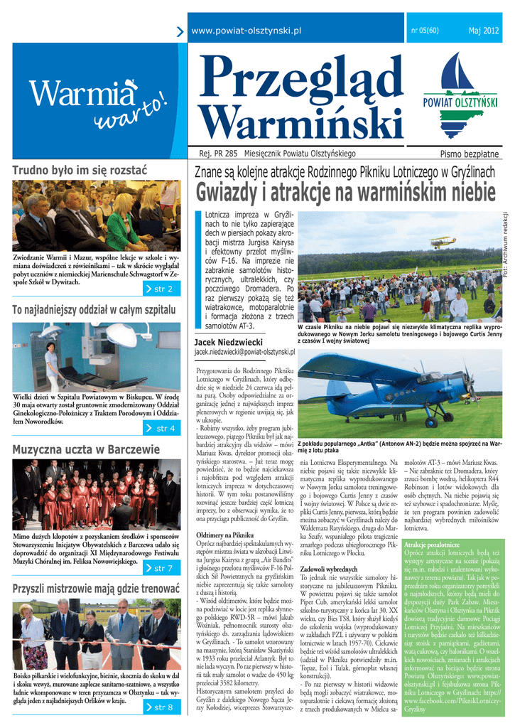 www.powiat-olsztynski.pl Rej. PR 285 Miesięcznik Powiatu Olsztyńskiego Zwiedzanie Warmii i Mazur, wspólne lekcje w szkole i wymiana doświadczeń z rówieśnikami – tak w skrócie wyglądał pobyt uczniów z niemieckiej Marienschule Schwagstorf w Zespole Szkół w Dywitach. str 2 To najładniejszy oddział w całym szpitalu Maj 2012 Pismo bezpłatne Znane są kolejne atrakcje Rodzinnego Pikniku Lotniczego w Gryźlinach Gwiazdy i atrakcje na warmińskim niebie Lotnicza impreza w Gryźlinach to nie tylko zapierające dech w piersiach pokazy akrobacji mistrza Jurgisa Kairysa i efektowny przelot myśliwców F-16. Na imprezie nie zabraknie samolotów historycznych, ultralekkich, czy poczciwego Dromadera. Po raz pierwszy pokażą się też wiatrakowce, motoparalotnie i formacja złożona z trzech samolotów AT-3. Jacek Niedzwiecki Fot: Archiwum redakcji Trudno było im się rozstać nr 05(60) W czasie Pikniku na niebie pojawi się niezwykle klimatyczna replika wyprodukowanego w Nowym Jorku samolotu treningowego i bojowego Curtis Jenny z czasów I wojny światowej [email protected] Wielki dzień w Szpitalu Powiatowym w Biskupcu. W środę 30 maja otwarty został gruntownie zmodernizowany Oddział Ginekologiczno-Położniczy z Traktem Porodowym i Oddziałem Noworodków. str 4 Muzyczna uczta w Barczewie Mimo dużych kłopotów z pozyskaniem środków i sponsorów Stowarzyszeniu Inicjatyw Obywatelskich z Barczewa udało się doprowadzić do organizacji XI Międzynarodowego Festiwalu Muzyki Chóralnej im. Feliksa Nowowiejskiego. str 7 Przyszli mistrzowie mają gdzie trenować Boisko piłkarskie i wielofunkcyjne, bieżnie, skocznia do skoku w dal i skoku wzwyż, murowane zaplecze sanitarno-szatniowe, a wszystko ładnie wkomponowane w teren przyzamcza w Olsztynku – tak wygląda jeden z najładniejszych Orlików w kraju. str 8 Przygotowania do Rodzinnego Pikniku Lotniczego w Gryźlinach, który odbędzie się w niedziele 24 czerwca idą pełna parą. Osoby odpowiedzialne za organizację jednej z największych imprez plenerowych w regionie uwijają się, jak w ukropie. - Robimy wszystko, żeby program jubileuszowego, piątego Pikniku był jak najbardziej atrakcyjny dla widzów – mówi Mariusz Kwas, dyrektor promocji olsztyńskiego starostwa. – Już teraz mogę powiedzieć, że to będzie najciekawsza i najobfitsza pod względem atrakcji lotniczych impreza w dotychczasowej historii. W tym roku postanowiliśmy rozwinąć jeszcze bardziej część lotniczą imprezy, bo z obserwacji wynika, że to ona przyciąga publiczność do Gryźlin. Z pokładu popularnego „Antka” (Antonow AN-2) będzie można spojrzeć na Warmię z lotu ptaka nia Lotnictwa Eksperymentalnego. Na niebie pojawi się także niezwykle klimatyczna replika wyprodukowanego w Nowym Jorku samolotu treningowego i bojowego Curtis Jenny z czasów I wojny światowej. W Polsce są dwie repliki Curtis Jenny, pierwsza, którą będzie można zobaczyć w Gryźlinach należy do Waldemara Ratyńskiego, druga do MarOldtimery na Pikniku ka Szufy, wspaniałego pilota tragicznie Oprócz najbardziej spektakularnych wy- zmarłego podczas ubiegłorocznego Pikstępów mistrza świata w akrobacji Litwi- niku Lotniczego w Płocku. na Jurgisa Kairysa z grupą „Air Bandits” i głośnego przelotu myśliwców F-16 Pol- Zadowoli wybrednych skich Sił Powietrznych na gryźlińskim To jednak nie wszystkie samoloty hiniebie zaprezentują się także samoloty storyczne na jubileuszowym Pikniku. z duszą i historią. W powietrzu pojawi się także samolot - Wśród oldtimerów, które będzie moż- Piper Cub, amerykański lekki samolot na podziwiać w locie jest replika słynne- szkolno-turystyczny z końca lat 30. XX go polskiego RWD-5R – mówi Jakub wieku, czy Bies TS8, który służył kiedyś Woźniak, pełnomocnik starosty olsz- do szkolenia wojska (wyprodukowany tyńskiego ds. zarządzania lądowiskiem w zakładach PZL i używany w polskim w Gryźlinach. - To samolot wzorowany lotnictwie w latach 1957-70). Ciekawie na maszynie, którą Stanisław Skarżyński będzie też wśród samolotów ultralekkich w 1933 roku przeleciał Atlantyk. Był to (udział w Pikniku potwierdziły m.in. nie lada wyczyn. Po raz pierwszy w histo- Topaz, Eol i Tulak, górnopłat własnej rii tak mały samolot o wadze do 450 kg konstrukcji). przeleciał 3582 kilometry. - Po raz pierwszy w historii widzowie Historycznym samolotem przyleci do będą mogli zobaczyć wiatrakowce, moGryźlin z dalekiego Nowego Sącza Je- toparalotnie i ciekawą formację złożoną rzy Kołodziej, wiceprezes Stowarzysze- z trzech produkowanych w Mielcu sa- molotów AT-3 – mówi Mariusz Kwas. – Nie zabraknie też Dromadera, który zrzuci bombę wodną, helikoptera R44 Robinson i lotów widokowych dla osób chętnych. Na niebie pojawią się też szybowce i spadochroniarze. Myślę, że ten program powinien zadowolić najbardziej wybrednych miłośników lotnictwa. Atrakcje pozalotnicze Oprócz atrakcji lotniczych będą też występy artystyczne na scenie (pokażą się m.in. młodzi i utalentowani wykonawcy z terenu powiatu). Tak jak w poprzednim roku organizatorzy pomyśleli o najmłodszych, którzy będą mieli do dyspozycji duży Park Zabaw. Mieszkańców Olsztyna i Olsztynka na Piknik dowiozą tradycyjnie darmowe Pociągi Lotniczej Przyjaźni. Na mieszkańców i turystów będzie czekało też kilkadziesiąt stoisk z pamiątkami, gadżetami, watą cukrową, czy balonikami. O wszelkich nowościach, zmianach i atrakcjach informować na bieżąco będzie strona Powiatu Olsztyńskiego: www.powiatolsztynski.pl i fejsbukowa strona Pikniku Lotniczego w Gryźlinach: https:// www.facebook.com/PiknikLotniczyGryzliny Wydarzenia Niemiecka młodzież z Marienschule Schwagstorf z wizytą w Dywitach Lasy Państwowe zapraszają na Dni Otwarte! W pierwszy czerwcowy weekend leśnicy z Olsztyna, regionu i kraju zapraszają na Dni Otwarte Lasów Państwowych Od 1 do 3 czerwca olsztyńscy leśnicy i ich k