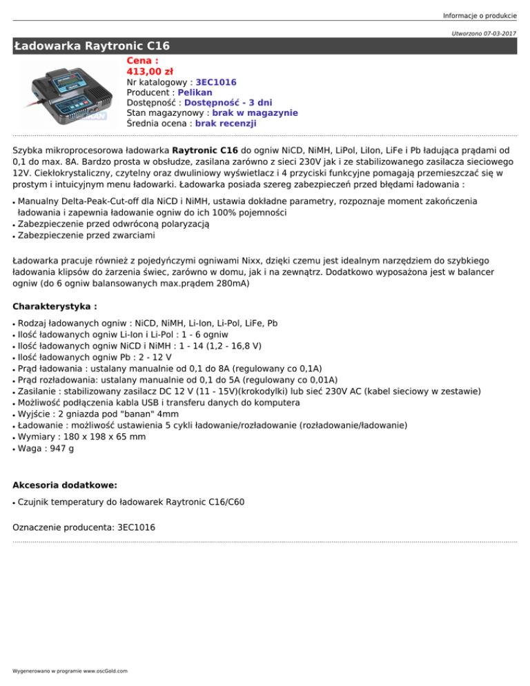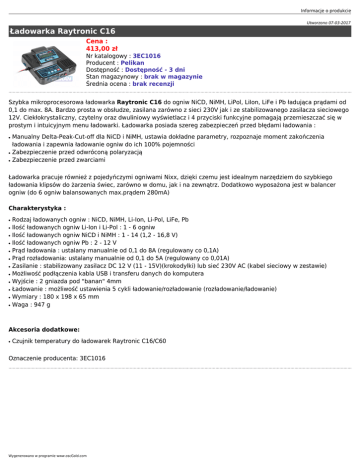 Informacje o produkcie Utworzono 07-03-2017 Ładowarka Raytronic C16 Cena : 413,00 zł Nr katalogowy : 3EC1016 Producent : Pelikan Dostępność : Dostępność - 3 dni Stan magazynowy : brak w magazynie Średnia ocena : brak recenzji Szybka mikroprocesorowa ładowarka Raytronic C16 do ogniw NiCD, NiMH, LiPol, LiIon, LiFe i Pb ładująca prądami od 0,1 do max. 8A. Bardzo prosta w obsłudze, zasilana zarówno z sieci 230V jak i ze stabilizowanego zasilacza sieciowego 12V. Ciekłokrystaliczny, czytelny oraz dwuliniowy wyświetlacz i 4 przyciski funkcyjne pomagają przemieszczać się w prostym i intuicyjnym menu ładowarki. Ładowarka posiada szereg zabezpieczeń przed błędami ładowania : ● ● ● Manualny Delta-Peak-Cut-off dla NiCD i NiMH, ustawia dokładne parametry, rozpoznaje moment zakończenia ładowania i zapewnia ładowanie ogniw do ich 100% pojemności Zabezpieczenie przed odwróconą polaryzacją Zabezpieczenie przed zwarciami Ładowarka pracuje również z pojedyńczymi ogniwami Nixx, dzięki czemu jest idealnym narzędziem do szybkiego ładowania klipsów do żarzenia świec, zarówno w domu, jak i na zewnątrz. Dodatkowo wyposażona jest w balancer ogniw (do 6 ogniw balansowanych max.prądem 280mA) Charakterystyka : ● ● ● ● ● ● ● ● ● ● ● ● Rodzaj ładowanych ogniw : NiCD, NiMH, Li-Ion, Li-Pol, LiFe, Pb Ilość ładowanych ogniw Li-Ion i Li-Pol : 1 - 6 ogniw Ilość ładowanych ogniw NiCD i NiMH : 1 - 14 (1,2 - 16,8 V) Ilość ładowanych ogniw Pb : 2 - 12 V Prąd ładowania : ustalany manualnie od 0,1 do 8A (regulowany co 0,1A) Prąd rozładowania: ustalany manualnie od 0,1 do 5A (regulowany co 0,01A) Zasilanie : stabilizowany zasilacz DC 12 V (11 - 15V)(krokodylki) lub sieć 230V AC (kabel sieciowy w zestawie) Możliwość podłączenia kabla USB i transferu danych do komputera Wyjście : 2 gniazda pod "banan" 4mm Ładowanie : możliwość ustawienia 5 cykli ładowanie/rozładowanie (rozładowanie/ładowanie) Wymiary : 180 x 198 x 65 mm Waga : 947 g Akcesoria dodatkowe: ● Czujnik temperatury do ładowarek Raytronic C16/C60 Oznaczenie producenta: 3EC1016 Wygenerowano w programie www.oscGold.com