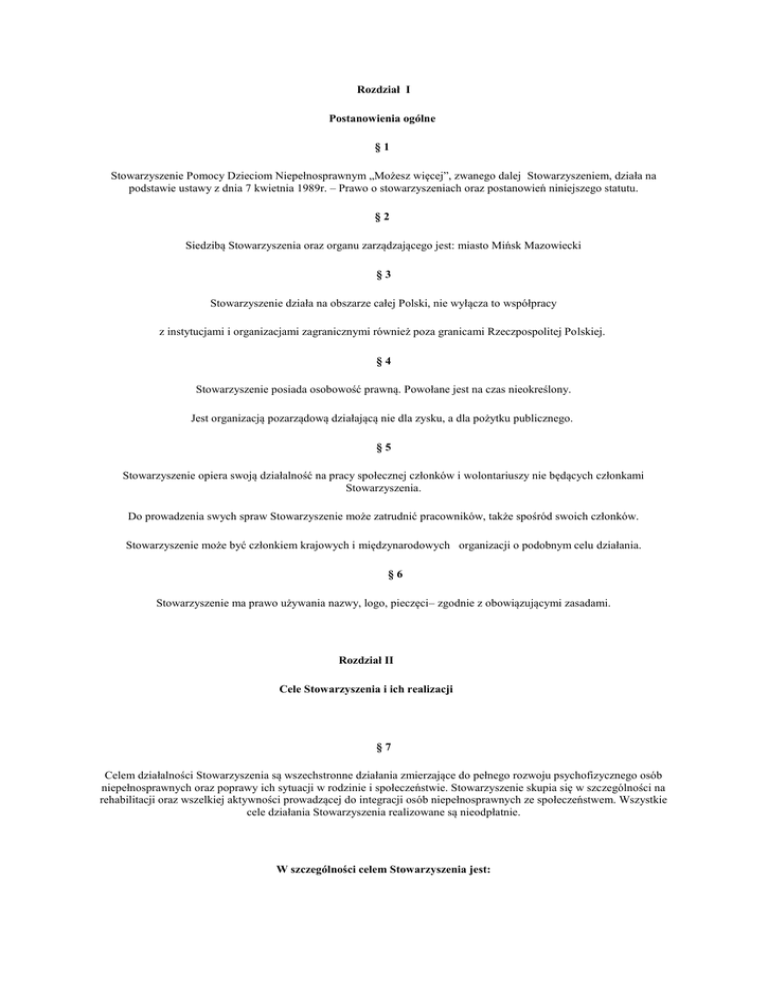 Rozdział I Postanowienia ogólne §1 Stowarzyszenie Pomocy Dzieciom Niepełnosprawnym „Możesz więcej”, zwanego dalej Stowarzyszeniem, działa na podstawie ustawy z dnia 7 kwietnia 1989r. – Prawo o stowarzyszeniach oraz postanowień niniejszego statutu. §2 Siedzibą Stowarzyszenia oraz organu zarządzającego jest: miasto Mińsk Mazowiecki §3 Stowarzyszenie działa na obszarze całej Polski, nie wyłącza to współpracy z instytucjami i organizacjami zagranicznymi również poza granicami Rzeczpospolitej Polskiej. §4 Stowarzyszenie posiada osobowość prawną. Powołane jest na czas nieokreślony. Jest organizacją pozarządową działającą nie dla zysku, a dla pożytku publicznego. §5 Stowarzyszenie opiera swoją działalność na pracy społecznej członków i wolontariuszy nie będących członkami Stowarzyszenia. Do prowadzenia swych spraw Stowarzyszenie może zatrudnić pracowników, także spośród swoich członków. Stowarzyszenie może być członkiem krajowych i międzynarodowych organizacji o podobnym celu działania. §6 Stowarzyszenie ma prawo używania nazwy, logo, pieczęci– zgodnie z obowiązującymi zasadami. Rozdział II Cele Stowarzyszenia i ich realizacji §7 Celem działalności Stowarzyszenia są wszechstronne działania zmierzające do pełnego rozwoju psychofizycznego osób niepełnosprawnych oraz poprawy ich sytuacji w rodzinie i społeczeństwie. Stowarzyszenie skupia się w szczególności na rehabilitacji oraz wszelkiej aktywności prowadzącej do integracji osób niepełnosprawnych ze społeczeństwem. Wszystkie cele działania Stowarzyszenia realizowane są nieodpłatnie. W szczególności celem Stowarzyszenia jest: wszechstronna pomoc dzieciom i osobom niepełnosprawnym oraz potrzebującym wsparcia, ich rodzicom, opiekunom, instytucjom i specjalistom, 1. organizowanie i prowadzenie różnych form edukacji, terapii, leczenia, poradnictwa dla osób niepełnosprawnych oraz potrzebujących wsparcia m.in. w formie placówek w zakresie wczesnej interwencji, rehabilitacji leczniczej, społecznej i zawodowej, terapii, w formie świadczeń zdrowotnych; edukacji, rewalidacji i wychowania, pomocy społecznej, edukacji obywatelskiej, europejskiej i ekologicznej oraz działalności rekreacyjno-terapeutycznej, sezonowego wypoczynku, kulturalnej, sportowej, dowozu itp., z uwzględnieniem niezbędnej opieki we wszystkich formach; 2. prowadzenie działalności reklamowej, popularyzatorskiej, upowszechniającej wiedzę na temat problemów osób niepełnosprawnych i ich rodzin; 3. prowadzenie dla osób dorosłych form indywidualnego wsparcia w niezależnym, samodzielnym życiu, mieszkalnictwa chronionego, szkolenia zawodowego i przygotowania do pracy oraz aktywnego poszukiwania i pośrednictwa pracy, zatrudnienia chronionego i wspomaganego na otwartym rynku pracy, a także edukacji ustawicznej; 4. prowadzenia przedszkola i szkoły specjalnej/integracyjnej – zmniejszenie nierówności w upowszechnianiu edukacji; 5. §8 Stowarzyszenie realizuje swoje cele przez: Upowszechnianie wiedzy teoretycznej i praktycznej w zakresie rehabilitacji leczniczej, społecznej i zawodowej oraz edukacji dzieci, młodzieży i dorosłych osób niepełnosprawnych; 1. Współdziałanie z organami administracji publicznej, stowarzyszeniami oraz innymi organizacjami pozarządowymi w zakresie pomocy dzieciom i młodzieży niepełnosprawnej oraz dorosłym osobom niepełnosprawnym; 2. Nawiązywanie współpracy ze środowiskami naukowymi, instytucjami i organizacjami społecznymi w zakresie pomocy dzieciom i młodzieży niepełnosprawnej oraz dorosłym osobom niepełnosprawnym; 3. Prowadzenie działalności wydawniczej; 4. Działania w zakresie pomocy społecznej, w tym pomocy rodzinom i osobom w trudnej sytuacji życiowej oraz wyrównywania szans tych rodzin i osób; 5. 6. 7. Wspieranie i upowszechnianie kultury fizycznej i sportu; Upowszechnianie i ochronę wolności i praw człowieka oraz swobód obywatelskich, a także działań wspomagających rozwój demokracji; 8. Działania na rzecz integracji europejskiej oraz nawiązywania kontaktów i współpracy między społeczeństwami; 9. 10. 11. 12. Promocję i organizację wolontariatu; Inną działalność korzystną dla realizacji celów statutowych Stowarzyszenia; Gromadzenie środków finansowych i materialnych na realizację celów Stowarzyszenia. 13. 14. Działalność charytatywną; Działania na rzecz ochrony i promocji zdrowia; Wsparcie psychiczne i pomoc materialna osobom niepełnosprawnym ich w trudnej sytuacji materialnej. 15. rodzinom i opiekunom znajdujących się Organizowanie wyjazdów i zajęć rehabilitacyjno - rekreacyjnych dla osób niepełnosprawnych. 16. 17. Organizowanie wspólnie z harcerzami i młodzieżą szkół spotkań integracyjnych, zabaw okolicznościowych dla osób niepełnosprawnych. Wsparcie terapii zajęciowej oraz zajęć plastycznych prowadzonych w placówkach specjalnych oraz ośrodkach wsparcia poprzez zakup potrzebnego sprzętu i materiałów terapeutycznych. Organizowanie wystaw prac plastycznych osób niepełnosprawnych. Organizowanie spotkań z psychologiem oraz lekarzami różnych opiekunów. 18. 19. 20. 21. 22. specjalizacji dla osób niepełnosprawnych ich rodzin i Współdziałanie z władzami samorządowymi, mediami i innymi instytucjami w rozwiązywaniu zaistniałych problemów osób niepełnosprawnych. Angażowanie do współpracy do realizacji zadań statutowych na zasadzie wolontariatu: harcerzy, młodzieży, wojska, policji oraz osób prywatnych. Doposażenie w sprzęt rehabilitacyjny placówek szkolnych i ośrodków wsparcia, prowadzących działalność na rzecz osób niepełnosprawnych. Dofinansowanie zakupu sprzętu rehabilitacyjnego, oraz pomoc materialną osobom niepełnosprawnym ich rodzinom lub opiekunom prawnym. §9 1. Stowarzyszenie może prowadzić działalność gospodarczą wyłącznie jako dodatkową w stosunku do działalności pożytku publicznego. Nadwyżkę przycho