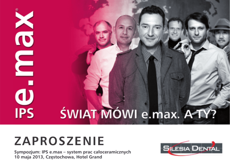 ZAPROSZENIE Sympozjum: IPS e.max – system prac całoceramicznych 10 maja 2013, Częstochowa, Hotel Grand we współpracy z Ivoclar-Vivadent Polska zaprasza na sympozjum „IPS e.max – system do prac całoceramicznych. Estetyka. Wytrzymałość. Uniwersalność. ’’ „Zasady rekonstrukcji tkanek zębów przy zastosowaniu materiałów ceramicznych.” Prowadzący: dr n. med. Piotr Okoński i tech. dent. Piotr Górski 11.00 – 12.30 Całoceramiczne uzupełnienia stałe – podstawowe etapy laboratoryjne. Systemy całoceramiczne Ivoclar Vivadent: cechy charakterystyczne, zasady stosowania, wybór materiału , metody charakteryzacji. IPS e.max – nieograniczone możliwości stosowania, wyjątkowa wytrzymałość, trwałość, estetyka naturalnego zęba, uniwersalność w zastosowaniu. 12.30 – 13.00 Przerwa na kawę 13.00 – 14.30 Preparacja zębów z żywą miazgą i leczonych endodontycznie pod różne rodzaje uzupełnień ceramicznych. Odbudowa bezpośrednia i pośrednia z użyciem wkładów koronowo-korzeniowych z włókien szklanych. Zastosowanie skutecznej retrakcji dziąsła. Zalecane techniki i masy wyciskowe. 14.30 – 15.30 Obiad 15.30 – 17.30 Zastosowanie materiałów ceramicznych w rekonstrukcji pełnego łuku zębowego. Estetyka odcinka przedniego oraz pewność i trwałość struktury protetycznej w odcinku bocznym. Cementowanie uzupełnień ceramicznych przy użyciu materiałów kompozytowych. Przygotowanie tkanek zęba i powierzchni uzupełnienia ceramicznego. Uczestnicy sympozjum otrzymują punkty edukacyjne oraz materiały informacyjne. Koszt uczestnictwa w sympozjum dla lekarzy dentystów wynosi 500 zł. Koszt uczestnictwa w sympozjum dla techników dentystycznych wynosi 150 zł. Każdy lekarz, który weźmie udział w sympozjum, otrzyma kupon na wykonanie korony lub licówki w systemie IPS e.max, do wykorzystania w pracowni protetycznej, współpracującej z dystrybutorem Silesia Dental. Zapisy przyjmuje firma Silesia Dental: Justyna Klemenczak tel. 71 397 65 57; e-mail [email protected] Wpłaty tytułem ,,Udział w sympozjum 10.05.2013’’ należy przesyłać na konto firmy: Silesia Dental, ul. Polna 31, 55-300 Środa Śląska Numer rachunku 17 1750 1064 0000 0000 1277 6209 Termin spotkania: 10 maja 2013 r. godz. 11.00 Miejsce: Hotel Grand, ul. Drogowców 8, 42-200 Częstochowa Serdecznie zapraszamy ŚWIAT MÓWI
