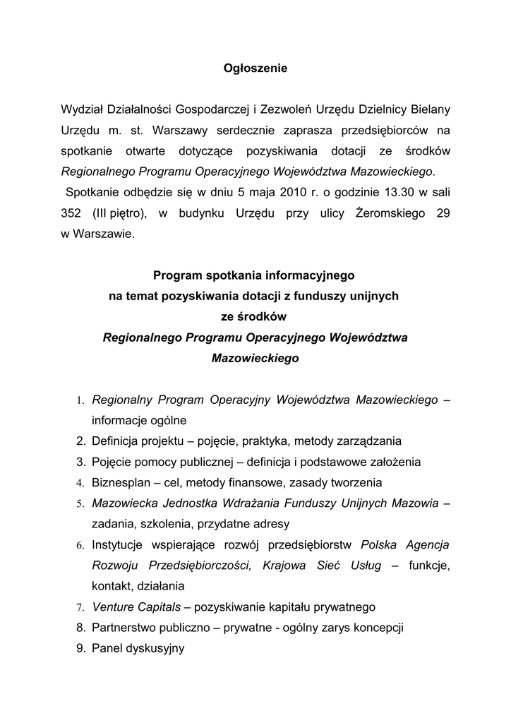 Ogłoszenie Wydział Działalności Gospodarczej i Zezwoleń Urzędu Dzielnicy Bielany Urzędu m. st. Warszawy serdecznie zaprasza przedsiębiorców na spotkanie otwarte dotyczące pozyskiwania dotacji ze środków Regionalnego Programu Operacyjnego Województwa Mazowieckiego. Spotkanie odbędzie się w dniu 5 maja 2010 r. o godzinie 13.30 w sali 352 (III piętro), w budynku Urzędu przy ulicy Żeromskiego 29 w Warszawie. Program spotkania informacyjnego na temat pozyskiwania dotacji z funduszy unijnych ze środków Regionalnego Programu Operacyjnego Województwa Mazowieckiego 1. Regionalny Program Operacyjny Województwa Mazowieckiego – informacje ogólne 2. Definicja projektu – pojęcie, praktyka, metody zarządzania 3. Pojęcie pomocy publicznej – definicja i podstawowe założenia 4. Biznesplan – cel, metody finansowe, zasady tworzenia 5. Mazowiecka Jednostka Wdrażania Funduszy Unijnych Mazowia – zadania, szkolenia, przydatne adresy 6. Instytucje wspierające rozwój przedsiębiorstw Polska Agencja Rozwoju Przedsiębiorczości, Krajowa Sieć Usług – funkcje, kontakt, działania 7. Venture Capitals – pozyskiwanie kapitału prywatnego 8. Partnerstwo publiczno – prywatne - ogólny zarys koncepcji 9. Panel dyskusyjny