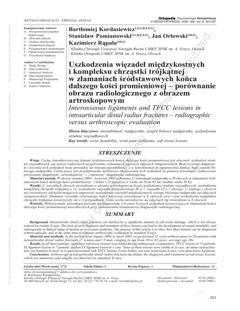 Author’s Contribution A – Study Design B – Data Collection C – Statistical Analysis D – Data Interpretation E – Manuscript Preparation F – Literature Search G – Funds Collection Uszkodzenia więzadeł międzykostnych i kompleksu chrząstki trójkątnej w złamaniach śródstawowych końca dalszego kości promieniowej – porównanie obrazu radiologicznego z obrazem artroskopowym ed . Bartłomiej Kordasiewicz1,2(A,B,E,F,G), Stanisław Pomianowski1(A,B,E,F,G), Jan Orłowski1(D,E), Kazimierz Rąpała2(D,E) 1 Klinika Chirurgii Urazowej Narządu Ruchu CMKP, SPSK im. A. Grucy, Otwock Klinika Ortopedii CMKP, SPSK im. A. Grucy, Otwock ibu 2 tio np roh ibit This copy is for personal use only - distribution prohibited. Zaangażowanie Autorów A – Przygotowanie projektu badawczego B – Zbieranie danych C – Analiza statystyczna D – Interpretacja danych E – Przygotowanie manuskryptu F – Opracowanie piśmiennictwa G – Pozyskanie funduszy This copy is for personal use only - distribution prohibited. - O r t o p e d i a Traumatologia Rehabilitacja © MEDSPORTPRESS, 2006; 3(6); Vol. 8, 263-267 ARTYKUŁ ORYGINALNY / ORIGINAL ARTICLE dis tr Interosseous ligaments and TFCC lesions in intraarticular distal radius fractures – radiographic versus arthroscopic evaluation on ly - Słowakluczowe:niestabilność nadgarstka, zespół bólowy nadgarstka, uszkodzenia struktur więzadłowych Keywords: wrist instability, wrist pain syndrome, soft tissue lesions se SuMMary for pe rso na lu Wstęp. Cechą charakterystyczną złamań śródstawowych końca dalszego kości promieniowej jest obecność uszkodzeń struktur więzadłowych, nie zawsze widocznych na pierwotnie wykonanych typowych zdjęciach rentgenowskich. Brak wczesnej diagnostyki i leczenia tych uszkodzeń może prowadzić do rozwoju niestabilności, a w konsekwencji do ograniczenia funkcji, bądź zespołu bólowego nadgarstka. Celem pracy jest przedstawienie możliwości obrazowania tych uszkodzeń za pomocą artroskopii i jednoczesne porównanie diagnostyki „artroskopowej” z „rutynową” diagnostyką radiologiczną. Materiali metody. W okresie sierpień 2004 – kwiecień 2005 wykonano 21 artroskopii nadgarstka u 20 chorych ze złamaniem śródstawowym końca dalszego kości promieniowej: 7 kobiet i 13 mężczyzn w wieku od 20 do 63 lat, średnia wieku 38 lat. Wyniki.U wszystkich chorych stwierdzono w obrazie artroskopowym liczne uszkodzenia struktur więzadłowych: uszkodzenia kompleksu chrząstki trójkątnej u 13, uszkodzenie więzadła międzykostnego SL u 7, więzadła LT u 1 chorego. U żadnego z chorych nie stwierdzono odchyleń mogących sugerować uszkodzenia więzadeł międzykostnych szeregu bliższego nadgarstka na zdjęciach rentgenowskich. Złamanie wyrostka rylcowatego kości łokciowej stwierdzono u 9 chorych, przy czym uszkodzenia kompleksu chrząstki trójkątnej towarzyszyły im w 4 przypadkach. Ciała wolne niewidoczne na zdjęciach rtg stwierdzono u 8 chorych. Wnioski. Wykorzystanie artroskopu pozwala na diagnostykę i leczenie licznych uszkodzeń towarzyszących złamaniom końca dalszego kości promieniowej niewidocznych przy zastosowaniu standardowej diagnostyki radiologicznej. is c op y is Background. Intraarticular distal radius fractures are marked by a significant amount of soft tissue damage, which is not always noticed on routine X-rays. The lack of early diagnosis and treatment of these lesions can lead to the development of carpal instability, and subsequently to limited range of motion or wrist pain syndrome. The purpose of this article is to show how these lesions can be diagnosed arthroscopically, and at the same time to compare arthroscopic evaluation to standard X-rays. Materialandmethods. In the period from August 2004 to April 2005 we performed 21 wrist arthroscopies in 20 patients with intraarticular distal radius fractures (7 women and 13 men, ranging in age from 20 to 63 years, average age 38). results. In all these patients, numerous soft tissue lesions were found during arthroscopic examination: TFCC lesions in 13 patients, SL ligament lesions in 7 patients, and an LT ligament lesion in 1 case. None of these lesions were visible in X-rays. An ulnar styloid fracture was found in 9 cases, in 4 cases associated with TFCC lesions. Loose bodies, not seen in previous X-rays, were detected in 8 patients. conclusions.Arthroscopy in intraarticular distal radius fractures facilitates the diagnosis and treatment of soft tissue lesions, which are numerous and usually not detected on standard X-rays. Liczba słów/Word count: 2718 Tabele/Tables: 0 Ryciny/Figures: 4 Th Adres do korespondencji / Address for correspondence dr Bartłomiej Kordasiewicz Klinika Chirurgii Urazowej Narządu Ruchu CMKP, SPSK im. A. Grucy 50-400 Otwock, ul. Konarskiego 13, tel./fax: (0-22) 779-54-18, e-mail: [email protected] Piśmiennictwo/References: 20 Otrzymano / Received Zaakceptowano / Accepted 01.03.2006 r. 14.06.2006 r. - This copy is for personal use only - distribution prohibited. - This copy is for personal use only - distribution prohibited. - StreSzczenie 263 Złamania śródstawowe końca dalszego kości promieniowej powstają w wyniku dużej energii urazu i dotyczą przede wszystkim ludzi młodych [1,2]. Cechą charakterystyczną tych złamań jest ich znaczna niestabilność, stanowiąca wskazanie do leczenia operacyjnego oraz obecność licznych uszkodzeń towarzyszących. Obecność uszkodzeń tkanek miękkich sięga blisko 70%, co może wpływać na wynik końcowy leczenia [3]. Brak wczesnej diagnostyki tych uszkodzeń, zwykle niewidocznych na typowych zdjęciach rtg, może prowadzić do rozwoju niestabilności nadgarstka [1,4]. Problem ten dotyczy najczęściej więzadeł międzykostnych szeregu bliższego nadgarstka, czyli więzadła łódeczkowo-księżycowatego (scapholunate ligament – SL) i więzadła księżycowo-trójgraniastego (lunotriquetral ligament – LT) oraz kompleksu chrząstki 