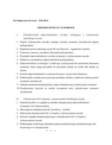 Dr Małgorzata Serwach - 8.03.2013. UBEZPIECZENIE OC ZAWODOWE I. Charakterystyka odpowiedzialności cywilnej wynikającej z wykonywania określonego zawodu 1. Pojęcie wykonywania zawodu, wolnego zawodu, czynności zawodowych pojęcie profesjonalisty 2. Regulacje prawne odnoszące się do OC zawodowych – zagadnienia wybrane 3. Ustawowe, umowne, zawodowe obowiązki profesjonalisty 4. Przesłanki odpowiedzialności cywilnej związanej z wykonywaniem zawodu 5. Deliktowa a kontraktowa odpowiedzialność profesjonalisty 6. Odpowiedzialność wynikająca z wadliwego wykonywania lub zaniechania dokonania czynności, które mogą prowadzić do powstania szkody na osobie lub szkody na mieniu 7. Kwestia odpowiedzialności za utracone korzyści a czysta strata finansowa 8. Problematyka związku przyczynowego pomiędzy szkodą a wadliwym wykonywaniem czynności zawodowych 9. Należyta staranność profesjonalisty; rażąca staranność przy wykonywaniu czynności 10. Przedawnienie roszczeń za szkodę wyrządzoną przy wykonywaniu czynności zawodowych II. Ubezpieczenie OC związanej z wykonywaniem określonego zawodu 1. Podział zawodów ze względu na charakter ubezpieczenia odpowiedzialności związanej z ich wykonywaniem 2. Obowiązkowe ubezpieczenia OC zawodowe – wnioski 3. Dobrowolne ubezpieczenia OC w związku z wykonywaniem zawodu 4. Kwestia wypadku ubezpieczeniowego w ubezpieczeniu OC w związku z wykonywaniem zawodu 5. Problematyka właściwego określenia zakresu podmiotowego, przedmiotowego oraz kwotowego w/w ubezpieczenia * * *