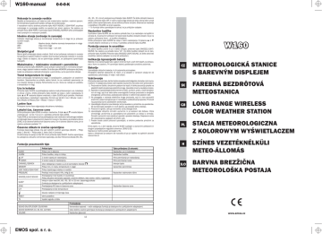 W160-manual 0-0-0-K 45-, 30-, 15- minut) postopoma pritiskajte tipko SLEEP. Če želite izklopiti časovno stikalo, pritisnite tipko OFF. V načinu časovnega stikala se lahko izbira eden izmed petih zvokov spremljave tako, da se večkrat pritisne na tipko. Glasnost se nastavlja s koleščkom VOLUME na strani aparata. ** To funkcijo lahko uporabljate le takrat, ko je priključen adapter. Notranje in zunanje rosišče Rosišče je temperatura, pri kateri je zrak maksimalno nasičen z vodnimi parami. Če temperatura pade pod rosišče, prihaja do kondenzacije. V navadnem načinu dvakrat pritisnite tipko HEAT INDEKS / DEW POINT za prikaz notranjega in zunanjega rosišča na spodnji levi strani zaslona. Na zaslonu se prikaže ikona DEW POINT. S pomočjo tipke CHANNEL/SEARCH lahko preklapljate med zunanjimi in notranjimi podatki. Nastavitev budilke S pritiskom tipke ALARM, se na zaslonu prikaže čas, ki je nastavljen na budilki in oznaka AL. S ponovnim pritiskom te tipke boste budilko izklopili/vklopili. Če je na zaslonu prikazana ikona , je budilka vklopljena. Držite pritisnjeno tipko ALARM za vstop v način nastavljanja. S tipkama ▲ in ▼ vnesite željene vrednosti ur in minut. V potrditev pritisnite tipko ALARM. Idealno stanje (notranje in zunanje) Indikator idealnega stanja je kombinacija temperature in vlage ter je prikazan na treh nivojih: COMF: Idealno stanje, idealno razmerje temperature in vlage WET: Višja mera vlage DRY: Nižja mera vlage – suh zrak Ko začne budilka zvoniti in jo vi želite izklopiti, pritisnite tipko SNOOZE/LIGHT/ SOUND. Na zaslonu se prikaže ikona “Zz”. Če želite budilko izklopiti za en dan, pritisnite tipko ALARM. Pritisnite tipko SNOOZE/LIGHT/SOUND, če želite aktivirati osvetlitev zaslona (adapter ne sme biti priključen). Stolpični graf Barvni grafi prikazujejo stanje vrednot. Graf na levi prikazuje notranjo in zunanjo temperaturo, toplotni indeks in rosišče. Graf na desni prikazuje notranjo in zunanjo vlago. Glede na dejstvo, da se spreminjajo podatki, se postopoma spreminjajo tudi grafi. Indikacija izpraznjenih baterij Baterije, ki se izpraznjujejo tako v glavni enoti kot tudi v vseh treh tipalih, se prikazujejo z ikono na zaslonu. Pri zamenjavi baterij upoštevajte označeno polarnost. Maksimalne / minimalne vrednosti v pomnilniku Večkrat pritisnite tipko MEMORY, da se prikaže maksimalna in minimalna temperatura, vlaga, toplotni indeks in rosišče. Če držite tipko MEMORY pritisnjeno dalj časa, kadar so prikazane vrednosti shranjene v pomnilniku, se bo pomnilnik izbrisal. Baterije Ikone prikazujejo temperaturo/vlago z naraščajočim, padajočim ali stabilnim trendom. Sprememba se prikaže vedno takrat, ko se vrednosti spremenijo za eno stopnjo Celzija (2 stopnji Fahrenheita) na uro. Ikona se nahaja pri podatku o temperaturi in vlagi. Proizvod je zasnovan tako, da Vam lahko zanesljivo služi dolga leta, če boste z njim ravnali skrbno. V nadaljevanju boste našli napotke za pravilno ravnanje s tem proizvodom: 1. Proizvoda ne čistite z brusilnimi pastami ter topili, ki lahko povzročijo praske na plastičnih delih ali prekinejo električne kroge. Uporabite zmerno navlaženo krpico. 2. Aparata ne izpostavljajte prekomernemu tlaku, sunkom, prahu, visoki temperaturi ali vlagi, saj bi se tako lahko onemogočile funkcije proizvoda in skrajšala energetska učinkovitost, poškodovale baterije in deformirali plastični deli. 3. Ne posegajte v notranje električne kroge proizvoda, saj bi s tem povzročili prekinitev veljavnosti garancije in nezaželjeno poškodovanje aparata. Proizvod naj popravlja samo pooblaščen strokovnjak. 4. Uporabljajte izključno nove baterije, kot je navedeno v priročniku za uporabnike. Ne kombinirajte starejših in novih baterij, saj starejše lahko iztečejo. 5. Proizvod ni igrača, zato ga namestite zunaj dosega otrok. 6. Uporabljajte izključno omrežni usmernik, ki je sestavni del dobave. Vilica omrežnega usmernika je uporabljena kot posrednik za izklop iz omrežja. Omrežni usmernik mora ostati pri uporabi v prostem dostopu, Naprava ne sme biti izpostavljena kapljajoči ali pršilni vodi. 7. Preden boste začeli proizvod uporabljati, si skrbno preberite priročnik za uporabnike. Pritisnite tipko CLOCK za preklapljanje zaslona med prikazovanjem ure, koledarja in dneva v tednu. Držite pritisnjeno tipko CLOCK za vstop v način nastavljanja. S tipko ▲ ali ▼ nastavite željene vrednosti, s tipko CLOCK pa jih potrdite. Vrednosti se nastavljajo v naslednjem zaporedju: Format ure 12/24 > Ure > Minute > Leto > Dan/Mesec ali Mesec/Dan > Mesec > Datum > IZHOD. Lunine faze Prikazane lunine faze odgovarjajo aktualnemu koledarju. Lokalni čas, časovne cone Držite pritisnjeno tipko ZONE za vstop v nastavitve. S tipko ▲ ali ▼ vnesite željene vrednosti (od –12 do +12 ur) in v potrditev pritisnite tipko ZONE. Tipka ZONE je namenjena tudi za preklapljanje med vrednostmi aktualnega (radijsko krmiljenega) časa in posameznimi časovnimi conami. Na zaslonu je prikazana ikona ZONE, če je izbrana kakršna koli časovna cona. Če ni izbrana časovna cona, je na zaslonu prikazan podatek “0”. Emos spol.s r.o. s tem izjavlja, da je ta W160 vusklajen z osnovnimi zahtevami in drugimi pripadajočimi regulativi smernice 1999/5/ES. Napravo je možno prosto sprovajati v EU. Izjava o skladnosti je sestavni del navodila ali pa jo najdete na spletnih straneh www.emos.cz Časovno stikalo in zvočne spremljave Funkcija časovnega stikala ima pet različnih zvočnih spremljav (Bird#1 – Ptičje petje 1, Bird #2 – Ptičje petje 2, Veter, Dež in Grmenje). Za aktiviranje te opcije za čas 90 minut pritisnite tipko SLEEP. Zvočna spremljava bo usklajena z aktualno vremensko napovedjo. Za izbor frekvence stikala (90-, 60-, ZONE C/F SK GB PL H Funkcije posameznih tipk SLEEP METEOROLOGICKÁ STANICE S BAREVNÝM DISPLEJEM Vzdrževanje Ura in koledar SNOOZE/LIGHT/SOUND CZ Uporabljajte izključno baterije, ki jih priporoča proizvaj