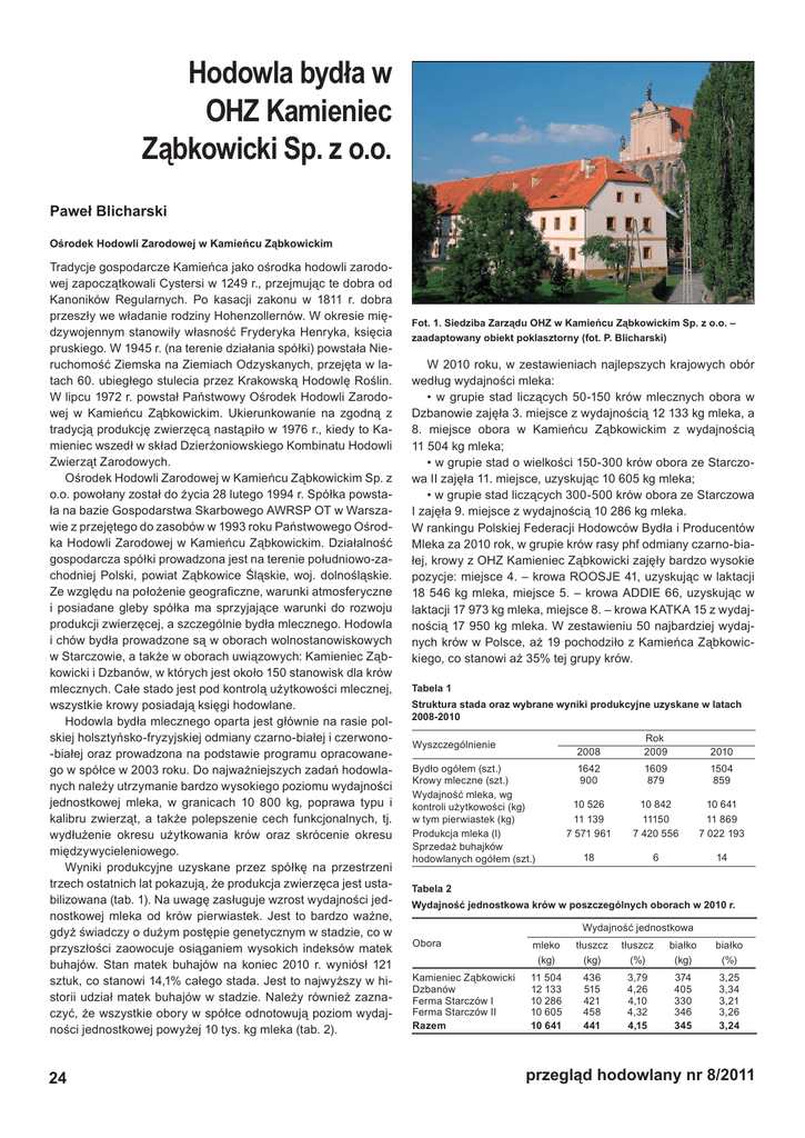 Hodowla bydła w OHZ Kamieniec Ząbkowicki Sp. z o.o. Paweł Blicharski Ośrodek Hodowli Zarodowej w Kamieńcu Ząbkowickim Tradycje gospodarcze Kamieńca jako ośrodka hodowli zarodowej zapoczątkowali Cystersi w 1249 r., przejmując te dobra od Kanoników Regularnych. Po kasacji zakonu w 1811 r. dobra przeszły we władanie rodziny Hohenzollernów. W okresie międzywojennym stanowiły własność Fryderyka Henryka, księcia pruskiego. W 1945 r. (na terenie działania spółki) powstała Nieruchomość Ziemska na Ziemiach Odzyskanych, przejęta w latach 60. ubiegłego stulecia przez Krakowską Hodowlę Roślin. W lipcu 1972 r. powstał Państwowy Ośrodek Hodowli Zarodowej w Kamieńcu Ząbkowickim. Ukierunkowanie na zgodną z tradycją produkcję zwierzęcą nastąpiło w 1976 r., kiedy to Kamieniec wszedł w skład Dzierżoniowskiego Kombinatu Hodowli Zwierząt Zarodowych. Ośrodek Hodowli Zarodowej w Kamieńcu Ząbkowickim Sp. z o.o. powołany został do życia 28 lutego 1994 r. Spółka powstała na bazie Gospodarstwa Skarbowego AWRSP OT w Warszawie z przejętego do zasobów w 1993 roku Państwowego Ośrodka Hodowli Zarodowej w Kamieńcu Ząbkowickim. Działalność gospodarcza spółki prowadzona jest na terenie południowo-zachodniej Polski, powiat Ząbkowice Śląskie, woj. dolnośląskie. Ze względu na położenie geograficzne, warunki atmosferyczne i posiadane gleby spółka ma sprzyjające warunki do rozwoju produkcji zwierzęcej, a szczególnie bydła mlecznego. Hodowla i chów bydła prowadzone są w oborach wolnostanowiskowych w Starczowie, a także w oborach uwiązowych: Kamieniec Ząbkowicki i Dzbanów, w których jest około 150 stanowisk dla krów mlecznych. Całe stado jest pod kontrolą użytkowości mlecznej, wszystkie krowy posiadają księgi hodowlane. Hodowla bydła mlecznego oparta jest głównie na rasie polskiej holsztyńsko-fryzyjskiej odmiany czarno-białej i czerwono-białej oraz prowadzona na podstawie programu opracowanego w spółce w 2003 roku. Do najważniejszych zadań hodowlanych należy utrzymanie bardzo wysokiego poziomu wydajności jednostkowej mleka, w granicach 10 800 kg, poprawa typu i kalibru zwierząt, a także polepszenie cech funkcjonalnych, tj. wydłużenie okresu użytkowania krów oraz skrócenie okresu międzywycieleniowego. Wyniki produkcyjne uzyskane przez spółkę na przestrzeni trzech ostatnich lat pokazują, że produkcja zwierzęca jest ustabilizowana (tab. 1). Na uwagę zasługuje wzrost wydajności jednostkowej mleka od krów pierwiastek. Jest to bardzo ważne, gdyż świadczy o dużym postępie genetycznym w stadzie, co w przyszłości zaowocuje osiąganiem wysokich indeksów matek buhajów. Stan matek buhajów na koniec 2010 r. wyniósł 121 sztuk, co stanowi 14,1% całego stada. Jest to najwyższy w historii udział matek buhajów w stadzie. Należy również zaznaczyć, że wszystkie obory w spółce odnotowują poziom wydajności jednostkowej powyżej 10 tys. kg mleka (tab. 2). 24 Fot. 1. Siedziba Zarządu OHZ w Kamieńcu Ząbkowickim Sp. z o.o. – zaadaptowany obiekt poklasztorny (fot. P. Blicharski) W 2010 roku, w zestawieniach najlepszych krajowych obór według wydajności mleka: • w grupie stad liczących 50-150 krów mlecznych obora w Dzbanowie zajęła 3. miejsce z wydajnością 12 133 kg mleka, a 8. miejsce obora w Kamieńcu Ząbkowickim z wydajnością 11 504 kg mleka; • w grupie stad o wielkości 150-300 krów obora ze Starczowa II zajęła 11. miejsce, uzyskując 10 605 kg mleka; • w grupie stad liczących 300-500 krów obora ze Starczowa I zajęła 9. miejsce z wydajnością 10 286 kg mleka. W rankingu Polskiej Federacji Hodowców Bydła i Producentów Mleka za 2010 rok, w grupie krów rasy phf odmiany czarno-białej, krowy z OHZ Kamieniec Ząbkowicki zajęły bardzo wysokie pozycje: miejsce 4. – krowa ROOSJE 41, uzyskując w laktacji 18 546 kg mleka, miejsce 5. – krowa ADDIE 66, uzyskując w laktacji 17 973 kg mleka, miejsce 8. – krowa KATKA 15 z wydajnością 17 950 kg mleka. W zestawieniu 50 najbardziej wydajnych krów w Polsce, aż 19 pochodziło z Kamieńca Ząbkowickiego, co stanowi aż 35% tej grupy krów. Tabela 1 Struktura stada oraz wybrane wyniki produkcyjne uzyskane w latach 2008-2010 Wyszczególnienie Bydło ogółem (szt.) Krowy mleczne (szt.) Wydajność mleka, wg kontroli użytkowości (kg) w tym pierwiastek (kg) Produkcja mleka (l) Sprzedaż buhajków hodowlanych ogółem (szt.) 2008 Rok 2009 2010 1642 900 1609 879 1504 859 10 526 11 139 7 571 961 10 842 11150 7 420 556 10 641 11 869 7 022 193 18 6 14 Tabela 2 Wydajność jednostkowa krów w poszczególnych oborach w 2010 r. Wydajność jednostkowa Obora mleko (kg) tłuszcz (kg) tłuszcz (%) białko (kg) białko (%) Kamieniec Ząbkowicki Dzbanów Ferma Starczów I Ferma Starczów II Razem 11 504 12 133 10 286 10 605 10 641 436 515 421 458 441 3,79 4,26 4,10 4,32 4,15 374 405 330 346 345 3,25 3,34 3,21 3,26 3,24 przegląd hodowlany nr 8/2011 Fot. 2. Wyremontowana obora uwiązowa w Starczowie II (fot. P. Blicharski) W rankingu krów o najwyższych wydajnościach w rasie phf odmiany czerwono-białej krowa MODRA 30 zajęła 3. miejsce, uzyskując 14 998 kg mleka, zaś krowa JĄTKA 38 z wydajnością 14 187 kg mleka miejsce 10. W zestawieniu krów rekordzistek, których wydajność życiowa wynosi ponad 100 tys. kg mleka, krowa KROPKA 25 zajęła 4. miejsce, uzyskując wydajność 126 917 kg mleka, a 5. miejsce – krowa BOLKA 16, która w ośmiu laktacjach uzyskała 125 443 kg mleka. Powyższe zestawienia świadczą o tym, że Ośrodek Hodowli Zarodowej w Kamieńcu Ząbkowickim spełnia ważną rolę w postępie hodowlanym w kraju, a także przyczynia się do poprawy wydajności mleka w Polsce. Uzyskiwanie tak dobrych wyników jest możliwe dzięki stworzeniu odpowiednich warunków bytowych dla zwierząt. Żywienie krów mlecznych odbywa się na bazie kiszonki z kukurydzy oraz kiszonek z traw. Wszystkie pasze są podawane wozami paszowy