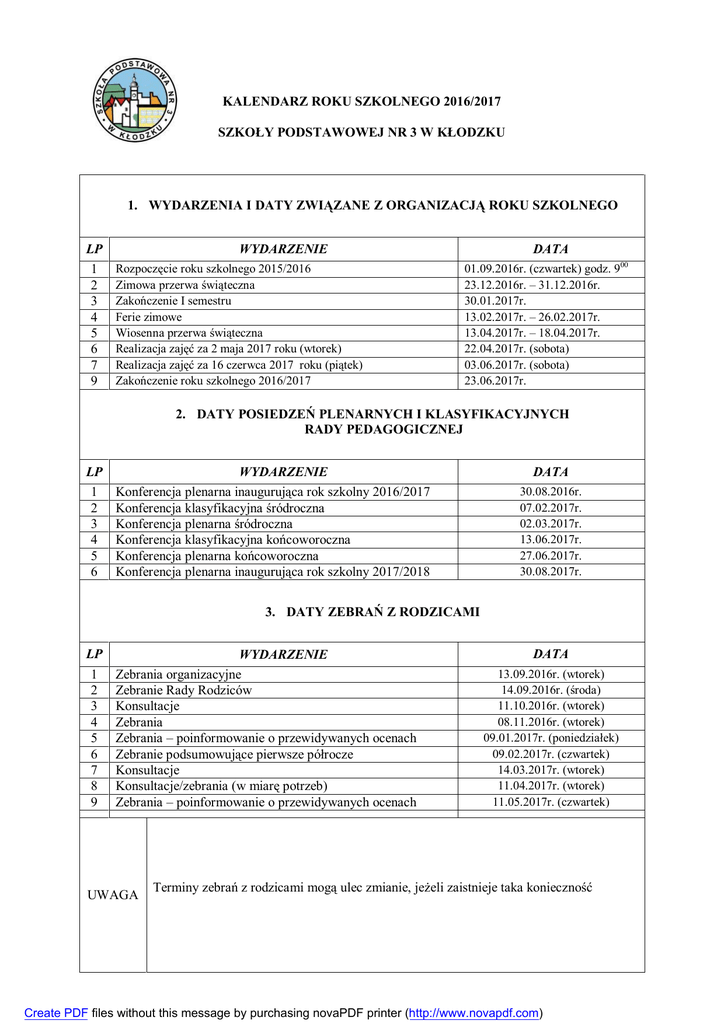 KALENDARZ ROKU SZKOLNEGO 2016/2017 SZKOŁY PODSTAWOWEJ NR 3 W KŁODZKU 1. WYDARZENIA I DATY ZWIĄZANE Z ORGANIZACJĄ ROKU SZKOLNEGO LP 1 2 3 4 5 6 7 9 WYDARZENIE Rozpoczęcie roku szkolnego 2015/2016 Zimowa przerwa świąteczna Zakończenie I semestru Ferie zimowe Wiosenna przerwa świąteczna Realizacja zajęć za 2 maja 2017 roku (wtorek) Realizacja zajęć za 16 czerwca 2017 roku (piątek) Zakończenie roku szkolnego 2016/2017 DATA 01.09.2016r. (czwartek) godz. 900 23.12.2016r. – 31.12.2016r. 30.01.2017r. 13.02.2017r. – 26.02.2017r. 13.04.2017r. – 18.04.2017r. 22.04.2017r. (sobota) 03.06.2017r. (sobota) 23.06.2017r. 2. DATY POSIEDZEŃ PLENARNYCH I KLASYFIKACYJNYCH RADY PEDAGOGICZNEJ LP 1 2 3 4 5 6 WYDARZENIE Konferencja plenarna inaugurująca rok szkolny 2016/2017 Konferencja klasyfikacyjna śródroczna Konferencja plenarna śródroczna Konferencja klasyfikacyjna końcoworoczna Konferencja plenarna końcoworoczna Konferencja plenarna inaugurująca rok szkolny 2017/2018 DATA 30.08.2016r. 07.02.2017r. 02.03.2017r. 13.06.2017r. 27.06.2017r. 30.08.2017r. 3. DATY ZEBRAŃ Z RODZICAMI LP 1 2 3 4 5 6 7 8 9 WYDARZENIE Zebrania organizacyjne Zebranie Rady Rodziców Konsultacje Zebrania Zebrania – poinformowanie o przewidywanych ocenach Zebranie podsumowujące pierwsze półrocze Konsultacje Konsultacje/zebrania (w miarę potrzeb) Zebrania – poinformowanie o przewidywanych ocenach UWAGA DATA 13.09.2016r. (wtorek) 14.09.2016r. (środa) 11.10.2016r. (wtorek) 08.11.2016r. (wtorek) 09.01.2017r. (poniedziałek) 09.02.2017r. (czwartek) 14.03.2017r. (wtorek) 11.04.2017r. (wtorek) 11.05.2017r. (czwartek) Terminy zebrań z rodzicami mogą ulec zmianie, jeżeli zaistnieje taka konieczność Create PDF files without this message by purchasing novaPDF printer (http://www.novapdf.com) 4. DNI DODATKOWO WOLNE OD ZAJĘĆ DYDAKTYCZNO-WYCHOWAWCZYCH LP 1 2 DATA WYDARZENIE 14 października 2016 roku (piątek) 20 marca 2017 roku (poniedziałek) Dzień Edukacji Narodowej Dzień wolny od zajęć lekcyjnych na podstawie art. 74 KN Dzień Samorządności Dzień wolny od zajęć dydaktyczno-wychowawczych na podstawie §5 ust. 1 i 4 Rozporządzenia w sprawie organizacji roku szkolnego Realizacja zajęć za 2 maja 2017 roku (wtorek) 3 4 5 22 kwietnia 2017 roku (sobota) 3 czerwca 2017 roku (sobota) 22 czerwca 2017 roku (czwartek) „Dzień Ziemi” – organizacja zajęć o charakterze ekologicznym Dzień wolny od zajęć dydaktyczno-wychowawczych na podstawie §5 ust. 1 i 4 Rozporządzenia w sprawie organizacji roku szkolnego Realizacja zajęć za 16 czerwca 2017 roku (piątek), tj. dzień przypadający po Bożym Ciele Dzień Dziecka Dzień wolny od zajęć dydaktyczno-wychowawczych na podstawie §5 ust. 1 i 4 Rozporządzenia w sprawie organizacji roku szkolnego Gala Mistrzów Dzień wolny od zajęć dydaktyczno-wychowawczych na podstawie §5 ust. 1 i 4 Rozporządzenia w sprawie organizacji roku szkolnego 6. DNI WOLNE OD ZAJĘĆ Dzień przypadający po 1 Maja i przez 3 Maja 1 2 maja 2017 roku (wtorek) Dzień wolny od zajęć lekcyjnych odpracowany 22 kwietnia 2017 roku (sobota) Dzień Samorządności Dzień wolny od zajęć dydaktyczno-wychowawczych na podstawie §5 ust. 1 i 4 Rozporządzenia w sprawie organizacji roku szkolnego Dzień przypadający po Bożym Ciele 2 16 czerwca 2017 roku (piątek) Dzień wolny od zajęć lekcyjnych odpracowany 3 czerwca 2017 roku (sobota) Dzień Dziecka Dzień wolny od zajęć dydaktyczno-wychowawczych na podstawie §5 ust. 1 i 4 Rozporządzenia w sprawie organizacji roku szkolnego Create PDF files without this message by purchasing novaPDF printer (http://www.novapdf.com) Terminy związane z klasyfikacją uczniów 1 Termin poinformowania uczniów i rodziców o przewidywanych ocenach z zajęć edukacyjnych i zachowania za I półrocze do 09.01.2017 (zebranie) 2 Termin wpisania ocen końcowych za I półrocze w dzienniku lekcyjnym do 31.01.2017 3 Termin zatwierdzenia wyników klasyfikacji za I półrocze. Posiedzenie rady pedagogicznej 07.02.2017 do 11.05.2017 4 5 6 Termin poinformowania uczniów i rodziców o przewidywanych ocenach rocznych z zajęć edukacyjnych i zachowania Termin wpisania ocen rocznych w dzienniku lekcyjnym Termin zatwierdzenia wyników klasyfikacji za rok szkolny. Posiedzenie rady pedagogicznej Create PDF files without this message by purchasing novaPDF printer (http://www.novapdf.com) (zebranie) 06.06.2017 13.06.2017