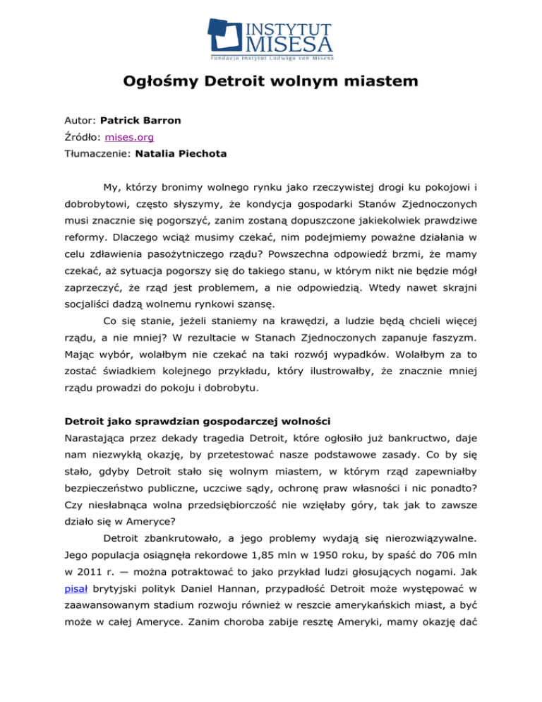 Ogłośmy Detroit wolnym miastem Autor: Patrick Barron Źródło: mises.org Tłumaczenie: Natalia Piechota My, którzy bronimy wolnego rynku jako rzeczywistej drogi ku pokojowi i dobrobytowi, często słyszymy, że kondycja gospodarki Stanów Zjednoczonych musi znacznie się pogorszyć, zanim zostaną dopuszczone jakiekolwiek prawdziwe reformy. Dlaczego wciąż musimy czekać, nim podejmiemy poważne działania w celu zdławienia pasożytniczego rządu? Powszechna odpowiedź brzmi, że mamy czekać, aż sytuacja pogorszy się do takiego stanu, w którym nikt nie będzie mógł zaprzeczyć, że rząd jest problemem, a nie odpowiedzią. Wtedy nawet skrajni socjaliści dadzą wolnemu rynkowi szansę. Co się stanie, jeżeli staniemy na krawędzi, a ludzie będą chcieli więcej rządu, a nie mniej? W rezultacie w Stanach Zjednoczonych zapanuje faszyzm. Mając wybór, wolałbym nie czekać na taki rozwój wypadków. Wolałbym za to zostać świadkiem kolejnego przykładu, który ilustrowałby, że znacznie mniej rządu prowadzi do pokoju i dobrobytu. Detroit jako sprawdzian gospodarczej wolności Narastająca przez dekady tragedia Detroit, które ogłosiło już bankructwo, daje nam niezwykłą okazję, by przetestować nasze podstawowe zasady. Co by się stało, gdyby Detroit stało się wolnym miastem, w którym rząd zapewniałby bezpieczeństwo publiczne, uczciwe sądy, ochronę praw własności i nic ponadto? Czy niesłabnąca wolna przedsiębiorczość nie wzięłaby góry, tak jak to zawsze działo się w Ameryce? Detroit zbankrutowało, a jego problemy wydają się nierozwiązywalne. Jego populacja osiągnęła rekordowe 1,85 mln w 1950 roku, by spaść do 706 mln w 2011 r. ― można potraktować to jako przykład ludzi głosujących nogami. Jak pisał brytyjski polityk Daniel Hannan, przypadłość Detroit może występować w zaawansowanym stadium rozwoju również w reszcie amerykańskich miast, a być może w całej Ameryce. Zanim choroba zabije resztę Ameryki, mamy okazję dać szansę reformom wolnorynkowym w dość kontrolowanych warunkach — zbankrutowanym i dysfunkcyjnym mieście Detroit. Jedyne, czego Detroit potrzebuje, to wolność gospodarcza i ochrona praw własności. Oswobodźcie Detroit od wszelkiego rodzaju rządu, łącznie z rządem federalnym. Ogłoście Detroit wolnym miastem (możesz spać spokojnie, Detroit, Ameryka przyjdzie z pomocą, jeśli ci krwiożerczy Kanadyjczycy zaatakują!). Innymi słowy, nikt nie płaciłby żadnych federalnych podatków, ani nie podlegałby żadnym federalnym regulacjom. Czyż nie byłoby miło nie płacić podatków federalnych, nawet ubezpieczeń społecznych i składek zdrowotnych? Zróbcie to z podatkami w Michigan ― żadnych podatków, ale też żadnej federalnej ani stanowej pomocy. Wolne Detroit nie miałoby absolutnie żadnych regulacji dotyczących pracy i miejsc pracy, czyli regulacji dotyczących płac minimalnych, obowiązkowego ubezpieczenia, równouprawnienia, zasad bezpieczeństwa pracy itd. Ludzie mogliby pracować na takich zasadach, jakie ustalałaby ich krańcowa produktywność. Skończmy z biurokracją blokującą zakładanie działalności i jej rozwój poprzez licencjonowanie, regulacje zdrowotne i inspekcje, ograniczenia strefowe itp. Nie bójcie się, że ludzie mogą podejmować się niebezpiecznych zawodów za niską płacę wbrew swej woli. Prawda jest taka, że pracodawcy muszą rekrutować pracowników, a nie tyranizować i przykuwać łańcuchami do miejsc pracy. Nie zależy im też na wyrządzaniu krzywdy pracownikom ani klientom. Jeśli tak będzie, zwykłe prawo cywilne i handlowe wystarczą. Sprywatyzujmy wszelkie usługi państwowe, takie jak wywóz śmieci, usługi kanalizacyjne i zezwólmy na nieograniczoną konkurencję w tych i innych obszarach ― nawet w przypadku straży pożarnej. Sprzedajmy własność miasta (kto potrzebuje mieszkania pustych socjalne biur, własnością bez ich rządowych obecnych biurokratów?) lokatorów, i tak uczyńmy by byli odpowiedzialni za własne siedziby. Możecie się zdziwić, jak odpowiedzialni mogą być ludzie za swoją własność. Skończmy z państwową edukacją i jej kosztami. Zezwólmy ludziom na takie wykształcenie, jakiego pragną — jakiekolwiek by ono nie było. Skoro połowa populacji Detroit to funkcjonalni analfabeci, jakie jest ryzyko? Chcecie bezpiecznego społeczeństwa? Pozwólcie więc ludziom zbroić się bez żadnych wymagań licencyjnych. Ponieważ policji z Detroit zajmuje przeciętnie około godziny odebranie zgłoszenia, jest to praktyczne rozwiązanie problemu podstawowego ludzkiego prawa do samoobrony. Nade wszystko skończcie z opieką społeczną. Niszczący cykl zależności doprowadza amerykańskie miasta do finansowej i kulturalnej ruiny. Nie oczekujcie zmiany w jedną noc ― ale kto wie? Wolny rynek zawsze zaskakuje nowymi innowacjami. Z początku można się spodziewać wysypu rodzinnych biznesów, sprzedawców ulicznych, nielicencjonowanych i nieopodatkowanych usług, takich jak naprawa popsutych sprzętów, szkoły domowe, prywatne taksówki itp. Jeśli niższe koszty i mniejsze obciążenia regulacyjne kuszą Nike i inne amerykańskie przedsiębiorstwa tak, że przenoszą one swoje procesy produkcyjne za granicę, czemu miałyby nie wziąć pod uwagę wolnego Detroit? Szykujcie się na niespodziankę. Pozwólmy Detroit stać się bezpiecznym, chętnym do współpracy miastem, będącym przykładem tego, jak może wyglądać Ameryka. Wolność gospodarcza zapewni odrodzenie Detroit. To miasto może stać się przykładem prawdziwego dobrobytu dla reszty Ameryki i świata.