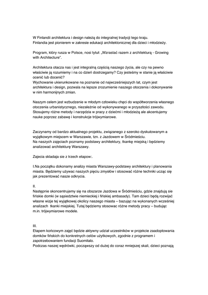 W Finlandii architektura i design należą do integralnej tradycji tego kraju. Finlandia jest pionierem w zakresie edukacji architektonicznej dla dzieci i młodzieży. Program, który rusza w Polsce, nosi tytuł: „Wzrastać razem z architekturą - Growing with Architecture”. Architektura otacza nas i jest integralną częścią naszego życia, ale czy na pewno właściwie ją rozumiemy i na co dzień dostrzegamy? Czy jesteśmy w stanie ją właściwie ocenić lub docenić? Wychowanie ukierunkowane na poznanie od najwcześniejszych lat, czym jest architektura i design, pozwala na lepsze zrozumienie naszego otoczenia i dokonywanie w nim harmonijnych zmian. Naszym celem jest wzbudzenie w młodym człowieku chęci do współtworzenia własnego otoczenia urbanistycznego, niezależnie od wykonywanego w przyszłości zawodu. Stosujemy różne metody i narzędzia w pracy z dziećmi i młodzieżą ale akcentujemy nauke poprzez zabawę i konstrukcje trójwymiarowe. Zaczynamy od bardzo aktualnego projektu, związanego z szeroko dyskutowanym a wyjątkowym miejscem w Warszawie, tzn. z Jazdowem w Śródmieściu. Na naszych zajęciach poznamy podstawy architektury, tkankę miejską i będziemy analizować architekturę Warszawy. Zajecia skladaja sie z trzech etapow:. I.Na początku dokonamy analizy miasta Warszawy-podstawy architektury i planowania miasta. Będziemy używac naszych pięciu zmysłów i stosować różne techniki ucząc się jak prezentować nasze odkrycia. II. Następnie skoncentrujemy się na obszarze Jazdowa w Śródmieściu, gdzie znajdują sie fińskie domki (w sąsiedztwie niemieckiej i fińskiej ambasady). Tam dzieci będą rozwijać własne wizje tej wyjątkowej okolicy naszego miasta – bazując na wykonanych wcześniej analizach tkanki miejskiej. Tutaj będziemy stosowac różne metody pracy – budując m.in. trójwymiarowe modele. III. Etapem końcowym zajęć będzie aktywny udział uczestników w projekcie zaadoptowania domków fińskich do konkretnych celów użytkowych, zgodnie z programem i zapotrzebowaniem fundacji Suomitalo. Podczas naszej wędrówki, począwszy od dużej do coraz mniejszej skali, dzieci poznają elementarne zagadnienia z dziedziny architektury i urbanistyki. Ambasada Finlandii udostępniła nam pomieszczenia do prowadzenia zajęć edukacyjnych w swoim budynku. Tym samym fińska szkoła architektoniczna znalazła odpowiednią siedzibę. Tworzymy 3 grupy wiekowe: od 7 do 9 lat oraz od 10 do 12 lat od 13 do 15 lat Uwaga studenci: jeżeli nasz projekt spotka się z zainteresowaniem studentów architektury to instnieje możliwośc, stworzenia programu dedykowanemu również dla nich . Grupy będą sie składać z 5 do 10 uczestników. Zajęcia odbywać się będą raz w tygodniu po 90 minut w soboty od 10.00 do 11.30 oraz od 12.00 do 13.30 oraz 14.00 do 15.30 [inne mozliwe termine wtorek, środa, czwartek od 16.30 do 18.00] Zajęcia poprowadzi fińska architektka Tia-Catherine Lindgren-Ornass w języku angielskim (na życzenie także po niemiecku, fińsku lub polsku). Nie oczekujemy płynnej znajomości języka angielskiego! Nie mniej podstawy tego języka są niezbędne Prosze o wypelnienia ankiety i wyslania go na adres HYPERLINK "mailto:[email protected]" [email protected]
