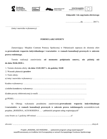 Załącznik 1 do zapytania ofertowego ……………….., dn. …….…… 2017 r. ………………………………………… (imię i nazwisko wykonawcy) FORMULARZ OFERTY Zamawiający: Miejskie Centrum Pomocy Społecznej w Pabianicach zaprasza do złożenia ofert na prowadzenie wsparcia indywidualnego i warsztatów- w ramach konsultacji prawnych w zakresie prawa rodzinnego. Termin realizacji zamówienia: od momentu podpisania umowy, nie później niż do dnia 30.06.2018 r. 1. Termin złożenia oferty: do dnia 13.02.2017 r. do godziny 10.00 2. Warunki płatności:przelew 3. Treść oferty: a) imię i nazwisko wykonawcy: ……………………………………………………………………..…… b) adres wykonawcy: …………………………………………………………………………… c) telefon kontaktowy wykonawcy: ………………………………………………………………….. d) adres poczty elektronicznej (e-mail) ……………………………………………………………. g) PESEL: ….……………...………..………………….…………………………………….. h) Oferuję wykonanie przedmiotu zamówienia-prowadzenie wsparcia indywidualnego i warsztatów- w ramach konsultacji prawnych w zakresie prawa rodzinnegodla uczestników/czek projektu „RODZINA, ACH RODZINA … - pabianicki program usług wspierających” cena brutto za 1 godzinę (60 minut) ………………………………………………zł słownie: …………………………………………………………………………………………………………….złotych Projekt „RODZINA, ACH RODZINA … - pabianicki program usług wspierających” współfinansowany ze środków Unii Europejskiej w ramach Europejskiego Funduszu Społecznego 4. Oświadczam, że zapoznałem się z opisem przedmiotu zamówienia i nie wnoszę do niego zastrzeżeń. 5. Oświadczam, że posiadam wiedzę i doświadczenie niezbędne do wykonania zamówienia oraz posiadam uprawnienia do wykonywania działalności lub czynności, jeżeli ustawy nakładają obowiązek posiadania takich uprawnień. 6. Oświadczam, że dysponuję odpowiednim potencjałem technicznym do wykonania zamówienia. 7. Oświadczam, że jestem w pełni dyspozycyjny/a i zobowiązuję się do dostosowania terminów prowadzenia wsparcia indywidualnego do potrzeb uczestników projektu. 8. Oświadczam, że w przypadku wyboru mojej oferty jako najkorzystniejszej zobowiązuję się do zawarcia umowy na realizację niniejszej usługi na zasadach i warunkach opisanych w zapytaniu ofertowym, w terminie i miejscu wyznaczonym przez Zamawiającego. 9. Oświadczam, że nie jestem powiązany/a osobowo lub kapitałowo z Zamawiającym, tj. Miejskim Centrum Pomocy Społecznej w Pabianicach, ul. Gdańska 7, 95-200 Pabianice. Przez powiązania kapitałowe lub osobowe rozumie się wzajemne powiązania między Zamawiającym lub osobami upoważnionymi do zaciągania zobowiązań w imieniu Zamawiającego lub osobami wykonującymi w imieniu Zamawiającego czynności związane z przygotowaniem i przeprowadzeniem procedury wyboru Wykonawcy a Wykonawcą, polegające w szczególności na: 1. uczestniczeniu w spółce jako wspólnik spółki cywilnej lub spółki osobowej, 2. posiadaniu co najmniej 10% udziałów lub akcji, 3. pełnieniu funkcji członka organu nadzorczego lub zarządzającego, prokurenta, pełnomocnika, 4. pozostawaniu w związku małżeńskim, w stosunku pokrewieństwa lub powinowactwa w linii prostej, pokrewieństwa lub powinowactwa w linii bocznej do drugiego stopnia lub w stosunku przysposobienia, opieki lub kurateli, 5. pozostawaniu w takim stosunku prawnym lub faktycznym, że może to budzić uzasadnione wątpliwości co do bezstronności tych osób. 10.Zamawiający zastrzega sobie prawo do unieważnienia postępowania. 11.Integralną część niniejszej oferty cenowej stanowią następujące załączniki: 1) …………………………………………………………………………………………..… 2) …………………………………………………………………………………………….. 3) …………………………………………………………………………………………….. 4) …………………………………………………………………………………………….. 5) ……………………………………………………………………………………………… ……………………………….. podpis wykonawcy Projekt „RODZINA, ACH RODZINA … - pabianicki program usług wspierających” współfinansowany ze środków Unii Europejskiej w ramach Europejskiego Funduszu Społecznego