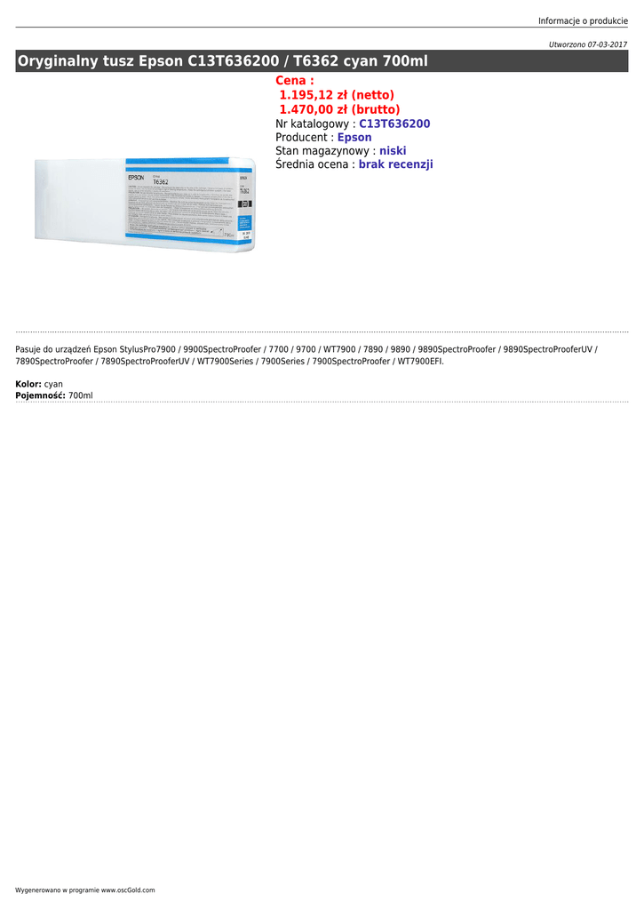 Informacje o produkcie Utworzono 07-03-2017 Oryginalny tusz Epson C13T636200 / T6362 cyan 700ml Cena : 1.195,12 zł (netto) 1.470,00 zł (brutto) Nr katalogowy : C13T636200 Producent : Epson Stan magazynowy : niski Średnia ocena : brak recenzji Pasuje do urządzeń Epson StylusPro7900 / 9900SpectroProofer / 7700 / 9700 / WT7900 / 7890 / 9890 / 9890SpectroProofer / 9890SpectroProoferUV / 7890SpectroProofer / 7890SpectroProoferUV / WT7900Series / 7900Series / 7900SpectroProofer / WT7900EFI. Kolor: cyan Pojemność: 700ml Wygenerowano w programie www.oscGold.com