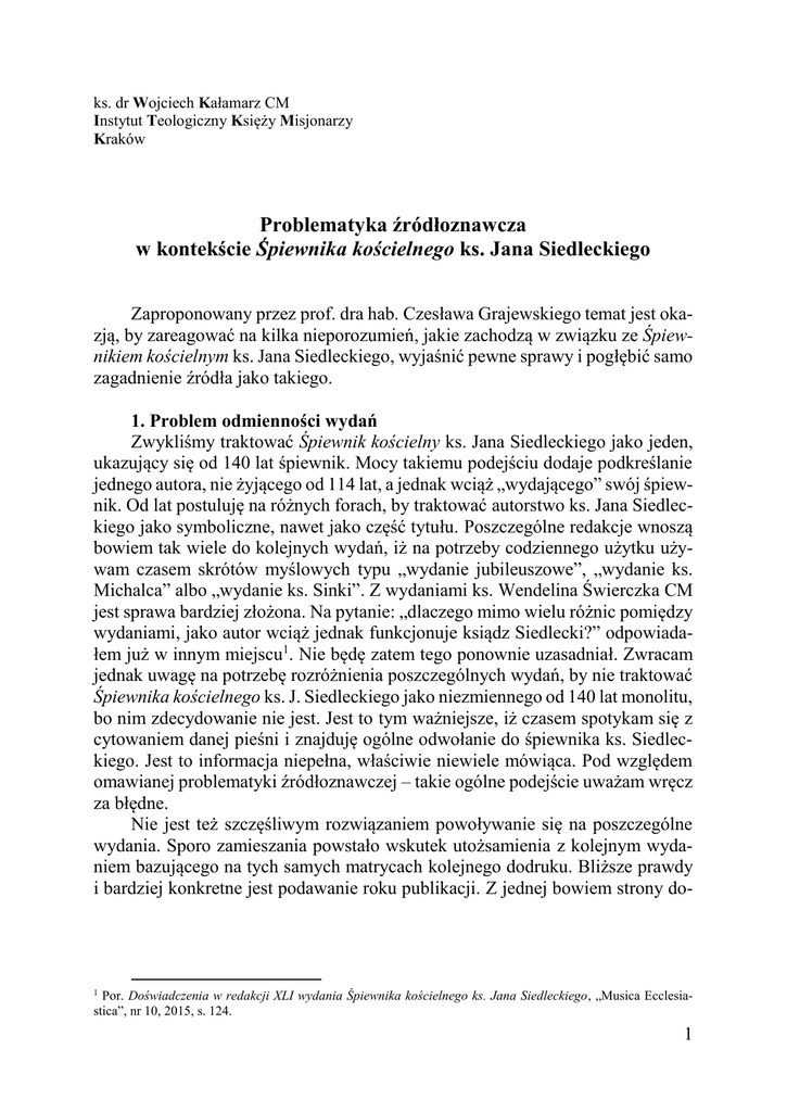 ks. dr Wojciech Kałamarz CM Instytut Teologiczny Księży Misjonarzy Kraków Problematyka źródłoznawcza w kontekście Śpiewnika kościelnego ks. Jana Siedleckiego Zaproponowany przez prof. dra hab. Czesława Grajewskiego temat jest okazją, by zareagować na kilka nieporozumień, jakie zachodzą w związku ze Śpiewnikiem kościelnym ks. Jana Siedleckiego, wyjaśnić pewne sprawy i pogłębić samo zagadnienie źródła jako takiego. 1. Problem odmienności wydań Zwykliśmy traktować Śpiewnik kościelny ks. Jana Siedleckiego jako jeden, ukazujący się od 140 lat śpiewnik. Mocy takiemu podejściu dodaje podkreślanie jednego autora, nie żyjącego od 114 lat, a jednak wciąż „wydającego” swój śpiewnik. Od lat postuluję na różnych forach, by traktować autorstwo ks. Jana Siedleckiego jako symboliczne, nawet jako część tytułu. Poszczególne redakcje wnoszą bowiem tak wiele do kolejnych wydań, iż na potrzeby codziennego użytku używam czasem skrótów myślowych typu „wydanie jubileuszowe”, „wydanie ks. Michalca” albo „wydanie ks. Sinki”. Z wydaniami ks. Wendelina Świerczka CM jest sprawa bardziej złożona. Na pytanie: „dlaczego mimo wielu różnic pomiędzy wydaniami, jako autor wciąż jednak funkcjonuje ksiądz Siedlecki?” odpowiadałem już w innym miejscu1. Nie będę zatem tego ponownie uzasadniał. Zwracam jednak uwagę na potrzebę rozróżnienia poszczególnych wydań, by nie traktować Śpiewnika kościelnego ks. J. Siedleckiego jako niezmiennego od 140 lat monolitu, bo nim zdecydowanie nie jest. Jest to tym ważniejsze, iż czasem spotykam się z cytowaniem danej pieśni i znajduję ogólne odwołanie do śpiewnika ks. Siedleckiego. Jest to informacja niepełna, właściwie niewiele mówiąca. Pod względem omawianej problematyki źródłoznawczej – takie ogólne podejście uważam wręcz za błędne. Nie jest też szczęśliwym rozwiązaniem powoływanie się na poszczególne wydania. Sporo zamieszania powstało wskutek utożsamienia z kolejnym wydaniem bazującego na tych samych matrycach kolejnego dodruku. Bliższe prawdy i bardziej konkretne jest podawanie roku publikacji. Z jednej bowiem strony do- Por. Doświadczenia w redakcji XLI wydania Śpiewnika kościelnego ks. Jana Siedleckiego, „Musica Ecclesiastica”, nr 10, 2015, s. 124. 1 1 druki z początku XX wieku nie różniły się między sobą, a liczone były przez wydawcę jako kolejne wydania2, z drugiej strony dodruki z lat 80-tych, 90-tych XX wieku czy początku XXI wieku różniły się między sobą, a wydawane były jako to samo wydanie. Wskutek takiej historii wydań i dodruków podjąłem decyzję, by w XLI wydaniu z jednej strony zachować tradycyjne, przyjęte przez ks. Wendelina Świerczka sposoby informowania o wydaniach do tzw. wydania jubileuszowego włącznie. Jednak nowsze wydania sygnuję skrótem z podaniem roku publikacji, np. „Siedlec. 1959”. Sugeruję, by przyjąć ten sposób podejścia do poszczególnych wydań śpiewnika ks. Siedleckiego i jego dodruków. 2. Różne źródła śpiewnika Ilekroć mowa o początkach śpiewnika ks. Jana Siedleckiego, nie wolno pominąć śpiewnika innego misjonarza ks. Michała Marcina Mioduszewskiego CM. Wieloczęściowy zbiór ks. Mioduszewskiego powstał wskutek potrzeby duszpasterskiej, jako przede wszystkim pomoc dla organistów3. Jego imponujące rozmiary skłaniały ks. Mioduszewskiego do myślenia o bardziej podręcznej formie, której jednak nie zdołał zrealizować. Mieszkający przez kilka lat z ks. Mioduszewskim ks. Jan Siedlecki CM, po opuszczeniu zgromadzenia, ułożył skromny śpiewniczek jako pomoc katechetyczną do nauczania pieśni w szkole św. Barbary w Krakowie. Był to najpierw śpiewnik bez nut4 oraz wydany dwa lata później, trochę obszerniejszy, zawierający więcej pieśni – śpiewnik z nutami. Obydwaj redaktorzy (Mioduszewski i Siedlecki) do swych śpiewników czerpali pieśni z różnych źródeł, zarówno drukowanych jak i rękopiśmiennych, oraz z żywej tradycji. Nie zawsze jednak podawali źródło pochodzenia tekstów i melodii. Ks. Mioduszewski czynił to nawet bardzo rzadko. Na stronie redakcyjnej pierwszego wydania śpiewniczka z nutami ks. Siedlecki zapisał: Melodie dawne czerpane są ze Śpiewnika X. Mioduszewskiego, a co do nowych melodyj, te pochodzą, albo od autorów którzy są wymienieni przy każdej pieśni, albo ze źródeł najpewniejszych. Od początku zatem przyjęto za podstawowy punkt odniesienia śpiewnik Mioduszewskiego. Będzie on ważnym źródłem dla wszystkich kolejnych redakcji śpiewnika ks. Siedleckiego, także wtedy, gdy ks. Wendelin Świerczek znacznie poszerzy bazę źródłową redagowanych przez siebie wydań. Wśród autorów pieśni w I wydaniu śpiewniczka ks. Siedleckiego z nutami są wymienieni: p. Hajden, p. Radziński, p. Kurpiński, p. Studziński, p. X. Dąbrowski, p. X. Odelgiewicz, p. Wygrzewalski, p. Rudkowski, p. Brzezińska, p. X. Pertak., p. Listowski, p. K. Danek, p. K. Niemczyk, p. Fr. Popper, p. Gorączkiewicz, O. Kolberg. Wśród śpiewników ks. Siedlecki przytacza przede wszystkim śpiewnik ks. Mioduszewskiego, także śpiewnik Klonowskiego, oraz śpiewnik Kiewicza i śpiewnik X. Soleckiego. Czasem podaje zamiast autorów miasta lub Na przykład wydanie IX z 1920 r., wydanie X z 1920 r., wydanie XI z 1922 r. Zresztą wydanie VII z 1918 r. wobec kolejnych różni się jedynie hymnem za cesarza obecnym jeszcze w wydaniu VII. 3 Por. ks. Wojciech Kałamarz, Muzyka u misjonarzy, Kraków 2009, s. 335. 4 Por. ks. Jan Siedlecki, Śpiewniczek pieśni kościelnych dla użytku młodzieży szkolnej, Kraków 1876. 2 2 region pochodzenia. Są więc melodie z Tarnowa, Warszawy, Libiąża, Krakowa, z Galicyji, melodia morawska, mel. Galicana (francuska). Są melodie określone jako „Nowe” (np. Bądź mi litościw), melodie żeglarskie. Przy niektórych zaś nie ma żadnych informacji. Nie ma innych indeksów, wykazów poza „Spise