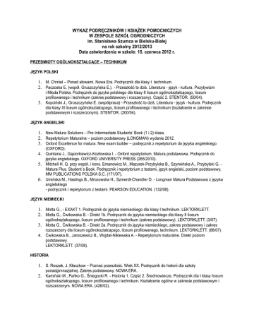 WYKAZ PODRĘCZNIKÓW I KSIĄŻEK POMOCNICZYCH W ZESPOLE SZKÓŁ OGRODNICZYCH im. Stanisława Szumca w Bielsku-Białej na rok szkolny 2012/2013 Data zatwierdzenia w szkole: 15. czerwca 2012 r. PRZEDMIOTY OGÓLNOKSZTAŁCĄCE – TECHNIKUM JĘZYK POLSKI 1. M. Chmiel – Ponad słowami. Nowa Era. Podręcznik dla klasy I technikum. 2. Paczoska E. (współ. Gruszczyńska E.). - Przeszłość to dziś. Literatura - język - kultura. Pozytywizm i Młoda Polska. Podręcznik do języka polskiego dla klasy II liceum ogólnokształcącego, liceum profilowanego i technikum (zakres podstawowy i rozszerzony). Część 2. STENTOR. (50/04). 3. Kopciński J., Gruszczyńska E. (współpraca) - Przeszłość to dziś. Literatura - język - kultura. Podręcznik dla klasy III liceum ogólnokształcącego, liceum profilowanego i technikum (kształcenie w zakresie podstawowym i rozszerzonym). STENTOR. (200/04). JĘZYK ANGIELSKI 1. New Matura Solutions – Pre Intermediate Students’ Book (1 i 2) klasa. 2. Repetytorium Maturalne – poziom podstawowy (LONGMAN) wydanie 2012. 3. Oxford Excellence for matura. New exam builder – podręcznik z repetytorium do języka angielskiego (OXFORD). 4. Quintana J., Gąsiorkiewicz-Kozłowska I. - Oxford repetytorium. Matura podstawowa. Podręcznik do języka angielskiego. OXFORD UNIVERSITY PRESS (265/2010). 5. Mitchell H. Q. przy współ. i kons. Emanowicz M., Mazurek-Przybylska B., Szyrwińska A., Przybylski G. Matura Plus. Student`s Book. Podręcznik i repetytorium z testami, język angielski, poziom podstawowy. MM PUBLICATIONS POLSKA S.C. (171/07). 6. Umińska M., Hastings B., Mrozowska H., Szmerdt-Chandler D. - Longman Matura Podstawowa z języka angielskiego - podręcznik i repetytorium z testami. PEARSON EDUCATION. (132/08). JĘZYK NIEMIECKI 1. Motta G., - EXAKT 1. Podręcznik do języka niemieckiego dla klasy I technikum. LEKTORKLETT. 2. Motta G., Ćwikowska B. - Direkt 1b. Podręcznik do języka niemieckiego dla klasy II liceum ogólnokształcącego, liceum profilowanego i technikum (zakres podstawowy). LEKTORKLETT. (3/07). 3. Motta G., Ćwikowska B. - Direkt 2a. Podręcznik do języka niemieckiego, zakres podstawowy i zakres rozszerzony dla liceum ogólnokształcącego, liceum profilowanego, technikum. LEKTORKLETT. (88/07). 4. Ćwikowska B., Jaroszewicz B., Wojdat-Niklewska A. - Repetytorium maturalne. Direkt poziom podstawowy. LEKTORKLETT. (37/08). HISTORIA 1. S. Roszak, J. Kłaczkow – Poznać przeszłość. Wiek XX. Podręcznik do historii dla szkoły ponadgimnazjalnej. Zakres podstawowy. NOWA ERA. 2. Kamiński M., Pańko G., Śniegocki R. - Historia 1. Część 2. Średniowiecze. Podręcznik dla I klasy liceum ogólnokształcącego, liceum profilowanego i technikum. Kształcenie ogólne w zakresie podstawowym i rozszerzonym. NOWA ERA. (426/02). 3. Kamiński M., Śniegocki R. - Historia od renesansu do czasów napoleońskich. Podręcznik dla II klasy liceum ogólnokształcącego, liceum profilowanego i technikum. Część I. Kształcenie w zakresie podstawowym i rozszerzonym. NOWA ERA. (197/03). 4. Śniegocki R. - Historia. Od kongresu wiedeńskiego do I wojny światowej. Podręcznik dla II klasy liceum ogólnokształcącego, liceum profilowanego i technikum. Część 2. Kształcenie w zakresie podstawowym i rozszerzonym. NOWA ERA. (12/04). 5. Śniegocki R. - Historia. Burzliwy wiek XX. Kształcenie ogólne w zakresie podstawowym i rozszerzonym. Podręcznik dla III klasy liceum ogólnokształcącego, liceum profilowanego i technikum. NOWA ERA. (179/04). WIEDZA O SPOŁECZEŃSTWIE 1.„W centrum uwagi”, zakres podstawowy - nowa podstawa programowa. Nowa Era. 2.Smutek Z., Maleska J., Surmacz B. - Wiedza o społeczeństwie. Zakres podstawowy. Podręcznik dla liceum ogólnokształcącego, liceum profilowanego i technikum (wydanie trzecie zmienione). OPERON. (139/04). MATEMATYKA 1. Babiański W., Chańko L., Ponczek D. - Matematyka 1. Zakres podstawowy. Podręcznik dla szkół ponadgimnazjalnych do nowej podstawy programowej. NOWA ERA. 2. Babiański W., Chańko L., Czarnowska J., Janoch G. - Matematyka 2. Podręcznik dla liceum ogólnokształcącego, liceum profilowanego i technikum. Kształcenie ogólne w zakresie podstawowym. NOWA ERA. (212/08). 3. Babiański W., Chańko L., Czarnowska J., Wesołowska J. – Matematyka 3. Podręcznik dla liceum ogólnokształcącego, liceum profilowanego i technikum. Kształcenie ogólne w zakresie podstawowym. NOWA ERA. (80/09/S). 4. Babiański W., Chańko L., Czarnowska J., Mojsiewicz B., Ponczek D. - Zbiór zadań maturalnych, poziom podstawowy. NOWA ERA. (01/12/09). 5. Masłowska D., Masłowski T., Makowski A., Nodzyński P., Słomińska E., Strzelczyk A. - Testy maturalne, matematyka, poziom podstawowy. AKSJOMAT. FIZYKA I ASTRONOMIA 1. M.Fiałkowska,B. Saganowska .Świat Fizyki. Podręcznik dla szkół ponadgimnazjalnych. ZAMKOR. 2. Salach J. (red.) - Fizyka dla szkół ponadgimnazjalnych. Kurs podstawowy z elementami kursu rozszerzonego koniecznymi do podjęcia studiów technicznych i przyrodniczych. Część 1. ZAMKOR. (90/04). 3. Salach J. (red.) - Fizyka dla szkół ponadgimnazjalnych. Kurs podstawowy z elementami kursu rozszerzonego koniecznymi do podjęcia studiów technicznych i przyrodniczych. Część 2. ZAMKOR. (238/04). CHEMIA . 1. R.Hass A.Mrzigod J.Mrzigod.To jest Chemia.Podrecznik dla szkół ponadgimnazjalnych. Zakres podstawowy. NOWA ERA 2. Litwin M., Styka-Wlazło S., Szymońska J. - Chemia 1. Chemia ogólna i nieorganiczna. Podręcznik dla liceum ogólnokształcącego, liceum profilowanego i technikum. Kształcenie ogólne w zakresie podstawowym i rozszerzonym. NOWA ERA. (220/04). 3. Litwin M., Styka-Wlazło S., Szymońska J. - Chemia organiczna 2. Podręcznik dla liceum ogólnokształcącego, liceum profilowanego i technikum. Kształcenie ogólne w zakresie podstawowym. NOWA ERA. (166/03). BIOLOGIA 1. Biologia na czasie .Zakres Podstawowy .Podręcznik dla szkół ponadgimnazjalnych. Nowa Era. 2. Lewiński W