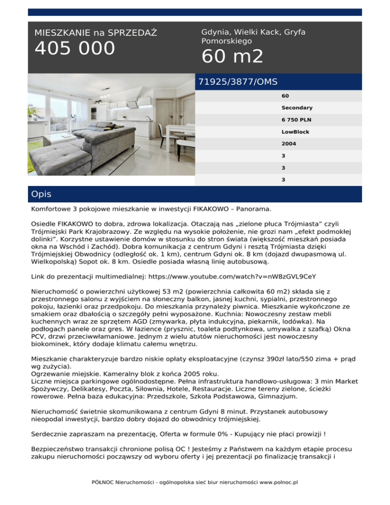 MIESZKANIE na SPRZEDAŻ 405 000 Gdynia, Wielki Kack, Gryfa Pomorskiego 60 m2 71925/3877/OMS 60 Secondary 6 750 PLN LowBlock 2004 3 3 3 Opis Komfortowe 3 pokojowe mieszkanie w inwestycji FIKAKOWO – Panorama. Osiedle FIKAKOWO to dobra, zdrowa lokalizacja. Otaczają nas „zielone płuca Trójmiasta” czyli Trójmiejski Park Krajobrazowy. Ze względu na wysokie położenie, nie grozi nam „efekt podmokłej dolinki”. Korzystne ustawienie domów w stosunku do stron świata (większość mieszkań posiada okna na Wschód i Zachód). Dobra komunikacja z centrum Gdyni i resztą Trójmiasta dzięki Trójmiejskiej Obwodnicy (odległość ok. 1 km), centrum Gdyni ok. 8 km (dojazd dwupasmową ul. Wielkopolską) Sopot ok. 8 km. Osiedle posiada własną linię autobusową. Link do prezentacji multimedialnej: https://www.youtube.com/watch?v=nW8zGVL9CeY Nieruchomość o powierzchni użytkowej 53 m2 (powierzchnia całkowita 60 m2) składa się z przestronnego salonu z wyjściem na słoneczny balkon, jasnej kuchni, sypialni, przestronnego pokoju, łazienki oraz przedpokoju. Do mieszkania przynależy piwnica. Mieszkanie wykończone ze smakiem oraz dbałością o szczegóły pełni wyposażone. Kuchnia: Nowoczesny zestaw mebli kuchennych wraz ze sprzętem AGD (zmywarka, płyta indukcyjna, piekarnik, lodówka). Na podłogach panele oraz gres. W łazience (prysznic, toaleta podtynkowa, umywalka z szafką) Okna PCV, drzwi przeciwwłamaniowe. Jednym z wielu atutów nieruchomości jest nowoczesny biokominek, który dodaje klimatu całemu wnętrzu. Mieszkanie charakteryzuje bardzo niskie opłaty eksploatacyjne (czynsz 390zł lato/550 zima + prąd wg zużycia). Ogrzewanie miejskie. Kameralny blok z końca 2005 roku. Liczne miejsca parkingowe ogólnodostępne. Pełna infrastruktura handlowo-usługowa: 3 min Market Spożywczy, Delikatesy, Poczta, Siłownia, Hotele, Restauracje. Liczne tereny zielone, ścieżki rowerowe. Pełna baza edukacyjna: Przedszkole, Szkoła Podstawowa, Gimnazjum. Nieruchomość świetnie skomunikowana z centrum Gdyni 8 minut. Przystanek autobusowy nieopodal inwestycji, bardzo dobry dojazd do obwodnicy trójmiejskiej. Serdecznie zapraszam na prezentację, Oferta w formule 0% - Kupujący nie płaci prowizji ! Bezpieczeństwo transakcji chronione polisą OC ! Jesteśmy z Państwem na każdym etapie procesu zakupu nieruchomości począwszy od wyboru oferty i jej prezentacji po finalizację transakcji i PÓŁNOC Nieruchomości - ogólnopolska sieć biur nieruchomości www.polnoc.pl przekazanie nieruchomości nowym właścicielom.Pomagamy we wszelkich formalnościach związanych z uzyskaniem kredytu na zakup nieruchomości. Nasz doradca kredytowy bezpłatnie pomoże sprawdzić zdolność kredytową, przedstawi najkorzystniejszą propozycję spośród oferty 21 banków i sprawnie przeprowadzi Państwa przez proces realizacji kredytu. Więcej ofert znajdziesz na naszej stronie www.polnoc.pl * UWAGA! Zamieszczone na naszych stronach oferty nie stanowią oferty w rozumieniu Kodeksu Cywilnego, a dane w nich zawarte mają jedynie charakter informacyjny. Tomasz Wiśniewski tel. 530-647-205 email: [email protected] PÓŁNOC Nieruchomości - ogólnopolska sieć biur nieruchomości www.polnoc.pl Powered by TCPDF (www.tcpdf.org)
