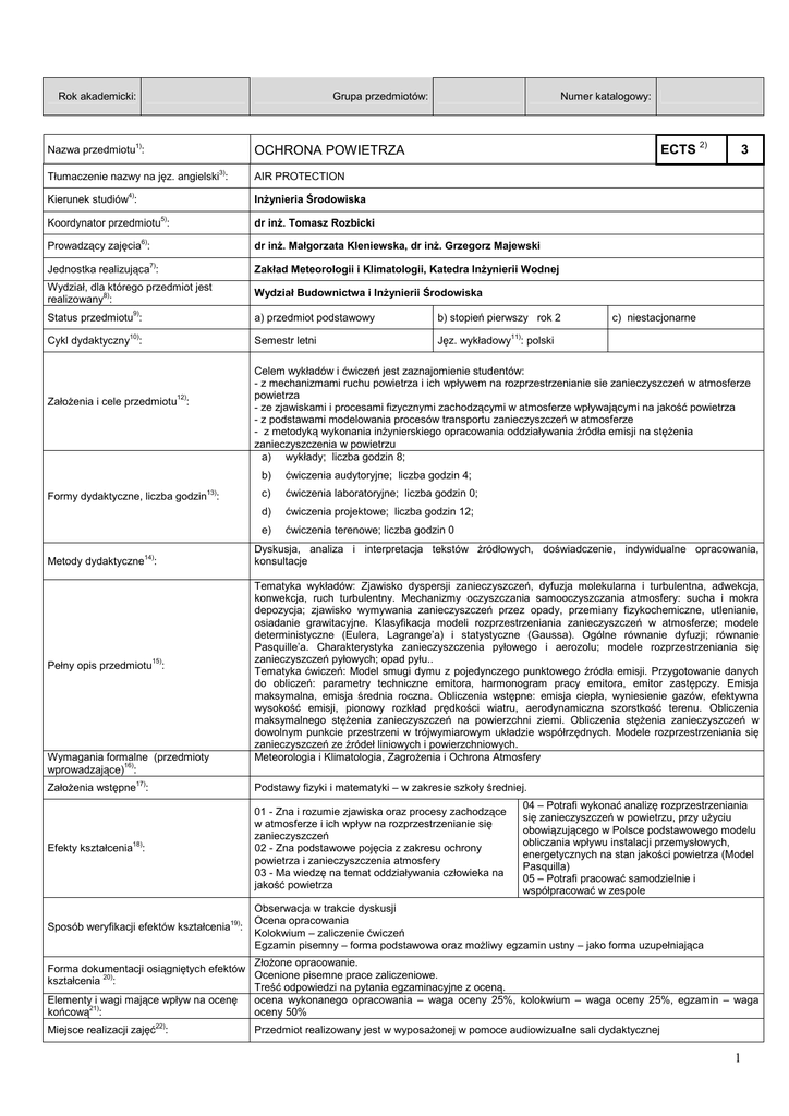 Rok akademicki: Grupa przedmiotów: Nazwa przedmiotu1): OCHRONA POWIETRZA Tłumaczenie nazwy na jęz. angielski3): AIR PROTECTION Kierunek studiów4): Inżynieria Środowiska 5) Numer katalogowy: ECTS Koordynator przedmiotu : dr inż. Tomasz Rozbicki Prowadzący zajęcia6): dr inż. Małgorzata Kleniewska, dr inż. Grzegorz Majewski 7) Jednostka realizująca : Zakład Meteorologii i Klimatologii, Katedra Inżynierii Wodnej Wydział, dla którego przedmiot jest realizowany8): Wydział Budownictwa i Inżynierii Środowiska 9) Status przedmiotu : a) przedmiot podstawowy 10) Cykl dydaktyczny : Semestr letni b) stopień pierwszy rok 2 2) 3 c) niestacjonarne 11) Jęz. wykładowy : polski Celem wykładów i ćwiczeń jest zaznajomienie studentów: - z mechanizmami ruchu powietrza i ich wpływem na rozprzestrzenianie sie zanieczyszczeń w atmosferze powietrza - ze zjawiskami i procesami fizycznymi zachodzącymi w atmosferze wpływającymi na jakość powietrza - z podstawami modelowania procesów transportu zanieczyszczeń w atmosferze - z metodyką wykonania inżynierskiego opracowania oddziaływania źródła emisji na stężenia zanieczyszczenia w powietrzu a) wykłady; liczba godzin 8; Założenia i cele przedmiotu12): 13) Formy dydaktyczne, liczba godzin : Metody dydaktyczne14): Pełny opis przedmiotu15): Wymagania formalne (przedmioty wprowadzające)16): b) ćwiczenia audytoryjne; liczba godzin 4; c) ćwiczenia laboratoryjne; liczba godzin 0; d) ćwiczenia projektowe; liczba godzin 12; e) ćwiczenia terenowe; liczba godzin 0 Dyskusja, analiza i interpretacja tekstów źródłowych, doświadczenie, indywidualne opracowania, konsultacje Tematyka wykładów: Zjawisko dyspersji zanieczyszczeń, dyfuzja molekularna i turbulentna, adwekcja, konwekcja, ruch turbulentny. Mechanizmy oczyszczania samooczyszczania atmosfery: sucha i mokra depozycja; zjawisko wymywania zanieczyszczeń przez opady, przemiany fizykochemiczne, utlenianie, osiadanie grawitacyjne. Klasyfikacja modeli rozprzestrzeniania zanieczyszczeń w atmosferze; modele deterministyczne (Eulera, Lagrange’a) i statystyczne (Gaussa). Ogólne równanie dyfuzji; równanie Pasquille’a. Charakterystyka zanieczyszczenia pyłowego i aerozolu; modele rozprzestrzeniania się zanieczyszczeń pyłowych; opad pyłu.. Tematyka ćwiczeń: Model smugi dymu z pojedynczego punktowego źródła emisji. Przygotowanie danych do obliczeń: parametry techniczne emitora, harmonogram pracy emitora, emitor zastępczy. Emisja maksymalna, emisja średnia roczna. Obliczenia wstępne: emisja ciepła, wyniesienie gazów, efektywna wysokość emisji, pionowy rozkład prędkości wiatru, aerodynamiczna szorstkość terenu. Obliczenia maksymalnego stężenia zanieczyszczeń na powierzchni ziemi. Obliczenia stężenia zanieczyszczeń w dowolnym punkcie przestrzeni w trójwymiarowym układzie współrzędnych. Modele rozprzestrzeniania się zanieczyszczeń ze źródeł liniowych i powierzchniowych. Meteorologia i Klimatologia, Zagrożenia i Ochrona Atmosfery Założenia wstępne17): Podstawy fizyki i matematyki – w zakresie szkoły średniej. Efekty kształcenia18): 01 - Zna i rozumie zjawiska oraz procesy zachodzące w atmosferze i ich wpływ na rozprzestrzenianie się zanieczyszczeń 02 - Zna podstawowe pojęcia z zakresu ochrony powietrza i zanieczyszczenia atmosfery 03 - Ma wiedzę na temat oddziaływania człowieka na jakość powietrza Sposób weryfikacji efektów kształcenia19): Obserwacja w trakcie dyskusji Ocena opracowania Kolokwium – zaliczenie ćwiczeń Egzamin pisemny – forma podstawowa oraz możliwy egzamin ustny – jako forma uzupełniająca 04 – Potrafi wykonać analizę rozprzestrzeniania się zanieczyszczeń w powietrzu, przy użyciu obowiązującego w Polsce podstawowego modelu obliczania wpływu instalacji przemysłowych, energetycznych na stan jakości powietrza (Model Pasquilla) 05 – Potrafi pracować samodzielnie i współpracować w zespole Złożone opracowanie. Forma dokumentacji osiągniętych efektów Ocenione pisemne prace zaliczeniowe. kształcenia 20): Treść odpowiedzi na pytania egzaminacyjne z oceną. Elementy i wagi mające wpływ na ocenę ocena wykonanego opracowania – waga oceny 25%, kolokwium – waga oceny 25%, egzamin – waga końcową21): oceny 50% Miejsce realizacji zajęć22): Przedmiot realizowany jest w wyposażonej w pomoce audiowizualne sali dydaktycznej 1 Literatura podstawowa i uzupełniająca23): 1. Juda J., Chróściel S., 1974: Ochrona powietrza atmosferycznego. Wyd. Nauk.- Techn., Warszawa. 2. Juda J., Chróściel S., 1980: Ochrona powietrza atmosferycznego. Zagadnienia wybrane. Wyd. P.W., Warszawa. 3. Łykowski B. (pod red.), 1999: Podstawy klimatologii stosowanej. Wyd. SGGW, Warszawa. 4. Markiewicz M. T., 2004: Podstawy modelowania rozprzestrzeniania się zanieczyszczeń w powietrzu atmosferycznym. Ofic. Wyd. P.W., Warszawa. 5. Rozporządzenie Ministra Środowiska z dnia 26 stycznia 2011 r. W sprawie odniesienia dla niektórych substancji w powietrzu. UWAGI24): Wskaźniki ilościowe charakteryzujące moduł/przedmiot25) : Szacunkowa sumaryczna liczba godzin pracy studenta (kontaktowych i pracy własnej) niezbędna dla osiągnięcia zakładanych efektów kształcenia18) - na tej podstawie należy wypełnić pole ECTS2: Łączna liczba punktów ECTS, którą student uzyskuje na zajęciach wymagających bezpośredniego udziału nauczycieli akademickich: Łączna liczba punktów ECTS, którą student uzyskuje w ramach zajęć o charakterze praktycznym, takich jak zajęcia laboratoryjne, projektowe, itp.: 77,5 h 1,5 ECTS 2 ECTS Tabela zgodności kierunkowych efektów kształcenia efektami przedmiotu 26) Nr /symbol efektu 01 Wymienione w wierszu efekty kształcenia: Odniesienie do efektów dla programu kształcenia na kierunku 02 Zna i rozumie zjawiska oraz procesy zachodzące w atmosferze i ich wpływ na rozprzestrzenianie się zanieczyszczeń Zna podstawowe pojęcia z zakresu ochrony powietrza i zaniec